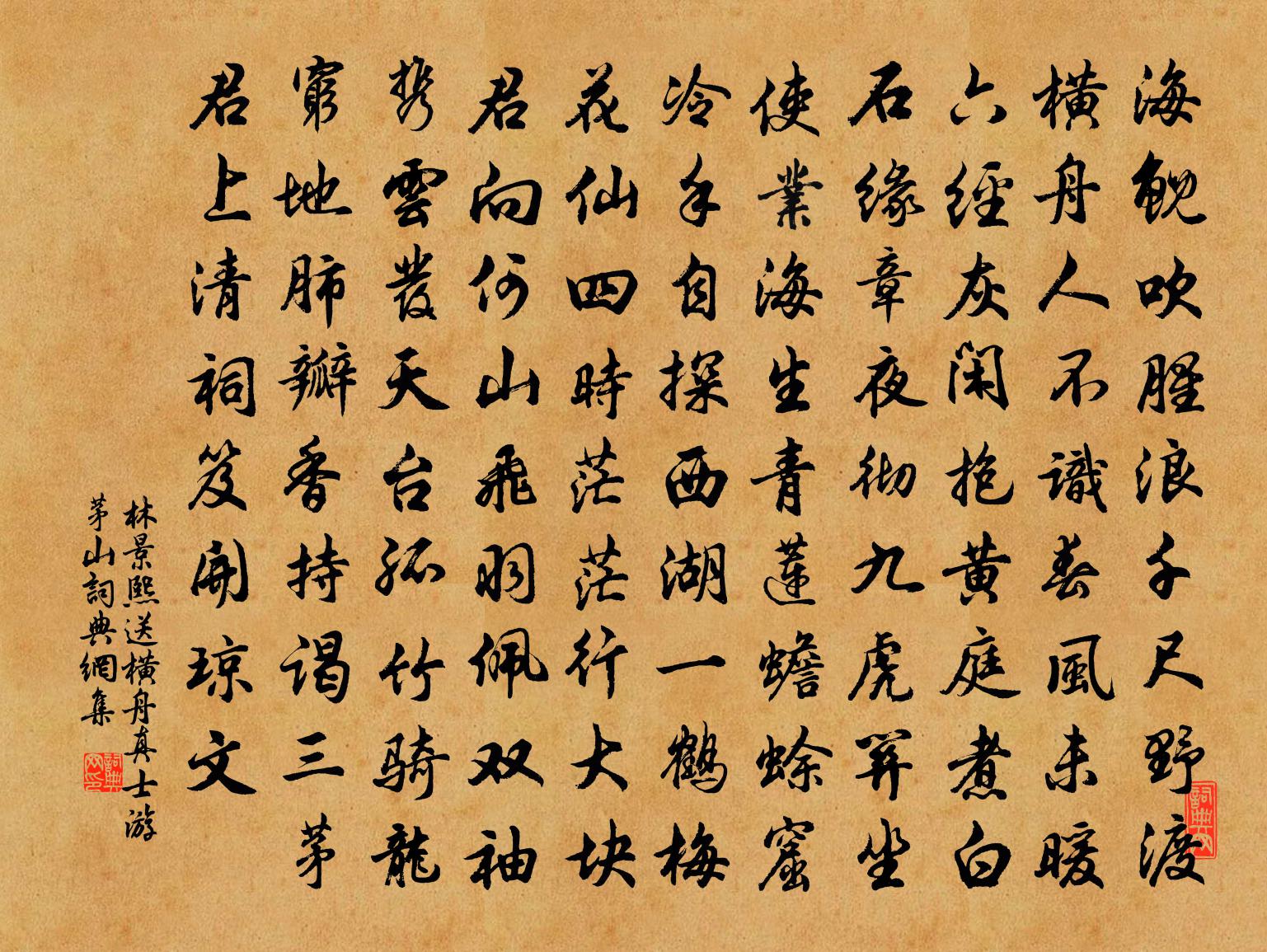 詩詞名句歷史字典書法欣賞書法字典國語詞典說文解字康熙字典古漢語字典標 題 作 者 詩 句 送橫舟真士游茅山作者:林景熙 朝代:宋代送橫舟真士游茅山原文海鯢吹腥浪千尺,野渡橫舟人不識。春風未暖六經灰。閒抱黃庭煮白石。緣章夜徹九虎關,坐使業海生青蓮。蟾蜍窟冷手自探,西湖一鶴梅花仙。四時茫茫行大塊,君向何山飛羽佩。雙袖攜雲發天台,孤竹騎龍窮地肺。瓣香持謁三茅君,上清祠笈開瓊文。詩詞問答問:送橫舟真士游茅山的作者是誰?答:林景熙問:送橫舟真士游茅山寫於哪個朝代?答:宋代林景熙送橫舟真士游茅山書法欣賞送橫舟真士游茅山書法作品詩詞推薦永州守王公慥寄九岩亭記雲此地疑是柳子厚所梅堯臣〔宋代〕天地磨今古,賢愚為埃塵。草樹易變改,山川無故新。眷言零陵守,白髮駕朱輪。間來問遺老,俯跡哀昔人。昔人題春山李基道小園戴復古〔宋代〕瀟灑數椽屋,旋營花竹坡。心寬忘地窄,亭小得山多。共賞春晴好,其如客醉何。棲鸞將遠舉,寧久盼庭柯。菩薩蠻(公時在泉幕,有懷汪彥章而作。以當路多忌,故托玉人以見意)黃公度〔宋代〕高樓目斷南來翼。玉人依舊無訊息。愁緒促眉端。不隨衣頻寬。萋萋天外草。何處春歸早。無語憑欄桿。竹聲生暮夜宴龔宗元〔宋代〕兔魄花侵階夜三刻,蜀錦堆香花院窄。風動花旌玳瑁寒,露垂蟲綱珍珠白。美人匝花羅弦花,綺幄雲屏爐麝暖。只竹溪釋普濟〔宋代〕漱石穿崖落落,隨流截流自瞞。窮到不知源處,風枝雨葉蕭然。醜奴兒/採桑子 和鉛山陳簿韻辛棄疾〔宋代〕鵝湖山下長亭路,明月臨關。明月臨關。幾陣西風落葉乾。新詞誰解裁冰雪,筆墨生寒。筆墨生寒。會說離愁千萬仙岩二首王貞白〔唐代〕白煙晝起丹灶,紅葉秋書篆文。二十四岩天上,一雞啼破晴雲。風呼山鬼服役,月照衡薇結花。江暖客尋瑤草,洞白蘭王鎡〔宋代〕楚客曾因葬水中,骨寒化出玉玲瓏。生時不飲香魂醒,難著春風半點紅。東林寺晚步董嗣杲〔宋代〕天地聚奇觀,山林負隱名。月明僧影瘦,風定水聲清。不覺忘身世,何須問死生。有詩難舉似,真實避時英。種竹吟金朋說〔宋代〕種竹清無俗,虛心耐歲寒。憑窗風日爽。詩酒可盤桓。奉和江沖陶居二十韻汪炎昶〔宋代〕前浮芙蓉翠,後汎石耳雲。君欲竟幽討,絕壁更一捫。記夢陸游〔宋代〕世事紛紛觸眼新,何由常作夢中身。遠遊萬里才移刻,豪飲千場不忤人。鼓吹滿城壼日晚,鶯花如海洞天春。是間欲陰梅堯臣〔宋代〕鸜鵒知天風,鵓鴣知天雨。途路厭塵昏,車馬煩泥沮。陰仍老易覺,體質預辛楚。安坐與壯年,慎勿忘酒脯。謁金門(春雪)韓元吉〔宋代〕春尚淺。誰把玉英裁翦。盡道梅梢開未遍。捲簾花滿院。樓上酒融歌暖。樓下水平煙遠。卻似涌金門外見。絮飛波題載主簿德成盡得樓曾豐〔宋代〕樓與主人俱卓然,主人步更與樓遷。面前加辟山河地,頭上增高日月天。指顧大千俄可度,拊循方寸浩無邊。校讎閔尚衣盜褲梅堯臣〔宋代〕昔聞廉叔度,能使民多褲。多褲非或貪,持新不忘故。嗟嗟亦王官,奚自門閥污。中府中紋綾,袖之呼馬去。左右題杭郡閣鄭獬〔宋代〕雨影橫殘虹,秋容映陰日。寒江帶暮流,曉角穿雲出。峰藏翠如織,宿鳥去無跡。封書寄所懷,聊托金門翼。八景勝概龍門飛瀑方鳳〔宋代〕飛雪濺{左石右含}砑,流雲當面起。邂逅緣毛仙,臨流同洗髓。外舅輓詞范成大〔宋代〕植德千章茂,硎材百鏈剛。事功才止此,物理故難量。鴈序雲天遠,蘭階雨露芳。公無憾身後,人自惜堂堂。周十三丈約同馬三丈入青原山賦詩五首以記行趙蕃〔宋代〕蕭散得終日,驅馳難久居。滅瘢蘇病竹,拋食引潛魚。問話僧尋蜀,多茶椀似盧。主人佛事外,遊戲亦多餘。名句推薦歲夜高堂列明燭,美酒一杯聲一曲。李頎《聽安萬善吹觱篥歌》 我心匪石,不可轉也。佚名《柏舟》 遇酒且呵呵,人生能幾何!韋莊《菩薩蠻·勸君今夜須沈醉》 一寸相思千萬緒。人間沒個安排處。李冠《蝶戀花·春暮》 語之所貴者意也,意有所隨。意之所隨者,不可言傳也。莊子《莊子·外篇·天道》 水墨畫疏窗,孤影淡瀟湘。納蘭性德《木蘭花慢·立秋夜雨送梁汾南行》 寒食後,酒醒卻咨嗟。蘇軾《望江南·超然台作》 譬道之在天下,猶川谷之於江海。老子《老子·道經·第三十二章》 危橋屬幽徑,繚繞穿疏林。柳宗元《巽公院五詠·苦竹橋》 鄉思不堪悲橘柚,旅遊誰肯重王孫。譚用之《秋宿湘江遇雨》