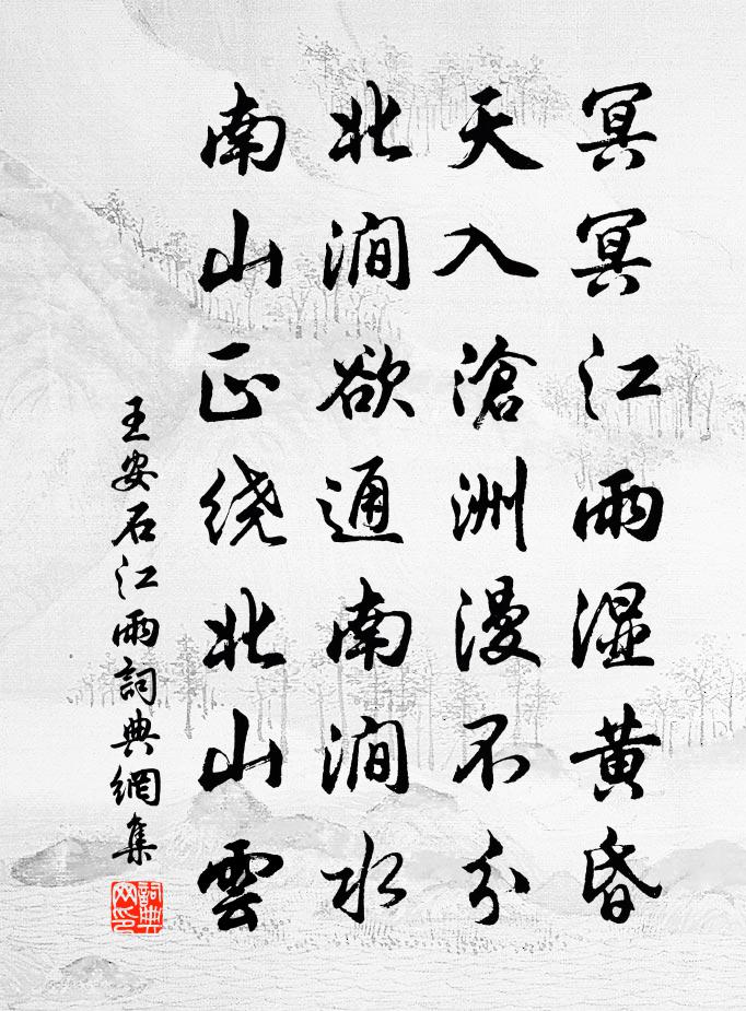 詩詞名句歷史字典書法欣賞書法字典國語詞典說文解字康熙字典古漢語字典標 題 作 者 詩 句 江雨作者:王安石 朝代:宋代江雨原文冥冥江雨濕黃昏,天入滄洲漫不分。北澗欲通南澗水,南山正繞北山雲。詩詞問答問:江雨的作者是誰?答:王安石問:江雨寫於哪個朝代?答:宋代問:王安石的名句有哪些?答:王安石名句大全王安石江雨書法欣賞江雨書法作品詩詞推薦山行舒岳祥〔宋代〕今日新晴好,東風散麥須。山泉中琴瑟,岩鳥合笙竽。總是太平曲,何勞擊壤圖。誰知花濺淚,杜老獨嗟吁。頌古五十三首釋文禮〔宋代〕墮脫知何處,憑君子細看。潮來無別浦,木落見他山。文到羅與之〔宋代〕羽羽涼颸起素波,臨流解帶小婆娑。秋光已共蘆花,夜雨那勝落葉多。不覺儒酸同糾纏,極知妄想盡銷磨。笈中班送王察推縝之鄧州梅堯臣〔宋代〕昔向南陽憶洛陽,秋橙初熟半林黃。車過白水沙痕闊,鴈落鉗盧稻穟長。廢壘漢錍金刻字,古原秦冢石為羊。太平送勛侄之官嵢峽五言五首劉克莊〔宋代〕機難下鷗鳥,察至見淵魚。何日抽回去,商人願出塗。率題司空圖〔唐代〕宦路前銜閒不記,醉鄉佳境興方濃。一林高竹長遮日,四壁寒山更閏冬。郡中上元燈減舊例三之二而又迎送使客七首楊萬里〔宋代〕不是東風巧剪裁,如何春夜碧蓮開?江城寂寞無歌舞,喚得梅花勸一杯。端嘉雜詩二十首劉克莊〔宋代〕勢窮斯變變斯通,局面初更便不同。西北怕他小老子,東南有個太平翁。市中狂吟段穀〔唐代〕一間茅屋,尚自修治。任狂風吹,連檐破碎。科棋斜攲,看著倒也。牆壁作散土一堆,主人翁永不來歸。普天樂·西山夕照徐再思〔元代〕晚雲收,夕陽掛,一川楓葉,兩岸蘆花。鷗鷺棲,牛羊下。萬頃波光天圖畫,水晶宮冷浸紅霞。凝煙暮景,轉暉老偈頌一百零二首釋紹曇〔宋代〕不紹金輪尊貴位,被人打落當門齒。難嚲梁王掘地埋,脫身留得得空棺履。死款供成,臨文不諱。乳竇今朝報不平宿溪館趙汝鐩〔宋代〕投宿溪頭館,途長主僕飢。濕薪難便著,惡米更須篩。風細帆來穩,山高月上遲。客懷正悽惻,漁笛蓼洲吹。示畫者劉克莊〔宋代〕眉宇巑屼鬢禿殘,愧君模寫向冰紈。削瓜古有形相肖,擲果今無眾聚觀。且可夷猶狎鷗鷺,不消夭矯比龍鸞。去為簡杜子昕節邠方岳〔宋代〕買屋湖邊住,湖光入酒卮。向來多說劍,老去只耽詩。時序寬衣帶,年華上鬢絲。肯收湖海氣,了事覺兒痴。田文姜特立〔宋代〕田文養士天下無,撞鐘列鼎傾金珠。入關幾作秦囚拘,當時貴客如橛株。倉皇脫死托小夫,嗟哉所養非所需。薔薇齊己〔唐代〕根本似玫瑰,繁英夾刂外開。香高叢有架,紅落地多苔。去住閒人看,晴明遠蝶來。牡丹先幾日,銷歇向塵埃。徐思遠趙大猷寄梅以詩謝之次韻和大猷王洋〔宋代〕薄團紅帳老生涯,只看新詩勝看花。遙解知君得詩處,竹籬茅舍兩三家。南歌子·倭墮低梳髻溫庭筠〔唐代〕倭墮低梳髻,連娟細掃眉。終日兩相思。為君憔悴盡,百花時。題竹洲徐元傑〔宋代〕人之生也直,此君亦如是。我酷愛此君,臭味相本相似。方其出地初,一種根萌異。剛特儼不回,鈞石莫障蔽。日滿江紅黃機〔宋代〕呀鼓聲中,又妝點、千紅萬綠。春試手,銀花影粲,雪梅香馥。歸夢不知家近遠,飛帆正掛天西北。記年時、歌舞名句推薦白雲一片去悠悠,青楓浦上不勝愁。張若虛《春江花月夜》 白頭太守真愚甚,滿插茱萸望辟邪。宋祁《九日置酒》 窗含西嶺千秋雪,門泊東吳萬里船。杜甫《絕句》 風送梅花過小橋,飄飄。趙顯宏《晝夜樂·冬》 那裡有鬧紅塵香車寶馬?祗不過送黃昏古木寒鴉。王磐《古蟾宮·元宵》 獨自淒涼還自遣,自製離愁。龔自珍《浪淘沙·寫夢》 精衛銜微木,將以填滄海。陶淵明《讀山海經·其十》 鵝湖山下稻粱肥,豚柵雞棲半掩扉。王駕《社日》 銅鑄金鏞振紀綱,聲傳海外播戎羌。曹雪芹《交趾懷古》 知賢之為明,輔賢之謂能,勉之強之,其福必長。荀子《荀子·解蔽》