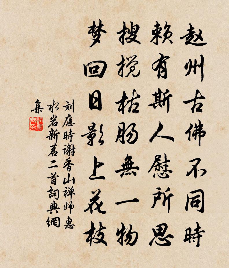 詩詞名句歷史字典書法欣賞書法字典國語詞典說文解字康熙字典古漢語字典標 題 作 者 詩 句 謝香山禪師惠水岩新茗二首作者:劉應時 朝代:宋代謝香山禪師惠水岩新茗二首原文趙州古佛不同時,賴有斯人慰所思。搜攪枯腸無一物,夢回日影上花枝。詩詞問答問:謝香山禪師惠水岩新茗二首的作者是誰?答:劉應時問:謝香山禪師惠水岩新茗二首寫於哪個朝代?答:宋代劉應時謝香山禪師惠水岩新茗二首書法欣賞謝香山禪師惠水岩新茗二首書法作品詩詞推薦挽顧君任粹二首劉克莊〔宋代〕占斷慈恩塔,歸來履道坊。耆英真率社,少尹釣游鄉。子可傳汾曲,甥能述渭陽。如聞無恙日,治塚建祠堂。寄陳仲麟仇遠〔宋代〕檇李城邊送客船,梅花一別又三年。清風朗月思元度,駿馬名姬羨謫仙。湖海倦遊予白髮,園林真樂子青氈。楚生歸來二周歲白居易〔唐代〕歸來二周歲,二歲似須臾。池藕重生葉,林鴉再引雛。時豐實倉廩,春暖葺庖廚。更作一年計,三年身健無?楊高士聽彈琴姚舜陟〔宋代〕我來請雨謁龍公,日腳已斂雲沖融。解衣盤礴暫小憩,清談對此兩相翁。霏霏鋸屑引意靜,爇鼎忽聞彈絲桐。少年挽李梅邊趙必象〔宋代〕貞元朝士盡凋零,一世龍門羨李膺。靖節有時題晉號,德公無意入襄城。床頭點易朱猶濕,几上遺書稿已謄。收拾和張王臣廖行之〔宋代〕詞伯今猶從事衫,追風才軼謝羸驂。浪傳齊己聲江左,不見彌明隱岳南。騷讀正堪供痛飲,箎音那許接高談。君家挽王房州伯洪林表民〔宋代〕崇牙出鎮古邊頭,名與龔黃地一流。方見勒碑歌善政,忽驚罷市哭仁侯。燕飛古巷人千里,梅落寒溪月一樓。前事擬寒山拾得二十首010王安石〔宋代〕昨日見張三,嫌他不守己。歸來自悔責,分別亦非理。今日見張三,分別心復起。若除此惡習,佛法無多子。阮郎歸 寄李都運有之 中州樂府胥鼎〔元代〕人情冷暖共高低。疏慵非所宜。老夫碌碌本無機。閒教造物疑。形木槁,鬢絲垂。山林先有期。故人只道掛冠遲。代張菊毛滂〔宋代〕去年出郭麥風秋,憶共兒童迓細侯。煙雨一溪行色動,管弦千里頌聲留。斷魂南浦橫離恨,注目東山想舊遊。西檻秋近陸游〔宋代〕石榴萱草並成空,又見牆陰莧葉紅。茶釅頗妨千里夢,簟涼初怯五更風。新瓜落刃冰盤裡,晚燕添巢畫閣中。身健句王琪〔宋代〕春風吹孤雲。六月十五日詣水公庵雨作朱熹〔宋代〕雲起欲為雨,中川分晦明。才驚橫嶺斷,已覺疏林鳴。空際旱塵滅,虛堂涼思生。頹檐滴瀝余,忽作流泉傾。況此頌古十九首釋慧暉〔宋代〕一人道不落,一人道不昧。夜來一陣狂風生,浪打石頭如粉碎。瑞鷓鴣(詠桃花菊)史鑄〔宋代〕底事秋英色厭黃。喜行春令借紅妝。謝天分付千年品,特地攙先九日香。陶令駭觀須把酒,崔生瞥見誤成章。蜂情和士特栽果十首石榴劉子翬〔宋代〕庭榴結實墊芳叢,一夜飛霜染茜容。萬子風胞無異質,金房玉隔謾重重。天安殿酌獻天書寇準〔宋代〕聖運昭惟永,高真協降祥。方嚴泰壇祀,先薦釜山章。典禮官無曠,涓辰筮有常。中天華闕秘,象袞睟容莊。宵迥江左謂海棠為川紅吳中復〔宋代〕靚妝濃淡蕊蒙茸,高下池台細細風。卻恨韶華偏蜀土,更無顏色似川紅。尋香只恐三春暮,把酒欣逢一笑同。子美三奠子 離南陽後作元好問〔金代〕悵韶華流轉,無計留連。行樂地,一悽然。笙歌寒食後,桃李惡風前。連環玉,迴文錦,兩 * 。芳塵未遠,幽意浣溪沙(壽潘宰)方岳〔宋代〕夜醉淵明把菊圖。宿酲扶曉又冰壺。秋香留得伴雙鳧。並日滿浮金馨落,明年初賜玉茱萸。更書欲上有除書。名句推薦對菱花、與說相思,看誰瘦損。陸叡《瑞鶴仙·梅》 天不老,情難絕。張先《千秋歲·數聲鶗鴂》 彼竊鉤者誅,竊國者為諸侯,諸侯之門而仁義存焉莊子《莊子·外篇·胠篋》 安得倚天劍,跨海斬長鯨。李白《臨江王節士歌》 所作福德不應貪著。鳩摩羅什譯《金剛經·不受不貪》 藍橋何處覓雲英。只有多情流水、伴人行。蘇軾《南歌子·寓意》 離心何以贈,自有玉壺冰。駱賓王《送別》 臣心一片磁針石,不指南方不肯休。文天祥《揚子江》 西風多少恨,吹不散眉彎。納蘭性德《臨江仙·寒柳》 生無一日之歡,死有萬世之名。列子及其弟子《列子·楊朱》