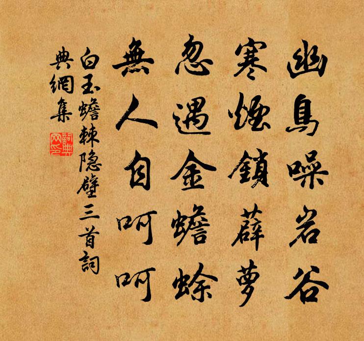 詩詞名句歷史字典書法欣賞書法字典國語詞典說文解字康熙字典古漢語字典標 題 作 者 詩 句 棘隱壁三首作者:白玉蟾 朝代:宋代棘隱壁三首原文幽鳥噪岩谷,寒煙鎖薜蘿。忽遇金蟾蜍,無人自呵呵。詩詞問答問:棘隱壁三首的作者是誰?答:白玉蟾問:棘隱壁三首寫於哪個朝代?答:宋代問:棘隱壁三首是什麼體裁?答:五絕白玉蟾棘隱壁三首書法欣賞棘隱壁三首書法作品詩詞推薦直舍窗前綠樹項安世〔宋代〕綠樹幾年栽,窗應為爾開。陰中無暑到,缺處月風來。長日宜侍寤,黃昏未忍回。今年緣底事,歸思忽難裁。按部至春州周敦頤〔宋代〕按部廣東經數郡,若言嵐瘴更無春。度山煙鎖埋清晝,為國天終護吉人。萬里詔音頻降下,一方恩惠盡均勻。丈夫祈雨愛蔣常請求詩張埴〔宋代〕武夷老子黃弊衣,不能一煦誅虹霓。在家顛倒來說奇,出門有請持此歸。龍川川上搖短藜,攔街拍手而笑之。六月涑水劉克莊〔宋代〕洛下人呼為迂叟,非惟語簡意無窮。曲台不合加美謚,俗了深衣大帶翁。答建士謝旿二首劉克莊〔宋代〕偶有幽人訪,柴門始一開。大顛留偈去,小謝袖詩來。襆被嫌三宿,挑燈讀百回。惟應雙屐齒,歷歷在莓苔。題朝散郎劉公廟王遂〔宋代〕文而博兮樂且有餘,武有勇兮莫之測窺,閩之南兮江之西。俯視鼎鑊兮猶一潢池,士怯且惰兮若奉驕兒。一夫死兮千秋歲(次韻吊高郵秦少游)晁補之〔宋代〕江頭苑外。常記同朝退。飛騎軋,鳴珂碎。齊嘔雲繞扇,趙舞風回帶。嚴鼓斷,杯盤藉草猶相對。灑涕誰能會。醉閒思陸游〔宋代〕睡美精神足,心空忿欲輕。讀書無定課,飲酒不成酲。日日東軒坐,時時北渚行。最奇烏桕下,側帽聽秋鶯。歸馬華山白行簡〔唐代〕牧野功成後,周王戰馬閒。驅馳休伏皂,飲齕任依山。逐日朝仍去,隨風暮自還。冰生疑隴坂,葉落似榆關。躞蹀滿江紅慢姬翼〔元代〕一片頑心,何樓子、無窮生滅。被化機、般弄馳騁,許多顛*。販骨如山成底事, * 似海難超越。痛亘初、靈物燕燕佚名〔先秦〕燕燕于飛,差池其羽。之子于歸,遠送於野。瞻望弗及,泣涕如雨。燕燕于飛,頡之頏之。之子于歸,遠於將之。偈頌八十五首釋妙倫〔宋代〕金佛不度爐,道士念蘇{左口右盧}。木佛不度火,嵩山打灶墮。泥佛不度水,鍾馗嚇小鬼。真佛屋裡坐,嗄,趙提舉京城四壁守御劉公靖康小雅〔宋代〕有赫劉公,心在王室。氣吞強敵,忠貫日月。九鼎既淪,四溟盪潏。公如山嶽,萬仞屹屹。富貴莫誘,威武莫屈。子夜變歌三首陸龜蒙〔唐代〕人傳歡負情,我自未嘗見。三更開門去,始知子夜變。歲月如流邁,春盡秋已至。熒熒條上花,零落何乃駛。歲月程待制以黃居寀蘆鷺易燕穆之雪滿群山圖次韻洪皓〔宋代〕雪滿群山是甚清,燕化乘興繪如情。通靈妙絕徒誇誕,真跡曾傳可辨明。御府多藏亡足惜,邊庭罕見嘆邊聲。天教順風至岳州危甚項安世〔宋代〕黑雲將雨向巴邱,白浪奔雷送客舟。一路逆風才得順,百年何日是無愁。神林浦外飛沙惡,道士磯頭亂石稠。系纜題汪水雲詩卷趙雲〔宋代〕江南江北馬如飛,曾著金門羽客衣。李泌暫游衡岳去,陳摶已請華山歸。風雲萬里氣無敵,雨露兩朝恩有輝。偶爾贈祖三詠(濟州官舍作)王維〔唐代〕蕭蛸掛虛牖,蟋蟀鳴前除。歲晏涼風至,君子復何如。高館闃無人,離居不可道。閒門寂已閉,落日照秋草。雖有十二月二十七日大雪中過吉水小盤渡西歸三首楊萬里〔宋代〕風卷寒江浪濕天,斜吹亂雪忽平船。碧琉璃上瓊花里,獨載詩人孟浩然。鷓鴣天元好問〔金代〕八月蘆溝風路清。短衣孤劍此飄零。蒼龍雙關平生恨,只有西山滿意青。塵擾擾,雁冥冥。因君南望涌金亭。還家名句推薦兵戈既未息,兒童盡東征。杜甫《羌村三首·其三》 萬物靜觀皆自得,四時佳興與人同。程顥《秋日》 雖慚老圃秋容淡,且看黃花晚節香。韓琦《九日水閣》 去年燕子天涯,今年燕子誰家?張炎《清平樂·采芳人杳》 杏花時節雨紛紛。山繞孤村。水繞孤村。劉仙倫《一剪梅·唱到陽關第四聲》 細雨春蕪上林苑,頹垣夜月洛陽宮。陸游《書憤五首·其二》 古戍蒼蒼烽火寒,大荒沈沈飛雪白。李頎《聽董大彈胡笳聲兼寄語弄房給事》 絕代有佳人,幽居在空谷。杜甫《佳人》 蜂兒不解知人苦,燕兒不解說人愁。程垓《最高樓·舊時心事》 為問山翁何事,坐看流年輕度,拚卻鬢雙華。葉夢得《水調歌頭·秋色漸將晚》