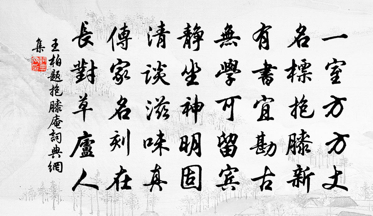 詩詞名句歷史字典書法欣賞書法字典國語詞典說文解字康熙字典古漢語字典標 題 作 者 詩 句 題抱膝庵作者:王柏 朝代:宋代題抱膝庵原文一室方方丈,名標抱膝新。有書宜勘古,無學可留賓。靜坐神明固,清談滋味真。傳家名刻在,長對草廬人。詩詞問答問:題抱膝庵的作者是誰?答:王柏問:題抱膝庵寫於哪個朝代?答:宋代王柏題抱膝庵書法欣賞題抱膝庵書法作品詩詞推薦次韻高安撫雄楚樓餞別項安世〔宋代〕醉擘鳥絲寫玉欄,坐分鸞{左月右榷去木}膾龍肝。已知全楚風流在,更覺將軍禮數寬。一日樓成供燕餞,明朝岸二游詩徐詩皮日休〔唐代〕東莞為著姓,奕代皆雋哲。強學取科第,名聲盡孤揭。自為方州來,清操稱凜冽。唯寫墳籍多,必雲清俸絕。宣毫觀蔬圃陸游〔宋代〕松芥可葅芹可羹,晚風咿*桔槔聲。白頭孤宦成何味,悔不畦蔬過此生。庚午蛾眉亭張埴〔宋代〕月明宮袍窅窅,新沙釣艇浟浟。犀口不能一語,蛾眉只管千愁。集賢書院成,送張說上集賢學士,賜宴得珍字李隆基〔唐代〕廣學開書院,崇儒引席珍。集賢招袞職,論道命台臣。禮樂沿今古,文章革舊新。獻酬尊俎列,賓主位班陳。節變西江月(縣圃小酌)毛滂〔宋代〕煙雨半藏楊柳,風光初到桃花。玉人細細酌流霞。醉里將春留下。柳畔鴛鴦作伴,花邊蝴蝶為家。醉翁醉里也隨他寄賦慈谿沈氏愛菊序陳著〔宋代〕我不識愛菊,卻與菊相識。寒前後著花,土中央為色。微苦養長壽,晚香擅清德。滔滔彼世人,方為桃李役。觀飲王令〔宋代〕不飲雖然合眾難,何妨眾客自盤桓。已看手足互顛倒,更聽人人自謂歡。青漢謠曹勛〔宋代〕鼓策飛晨華,翹轡玄景阿。雲裾動星漢,流彩鳴玉珂。苕苕拂青靄,俛仰窺員羅。群真儼龍駕,拊節揚空歌。靈風桂隱紀詠粲金亭張鎡〔宋代〕柘彈黃金子,誰將滿樹裝。珍禽來往慣,風落不驚忙。偈頌八十七首釋慧開〔宋代〕布袋頭開今日始,滿目江山秋色里。驀然踏斷草鞋跟,元來卻是自家底。詠雪佚名〔唐代〕天山飛雪度,言是落花朝。惜哉不我與,蕭索從風飄。鮮潔凌紈素,紛糅下枝條。良時竟何在,坐見容華銷。送大谷高少府耿湋〔唐代〕縣屬并州北近胡,悠悠此別宦仍孤。應知史筆思循吏,莫料轅門笑魯儒。古塞草青宜牧馬,春城月暗好啼烏。雕殘芙蓉池作曹丕〔魏晉〕乘輦夜行游,逍遙步西園。雙渠相溉灌,嘉木繞通川。卑枝拂羽蓋,修條摩蒼天。驚風扶輪轂,飛鳥翔我前。丹霞中秋前二夕釣雪舟中靜坐二首楊萬里〔宋代〕去歲中秋政病餘,愛他月色強支吾。今年老矣差無病,後夜中秋有月無?九月初吉永嘉蘇太古同游金華洞夜宿鹿田寺用金履祥〔宋代〕攜手登山處,山高風露寒。共來岩壑里,別去海雲端。意重言難足,更深語未闌。相期最高處,志見兩俱安。既過曾居因訪劉茂實秀才是日明叔同出恨仲威趙蕃〔宋代〕官身肯聽俗,人事直強親。開窗對修竹,筆墨得具陳。俗子有時來,揮去防怒嗔。相看久不厭,陳子清且真。昨宵廷邁留少城和初入西龍道院詩來用韻答之洪咨夔〔宋代〕雪錦樓高眼易寒,春風朵朵似長安。終年避事寧為客,到處尋詩勝覓官。金鑿落邊檛蹀躞,玉參差裹舞蹣跚。華燈念奴嬌(寄仙岩辛承旨)蔡楠〔宋代〕碧梧轉影,正露冷天高,涼生襟袖。此夕清輝,誰信道、夜色居然如晝。玉斧重修,寶奩初啟,萬里寒光透。將軍同諸客嘲雪中馬上妓白居易〔唐代〕珊瑚鞭嚲馬踟躕,引手低蛾索一盂。腰為逆風成弱柳,面因沖冷作凝酥。銀篦穩篸烏羅帽,花襜宜乘叱撥駒。雪裡名句推薦息徒蘭圃,秣馬華山。嵇康《贈秀才入軍·其十四》 掩柴扉,謝他梅竹伴我冷書齋。沈自晉《玉芙蓉·雨窗小詠》 學之染人,甚於丹青。房玄齡《晉書·列傳·第五十二章》 九萬里風鵬正舉。李清照《漁家傲·天接雲濤連曉霧》 相思只在夢魂中。今宵月,偏照小樓東。何大圭《小重山·綠樹鶯啼春正濃》 零落江南不自由。兩綢繆。料得吟鸞夜夜愁。姜夔《憶王孫·番陽彭氏小樓作》 里仁為美,擇不處仁,焉得知?孔子弟子《論語·里仁篇》 想邊鴻孤唳,砌蛩私語。王沂孫《掃花游·秋聲》 假令風歇時下來,猶能簸卻滄溟水李白《上李邕》 公子南橋應盡興,將軍西第幾留賓。杜審言《春日京中有懷》