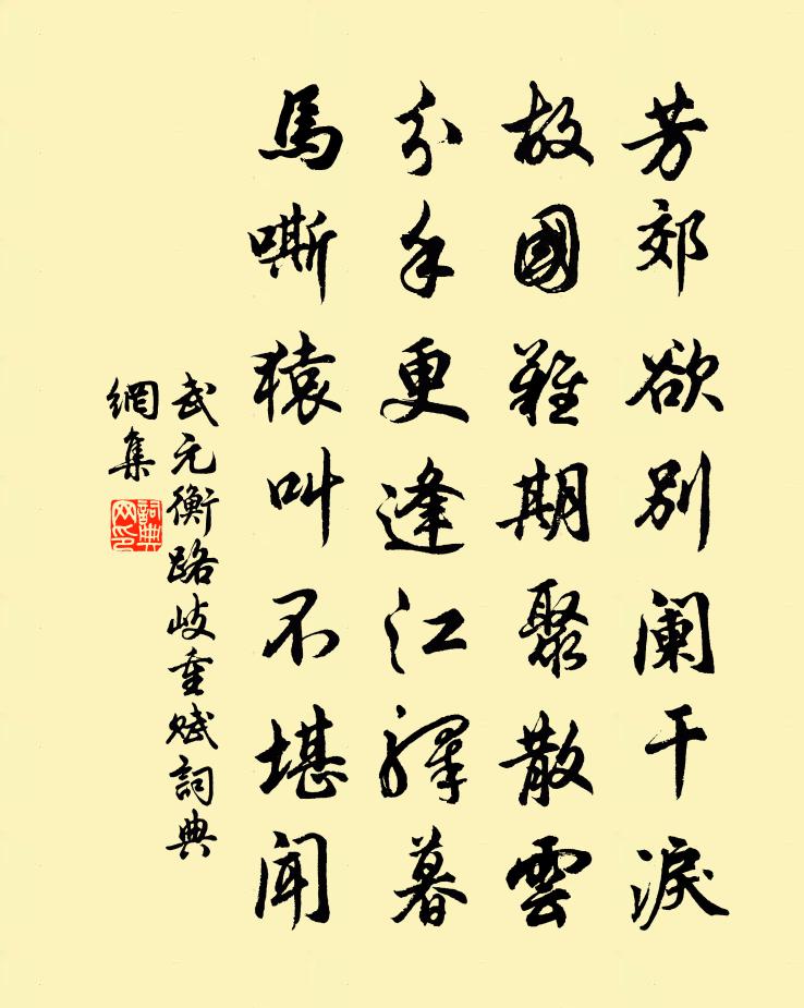 詩詞名句歷史字典書法欣賞書法字典國語詞典說文解字康熙字典古漢語字典標 題 作 者 詩 句 路岐重賦作者:武元衡 朝代:唐代路岐重賦原文芳郊欲別闌乾淚,故國難期聚散雲。分手更逢江驛暮,馬嘶猿叫不堪聞。詩詞問答問:路岐重賦的作者是誰?答:武元衡問:路岐重賦寫於哪個朝代?答:唐代問:路岐重賦是什麼體裁?答:七絕武元衡路岐重賦書法欣賞路岐重賦書法作品注釋全唐詩:卷317-60詩詞推薦牛渚王安石〔宋代〕歷陽之南有牛渚,一風微吹萬舟阻。華戎蠻蜀古百川,合為大江神所躔。山盤水怒不得泄,到此乃有無窮淵。朱衣答朋上人釋紹嵩〔宋代〕爭渡行人簇晚沙,歸舟天際暮雲遮。波生野水雁初下,竹映寒原日已斜。剩欲出門追笑語,可堪垂白各天涯。知公漁陽杜甫〔唐代〕漁陽突騎猶精銳,赫赫雍王都節制。猛將飄然恐後時,本朝不入非高計。祿山北築雄武城,舊防敗走歸其營。系書懷新亭四首張嵲〔宋代〕遠意在田疇,中園結茅屋。凍雨昨夜來,共欣春水足。宮詞宋白〔宋代〕便路橫穿玉兔門,夜宣狎客讌罇。江郎才俊思華別,賜坐從容索繡墩。頌十玄談轉位釋印肅〔宋代〕金鎖玄關留不住,穿雲透石充寰宇。四時不語信寥寥,萬劫超然希伴侶。送許耀卿監丞同年赴靜江倅四絕范成大〔宋代〕官塗真有上竿魚,玉筍翻乘別駕車。聞道留行有公論,從今日日看除書。和僧長吉湖居五題其一湖山范仲淹〔宋代〕湖山滿清氣,賞心甲吳越。晴嵐起片雲,晚水連初月。漁父得意歸,歌詩等閒發。送李大著赴闕項安世〔宋代〕玉觀金橋無限時,楚臣漢女不勝悲。如今蕩蕩平平矣,卻合融融洩洩之。八陛加恩須大冊,三朝修史待宏規。回頭浪淘沙佚名〔宋代〕簾外五更風。吹夢無蹤。畫樓重上與誰同。記得玉釵斜撥火,寶篆成空。回首紫金峰。雨潤煙濃。一江春浪醉醒中上巳溪上燕二首陳造〔宋代〕杜若洲邊卓旆旌,佳晨一醉萬金輕。春光僅有一分在,天氣可能三日晴。解道蘭亭亦陳跡,肯吟楚些愴幽情。人生送僧歸護國寺李維〔宋代〕香剎隱霞標,齋房見落潮。歸思海眾繞,來應輔臣招。倚策吟雲合,乘杯咒浪銷。曹溪久得法,遊戲自逍遙。漢宮春(次韻稼軒蓬萊閣)姜夔〔宋代〕一顧傾吳。薴蘿人不見,煙杳重湖。當時事如對弈,此亦天乎。大夫仙去,笑人間、千古須臾。有倦客、扁舟夜泛端午帖子太上皇后閣周必大〔宋代〕檻有榴花沼有蓮,瑤池歡宴晚涼天。一年一度為重午,此去應須過萬年。與杜光庭張令問〔唐代〕試問朝中為宰相,何如林下作神仙。一壺美酒一爐藥,飽聽松風白晝眠。集虛書院仇遠〔宋代〕築室東臯野水濱,室中生白坐生春。了知空洞元無物,須信清明自有神。幽徑草花聊適趣,閒窗筆硯不留塵。酒經夢保母如兒時姚勉〔宋代〕憶昔兒時衣百花,阿母扶我上戲車。兩歲讀書未離乳,書罷尋乳猶歸家。年方十三失阿保,弱冠慈母仙去早。只今句諶祜〔宋代〕此情消遣終難去,無路追尋豈是愚。挽袁潔齋侍郎三首劉宰〔宋代〕講學元無倦,繙書老更勤。能令神氣王,直互死生分。玉折經綸具,星垂翰墨勛。淒其知已地,灑淚濕寒雲。杜鵑二首易士達〔宋代〕一自連雲棧道開,杜鵑啼血濺莓苔。不如歸去無人聽,幾個朝衣出蜀來。名句推薦長者梢,深者底。宋濂、王褘《元史·列傳·卷二》 見說新愁,如今也到鷗邊張炎《高陽台·西湖春感》 舟覆乃見善游,馬奔乃見良御。劉安及其門客《淮南子·說林訓》 暮雨相呼失,寒塘欲下遲。崔塗《孤雁二首·其二》 無一語,對芳尊。安排腸斷到黃昏。秦觀《鷓鴣天·枝上流鶯和淚聞》 朝來嗔寂寞,不肯試新衣。馮夢龍《喻世明言·卷一》 明日相思莫上樓,樓上多風雨。游次公《卜運算元·風雨送人來》 但責己,不責人,此遠怨之道也王永彬《圍爐夜話·第八五則》 見碧水丹山,黃蘆苦竹。宋江《滿江紅·喜遇重陽》 謂誰朝來不作意,狂風挽斷最長條。杜甫《絕句漫興九首·其一》