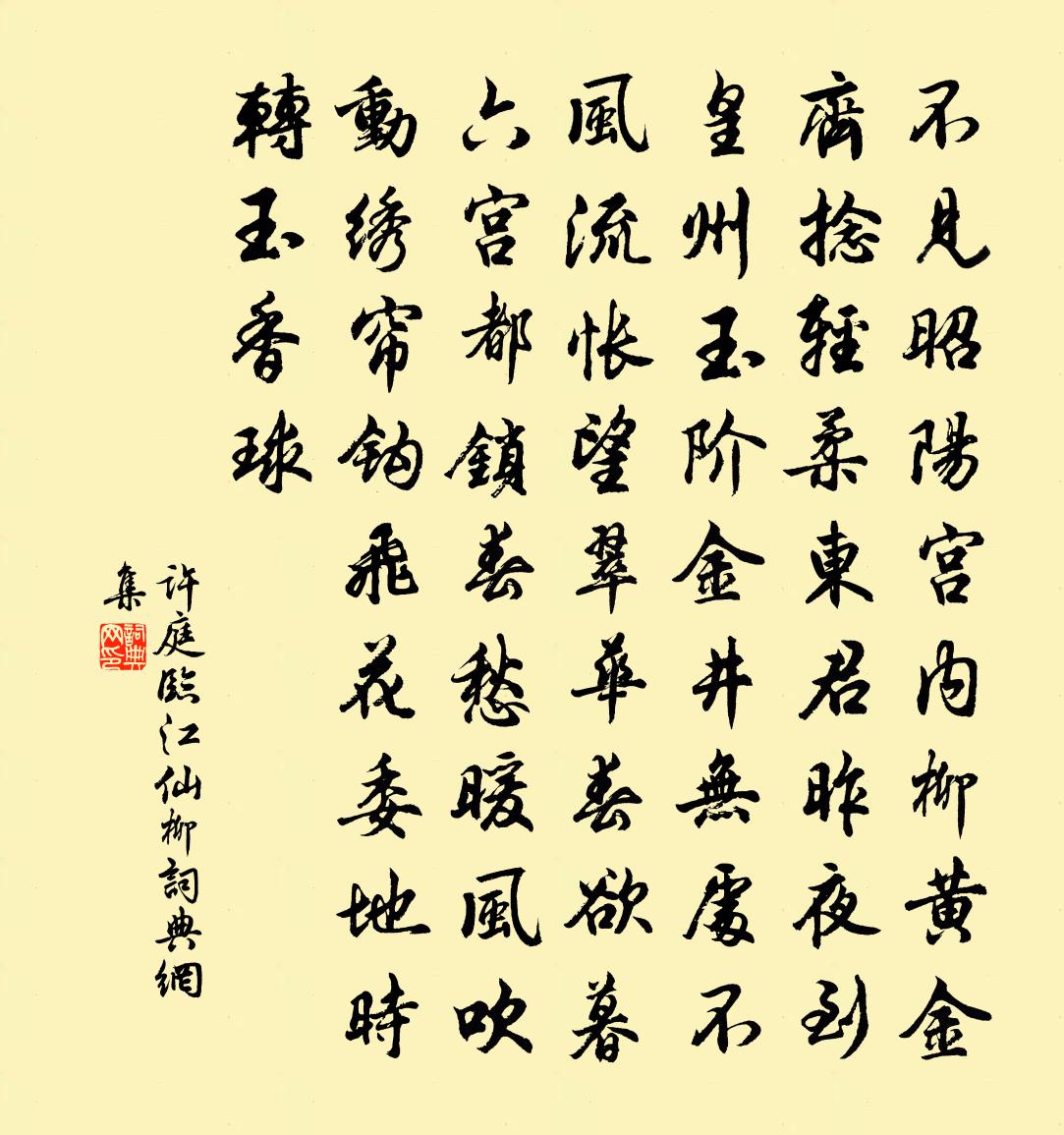 詩詞名句歷史字典書法欣賞書法字典國語詞典說文解字康熙字典古漢語字典標 題 作 者 詩 句 臨江仙(柳)作者:許庭 朝代:宋代臨江仙(柳)原文不見昭陽宮內柳,黃金齊捻輕柔。東君昨夜到皇州。玉階金井,無處不風流。悵望翠華春欲暮,六宮都鎖春愁。暖風吹動繡簾鉤。飛花委地,時轉玉香球。詩詞問答問:臨江仙(柳)的作者是誰?答:許庭問:臨江仙(柳)寫於哪個朝代?答:宋代許庭臨江仙(柳)書法欣賞臨江仙(柳)書法作品詩詞推薦滿庭芳佚名〔宋代〕梅子成陰,海棠初謝,小園才過清明。百花掃地,紅紫踐為塵。別有煙紅露綠,嫣然笑、管領東君。還知否,天香寒食有感曹勛〔宋代〕輦下相知把酒稀,更逢寒食淚沾衣。五漿道路何嘗饋,三徑荒蕪未得歸。春事沉沈寒慘慘,暮煙漠漠雨微微。杏花思故園張嵲〔宋代〕柳外高風盡日吹,春來不省見花枝。漢傍野墅三株杏,記得飄零似雪時。賦芷鄧深〔宋代〕縹裁衣袂紫中單,觸眼亭亭露未乾。態度全然逼然蕙,馨香的不讓春蘭。數枝瀟灑北窗晝,一室清幽六月寒。了不夜宿武夷宮彥修〔宋代〕巢松老鶴鳴丹井,籠月梅花搖素影。竹敲白露幔亭寒,吟弄紫簫山月冷。山月簫聲清且幽,幔亭不見昔人游。我來隆興書堂自警三十五首陳淳〔宋代〕器局事宏大,心期勿卑汙。俗士不必效,汝為君子儒。時中良弼茂元慎儀集水閣劉子翬〔宋代〕水色兼山影,漂搖小閣西。風來幽囀活,雨過萬紅低。炯炯杯中趣,喧喧枕裹學。新年一聲笑,四友在潭溪。禪人並化主寫真求贊釋正覺〔宋代〕淨而純中無一塵,純而淨中有萬應。眼睛明,鼻孔正。更將折筋攪滄溟,令彼龍魚知水為命。書湖陰先生壁二首王安石〔宋代〕茅檐長掃靜無苔,花木成畦手自栽。一水護田將綠繞,兩山排闥送青來。三月三日度日際程珌〔宋代〕日望黃尖杪,今登白際巔。千山皆委地,一臂獨擎天。春雪韓愈〔唐代〕新年都未有芳華,二月初驚見草芽。白雪卻嫌春色晚,故穿庭樹作飛花。雙調望江南(壽王秋水)劉辰翁〔宋代〕齊眉舉,彩侍紫霞卮。天上九朝鳧冉冉,尊前一笑玉差差。人唱自家詞。籬下菊,醉把一枝枝。花水乞君三十斛,王彥謨輓詩虞儔〔宋代〕潤屋金千鋝,浮生黍一炊。里閭思長者,門戶托佳兒。華表終來鶴,支床尚有龜。洗心元悟易,杯水漫勞持。減字木蘭花黃庭堅〔宋代〕舞鬟娟好。白髮黃花帽。醉任旁觀嘲潦倒。扶老偏宜年小。舞回臉玉胸酥。纏頭一斛明珠。日日梁州薄媚,年年金對雪和子厚弟四首王之道〔宋代〕青腰夜種玉,不見稠與稀。將軍欲何往,滹沱正流澌。軟火燒黃精,我爾寧苦飢。行行復行行,舌在請勿疑。和學士秋懷一十五首李彌遜〔宋代〕厚顏衰暑未甘衰,秋事於人卻有期。怯雨垂蕉全披靡,受風疏葦強扶持。望嶧山呂定〔宋代〕極目東山秀色濃,紫霄千葉醉芙蓉。題詩尚記仙人洞,飛佩曾過玉女峰。樹老孤桐秋露下,碑殘古篆暮雲封。何時偈傾一百六十九首釋智朋〔宋代〕老僧軒前 * 花,不可勝數如恆沙。誰在畫樓沽酒處,相邀來吃趙州茶。浣溪沙歐陽修〔宋代〕雲曳香綿彩柱高。絳旗風颭出花梢。一梭紅帶往來拋。束素美人羞不打,卻嫌裙慢褪纖腰。日斜深院影空搖。宿開元寺樓(一作宿開元寺西樓聞歌感賦)許渾〔唐代〕誰家歌裊裊,孤枕在西樓。竹色寒清簟,松香染翠幬。月移珠殿曉,風遞玉箏秋。日出應移棹,三湘萬里愁。名句推薦人以自是,反以相誹。呂不韋《呂氏春秋·覽·慎大覽》 風塵荏苒音書絕,關塞蕭條行路難。杜甫《宿府》 聞道長安燈夜好,雕輪寶馬如雲。毛滂《臨江仙·都城元夕》 曉風不散愁千點,宿雨還添淚一痕。曹雪芹《詠白海棠》 微陽下喬木,遠色隱秋山。馬戴《落日悵望》 試問閒愁都幾許?賀鑄《青玉案·凌波不過橫塘路》 漫江碧透,百舸爭流。 * 《沁園春·長沙》 君子以成德為行,日可見之行也。佚名《易傳·文言傳·乾文言》 斜倚畫闌嬌不語,暗移梅影過紅橋,裙帶北風飄。納蘭性德《望江南·詠弦月》 專一則勝,離散則敗。尉繚《尉繚子·兵令上》