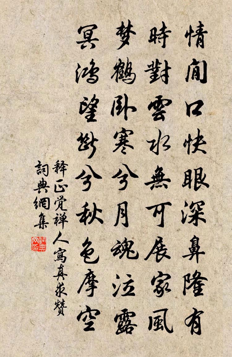 詩詞名句歷史字典書法欣賞書法字典國語詞典說文解字康熙字典古漢語字典標 題 作 者 詩 句 禪人寫真求贊作者:釋正覺 朝代:宋代禪人寫真求贊原文情閒口快,眼深鼻隆。有時對雲水,無可展家風。夢鶴臥寒兮月魂泣露,冥鴻望斷兮秋色摩空。詩詞問答問:禪人寫真求贊的作者是誰?答:釋正覺問:禪人寫真求贊寫於哪個朝代?答:宋代釋正覺禪人寫真求贊書法欣賞禪人寫真求贊書法作品詩詞推薦臨高台沈佺期〔唐代〕高台臨廣陌,車馬紛相續。回首思舊鄉,雲山亂心曲。遠望河流緩,周看原野綠。向夕林鳥還,憂來飛景促。奉送丞相訥齋程先生二首程洙〔宋代〕先生富貴本無心,冰節從來照士林。三載調元名愈重,七章告老意何深。九重屢挽音形玉,一念觀回歸散金。此是贈李將軍溫庭筠〔唐代〕誰言荀羨愛功勳,年少登壇眾所聞。曾以能書稱內史,又因明易號將軍。金溝故事春長在,玉軸遺文火半焚。不學元日二首馮時行〔宋代〕穀旦休祥見,元朝氛祲開。日車扶曉出,斗柄斡春回。致理歸廓廟,私憂尚草萊。太平豈無象,天意是胚胎。集英殿立侍觀進士唱名六首張鎡〔宋代〕早放天扉一刻開,更聲初斷雨聲催。不因變化魚龍日,焉有風雲轉首來。答並安江師送米洪邁〔宋代〕不見道人久,天涯歲雲除。朝來食指動,忽接送米書。念師折腳鐺,五合未省余。中野外覆餗禍,尚有乞食逋。雲浣溪沙(堂前岩桂犯雪開數枝,色如杏黃,適當老妻生朝,作此以侑觴)向子諲〔宋代〕瑞氣氤氳拂水來。金幢玉節下瑤台。江梅岩桂一時開。不盡秋香凝燕寢,無邊春色入尊罍。臨風嗅蕊共裴回。苕溪行葉茵〔宋代〕吳松江頭田舍翁,年年苕溪搖飛篷。沿溪楊柳舊相識,問翁何事猶西東。心欲無言淚如洗,松楸正在西山裹。餘生眼兒媚汪元量〔宋代〕記得年時賞荼蘼。蝴蝶滿園飛。一雙寶馬,兩行簫管,月下扶歸。而今寂寞人何處,脈脈淚沾衣。空房獨守,風穿晚春二首二晁補之〔宋代〕春歸風雨一朝盡,畫靜園林諸趣嘉。蜻蜓出水群掠蚋,鵯鵊衛巢雙趁鴉。浣溪沙(蘭)楊 * 〔宋代〕一徑栽培九畹成。叢生幽谷兔欹傾。異芳止合在林亭。馥郁國香難可擬,紛紜俗眼不須驚。好風披拂雨初晴。過金壇遇劉宰區仕衡〔宋代〕故人逢傲吏,問驛下西關。制錦誰能似,鳴琴爾自閒。京江三國地,斗野五州山。去矣繁霜鬢,煙波照白綸。宿王闢宅與魏野洎用晦上人因成聯句王專〔宋代〕詩見本書魏野一○。宿王闢宅與魏野洎用晦上人因成聯句送奚宰二首陸埈〔宋代〕失學兒俱懶,師資點化開。砭針瘳痼疾,膏馥起枯荄。授□方知緒,從游奈溯洄。武城門下士,應許廁澹臺。豳州文同〔宋代〕昔年戎馬盡南豳,今日風光已太文。雅吹夜喧金府月,靚妝春艷玉峰雲。泉亭柳色濃將滴,水寨荷香遠更薰。邏候賀高中書兼崇政殿說書三首岳珂〔宋代〕谹通三府,高名動四聰。鳳池仍舊渥,虎觀冊新功。晝日槐方翠,秋風棗已紅。直須先抗議。莫待人云中。夜坐因觀楊伯虎和春字韻詩偶成五絕再寄張鎡〔宋代〕宦情儂自本來無,君亦琳宮暫逸居。西華武夷俱絕勝,可教詩卷此時疎。送裴判官自賊中再歸河陽幕府岑參〔唐代〕東郊未解圍,忠義似君稀。誤落胡塵里,能持漢節歸。捲簾山對酒,上馬雪沾衣。卻向嫖姚幕,翩翩去若飛。移丹陽郡先游茅山作范仲淹〔宋代〕丹陽太守意何如,先謁茅卿始下車。展節事君三黜後,收心奉道五旬初。偶尋靈草逢芝圃,欲叩真關借玉書。不更見梅方蒙仲〔宋代〕平生空四海,紅紫委如塵。梅處生新敬,寧非具限人。名句推薦轅門菊酒生豪興,雁塞風雲愜壯遊。王瓊《九日登花馬池城》 墜粉飄香,日日喚愁生。盧祖皋《江城子·畫樓簾暮卷新晴》 夢繞神州路。張元乾《賀新郎·送胡邦衡待制赴新州》 君子遺人以財,不若善言。佚名《孔子家語·六本》 世間無限丹青手,一片傷心畫不成。高蟾《金陵晚望》 鼙鼓動時雷隱隱,獸頭凌處雪微微。盧肇《競渡詩 / 及第後江寧觀競渡寄袁州剌史成應元》 岸雨過城頭,黃鸝上戍樓。岑參《武威春暮聞宇文判官西使還已到晉昌》 遼東小婦年十五,慣彈琵琶解歌舞。李頎《古意》 凡道字,重且舒。勿急疾,勿模糊。李毓秀《弟子規·信》 山下孤煙遠村,天邊獨樹高原。王維《田園樂七首·其五》