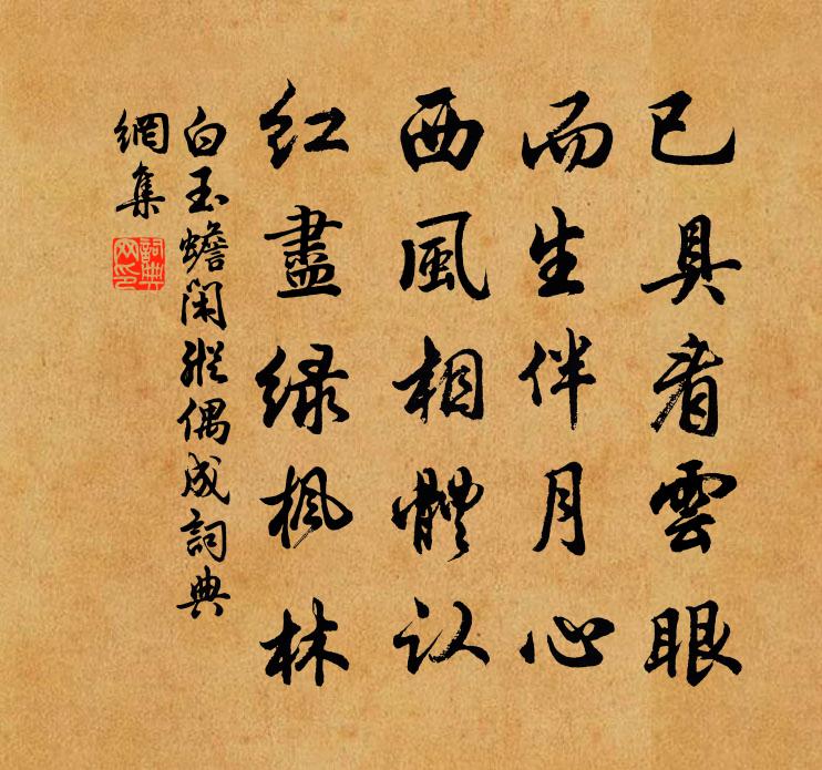 詩詞名句歷史字典書法欣賞書法字典國語詞典說文解字康熙字典古漢語字典標 題 作 者 詩 句 閒縱偶成作者:白玉蟾 朝代:宋代閒縱偶成原文已具看雲眼,而生伴月心。西風相體認,紅盡綠楓林。詩詞問答問:閒縱偶成的作者是誰?答:白玉蟾問:閒縱偶成寫於哪個朝代?答:宋代問:閒縱偶成是什麼體裁?答:五絕白玉蟾閒縱偶成書法欣賞閒縱偶成書法作品詩詞推薦聞劉凝遠丈病已欣然成詩並懷伯瑞仲文叔驥二趙蕃〔宋代〕我行過苕水,公疾臥漳濱。底處書傳雁,如聞藥有神。作詩應更老,比舊想增貧。坐與江山隔,何緣杖履頻。陪閻安撫觀開漕河項安世〔宋代〕為民行水不妨農,為國憂民不費公。肯趁好天招惡客,能於舊貫立新功。山頭石埭千年計,海上靈查八月通,只恐聞福昌院春日一川花卉最盛蔡襄〔宋代〕山前溪上最宜春,千樹夭桃一雨新。爭得扁舟隨水去,亂花深處問秦人。遣興二首趙蕃〔宋代〕西風何從來,驚我庭下綠。竹君了不知,儼立若帶束。山居陋無友,弔影唯吾仆。得此助婆娑,寧能嘆幽獨。偈傾一百六十九首釋智朋〔宋代〕心月孤圓,光吞萬像,起模畫樣。光非照境,境亦非存,收拾不上,光境俱亡。採蓮女黃庚〔宋代〕越女蘭舟 * 漪,採蓮花露濕紅衣。萬荷影裹歌聲過,驚起鴛鴦貼水飛。田不伐遺披雲圖吳則禮〔宋代〕田郎具眼人,會遣披雲嘯。翱也未絕參,儼公初不笑。聊須論翰墨,寧數金粟妙。全體已見前,大是頂門竊。書堂王安石〔宋代〕烏石岡頭上冢歸,柘岡西畔下書帷。辛夷花發白如雪,萬國春風慶曆時。戲書陸游〔宋代〕柳下人家枳作籬,小姑不畫入時眉。緯車聲出窗扉里,正是新涼夜永時。聞曾幼度近況於陳擇之作二詩覓使寄之趙蕃〔宋代〕自辱緘書報,於今歲有秋。飄流聞客語,訊息解人憂。薦牘新頻上,詩聲舊得優。君歸定蓬閣,我去復炎州。五游詠曹植〔魏晉〕九州不足步。願得凌雲翔。逍遙八紘外。游目歷遐荒。披我丹霞衣。襲我素霓裳。華蓋芬晻藹。六龍仰天驤。曜靈題李易安書琵琶行宋濂〔明代〕佳人薄命紛無數,豈獨潯陽老商婦。青衫司馬太多情,一曲琵琶淚如雨。此身已失將怨誰?世間哀樂長相隨。易安送尚老之江西王之道〔宋代〕道人野鶴姿,昂昂在雞群。誰能戀場粟,俯仰勞骸筋。飄然欲何之,駐目西山雲。西山甲南昌,雄勝天下聞。翠岩相和歌辭。決絕詞三首元稹〔唐代〕乍可為天上牽牛織女星,不願為庭前紅槿枝。七月七日一相見,故心終不移。那能朝開暮飛去,一任東西南北吹。御街行(賜衣襖子)王安中〔宋代〕清霜飛入蓬萊殿。別進雲裘軟。卻回宸慮念多寒,詔語日邊親遣。冰蠶綿厚,金雕錦好,永夜縫宮線。紅旌絳旆迎八礪三首鄭思肖〔宋代〕生得貞心鐵石堅,肯將識見與時遷。淚如江水流成海,恨似山峰插入天。慷慨歌聲聞屋外,婆娑劍影落燈前,篇篇送茹屯田知無為軍司馬光〔宋代〕疊鼓鳴鐃迎候新,軍牙孑孑倚淮津。聊應衣繡過鄉曲,不作引章驚故人。荻迸短芽淝水暖,荷浮圓葉漅湖春。使君羅浮峒長寶谷王寧素送藥瓢李昴英〔宋代〕久矣深山煉鶴形,聞呼峒長又逃名。斷崖怪木人稀跡,亂石奔泉潤有聲。劍定通神收古匣,棋聊供玩戲紋枰。藥瓢偈五首釋子淳〔宋代〕我宗有語句,金刀剪不開。深深玄妙旨,玉女夜懷胎。步虛詞五首徐鉉〔唐代〕聖主過幽谷,虛皇在蕊宮。五千宗屋母。七字秘神童。世人玉壺遠,人間玉籥空。唯余養身法,修此與天通。名句推薦悲歡離合總無情。一任階前、點滴到天明。蔣捷《虞美人·聽雨》 猿鳥猶疑畏簡書,風雲常為護儲胥。李商隱《籌筆驛》 兵家勝敗真常事,卷甲重來未可知。羅貫中《三國演義·第十二回》 九月寒砧催木葉,十年征戍憶遼陽。沈佺期《古意呈補闕喬知之 / 古意 / 獨不見》 鬢絲日日添白頭,榴錦年年照眼明;殷堯藩《端午日》 今日雲景好,水綠秋山明。李白《九日》 書當快意讀易盡,客有可人期不來。陳師道《絕句·書當快意讀易盡》 何處是歸程?長亭連短亭。李白《菩薩蠻·平林漠漠煙如織》 積雪覆平皋,飢鷹捉寒兔。孟浩然《南歸阻雪》 倉廩實,則知禮節;衣食足,則知榮辱管仲《管子·牧民》