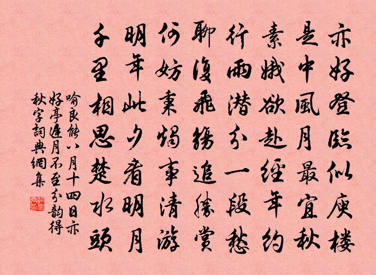 詩詞名句歷史字典書法欣賞書法字典國語詞典說文解字康熙字典古漢語字典標 題 作 者 詩 句 八月十四日亦好亭遲月不至分韻得秋字作者:喻良能 朝代:宋代原文亦好登臨似庾樓,是中風月最宜秋。素娥欲赴經年約,行雨潛分一段愁。聊復飛觴追勝賞,何妨秉燭事清游。明年此夕看明月,千里相思楚水頭。詩詞問答問:《八月十四日亦好亭遲月不至分韻得秋字》的作者是誰?答:喻良能問:該詩寫於哪個朝代?答:宋代書法欣賞八月十四日亦好亭遲月不至分韻得秋字書法作品詩詞推薦淮海對雪贈傅靄 ( 一作淮南對雪贈孟浩然 )李白〔唐代〕朔雪落吳天,從風渡溟渤。海樹成陽春,江沙浩明月。興從剡溪起,思繞樑園發。寄君郢中歌,曲罷心斷絕。蔡州三首孔武仲〔宋代〕愁雲昏昏掩六月,電光霍霍盤四隅。淮西一雨三書夜,長瀾積潦無處無。試登高樓望四野,平田渺渺成江湖。山源喜遷鶯俞文豹〔宋代〕小梅幽絕。向冰谷深深,雲陰冪冪。飽閱年華,慣諳冷淡,只恁清臞風骨。任他萬紅千紫,句引狂蜂游蝶。惟只共雪李洞〔唐代〕迢迢來極塞,連闕謂風吹。禪客呵金錫,征人擘凍旗。細填蟲穴滿,重壓鶴巢欹。有影晴飄野,無聲夜落池。正繁奉和公擇舅氏送呂道人研長韻黃庭堅〔宋代〕奉身玉壺冰,立朝朱絲弦。妙質寄郢匠,素心乃林泉。力耕不罪歲,嘉穀有逢年。校書天祿閣,蓺竹老風煙。攜提賢者之孝二百四十首孝已林同〔宋代〕子則欲其孝,人皆有是心。如何武丁聖,卻使子憂深。使還都湘東作張九齡〔唐代〕倉庚昨歸候,陽鳥今去時。感物遽如此,勞生安可思。養真無上格,圖進豈前期。清節往來苦,壯容離別衰。盛明園田嘆四絕范成大〔宋代〕山邊百畝古民田,田外新圍截半川。六七月間天不雨,若為車水到山邊。又送從道石介〔宋代〕常欲飽湲天下人,其道未得一寸施。子有二親皆七十,糠覈不充常寒飢。昨日訪我破屋下,具雞一隻酒一卮。子起失調名佚名〔宋代〕鼎里坎離,壺中天地,滿懷風月,一吸虛空。塵寰里,何人識我,開口問鴻濛。雲中。三弄笛,岳陽樓外,天遠霞又王昌齡〔唐代〕眇默客子魂,倏鑠川上暉。還雲慘知暮,九月仍未歸。舒城僧舍呈贈李仲宣文學林逋〔宋代〕竹深淮寺雪蕭騷,一壁寒燈伴寂寥。瘦盡骨毛終褭褭,蝕來鋒刃轉豪曹。宦情冷落詩中見,談態軒昂酒後高。莫為短歌行曹丕〔魏晉〕仰瞻帷幕,俯察几筵。其物如故,其人不存。神靈倏忽,棄我遐遷。靡瞻靡恃,泣涕連連。呦呦游鹿,草草鳴麑。白鶴禪寺湯乂〔宋代〕舊隱神仙宅,空王殿閣深。煉丹煙已冷,入竹路難尋。峰迥簫吹玉,溪寒石點金。靈源雙瀑布,千古得清音。送程給事知越州晏知止〔宋代〕遍歷侯藩治績高,瀛洲瑣闥人思褒。麟符又入千岩境,鷁艦不乘八月濤。田賴鑑湖賞歲美,客游梅市有人豪。從來熙寧蜡祭十三首佚名〔宋代〕惟蠟有祭,報神之功。全聚萬物,來享來崇。承詔揶事,不忘肅雍。靈之格思,福祿來崇。喚仙閣樓鑰〔宋代〕上到危層莫喚仙,只憑橫檻挹江天。江天如許來借眼,何用征僑更偓佺。希深惠書言與師魯永叔子聰幾道游嵩因誦而韻梅堯臣〔宋代〕聞君奉宸詔,瑞祝疑靈岫。山水聊得游,志願庶可就。豈無朋從俱,況此一二秀。方蘄建春陌,十刻殘晝漏。初經游雪竇遣興釋紹嵩〔宋代〕此地人來少,憑欄興莫窮。雲蘿難透日,喬木易高風。書滿閒窗下,雲生閉目中。焚香賦詩罷,頓懷眾緣空。柏家渡沈遼〔宋代〕柏家渡西日欲落,青山上下猿鳥樂。欲因新月望吳雲,遙看北斗掛南嶽。一夢愔愔四十秋,古人不死終未休。草舍名句推薦近淚無乾土,低空有斷雲。杜甫《別房太尉墓》 酒困路長惟欲睡,日高人渴漫思茶。蘇軾《浣溪沙·簌簌衣巾落棗花》 高峰入雲,清流見底陶弘景《答謝中書書》 十年磨一劍,霜刃未曾試。賈島《劍客 / 述劍》 言以足志,文以足言。左丘明《左傳·襄公·襄公二十五年》 中人以上,可以語上也;中人以下,不可以語上也。孔子弟子《論語·雍也篇》 青苔滿階砌,白鳥故遲留。杜牧《題揚州禪智寺》 天山三丈雪,豈是遠行時。李白《獨不見》 時霎清明,載花不過西園路。吳文英《點絳唇·時霎清明》 故人書報,莫因循、忘卻蓴鱸。辛棄疾《漢宮春·會稽秋風亭觀雨》