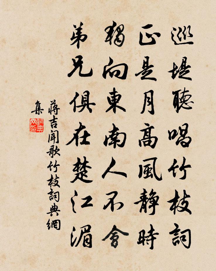 詩詞名句歷史字典書法欣賞書法字典國語詞典說文解字康熙字典古漢語字典標 題 作 者 詩 句 聞歌竹枝作者:蔣吉 朝代:唐代聞歌竹枝原文巡堤聽唱竹枝詞,正是月高風靜時。獨向東南人不會,弟兄俱在楚江湄。詩詞問答問:聞歌竹枝的作者是誰?答:蔣吉問:聞歌竹枝寫於哪個朝代?答:唐代問:聞歌竹枝是什麼體裁?答:七絕蔣吉聞歌竹枝書法欣賞聞歌竹枝書法作品注釋全唐詩:卷771-23詩詞推薦寄題廣信鄭倅潛道齋金君卿〔宋代〕養志浮名外,潛神聖壺中。誠心如自得,樂事固無窮。齋靜橫賓榻,詩成促遞筩。英瓊何以報,惟有四般同。太守林太博贈瑞香花劉克莊〔宋代〕一樹婆娑整復斜,使君輟贈到田家。自慚甕牖繩樞子,不稱香囊錦傘花。小借暖風為破萼,旋澆新水待抽芽。丁寧感皇恩蔡伸〔宋代〕酒暈襯橫波,玉肌香透。輕裊腰肢妒垂柳。臂寬金釧,且是不乾春瘦。拈金雙合字,無心繡。鬒雲半墮,金釵欲溜贈紫岩潘庭堅四首白玉蟾〔宋代〕富貴非足羨,貧賤不足羞。張儀但有舌,周朴不惜頭。我少亦學劍,到此萬年休。知君耿素抱,曷不遠行游。遺所思曹勛〔宋代〕君行既雲遠,我思日以長。思君無所遺,寶帶雙鴛鴦。鴛鴦不相失,錦翼遊方塘。副之玳瑁簪,同心復同房。上有友山李道士抱琴來為予作三曲請詩各為之操姚勉〔宋代〕若有人兮江之乾,志在流水兮必觀其瀾。清風蕭蕭兮水聲潺潺。吁嗟乎,世道江河兮誰底其間。初寒在告有感陸游〔宋代〕豪舉當年氣吐虹,即今憔悴一衰翁。寄懷本自俗塵外,移病何妨寒雨中。香暖候知銀葉透,酒清看似玉船空。故人讀劉琨傳岳珂〔宋代〕古為萬事無真實,賴有區區史筆存。士雅聞雞偶同被,至今起舞說劉琨。依韻和彭九及之歸養之什強至〔宋代〕江南春自好,蜀客亦思歸。淚與花俱落,心隨燕共飛。露章還子舍,孝理副宸闈。禁署風流後,謀漁未有磯。菩薩蠻(題醉道人圖)劉辰翁〔宋代〕八仙名姓當時少。污尊牛飲同傾倒。惟有我公榮。旁人笑獨醒。多年村落走。泥飲無升斗。入了玉門關。人生一醉秋暑劉克莊〔宋代〕□□七月熱,如焚復似烹。煉成女媧石,烈甚祖龍坑。月窟難梯上,天河莫挽傾。黃昏一陣雨,高枕聽韶聲。同諸韓飲曼叔家梅堯臣〔宋代〕富貴豐盤餐,日可侑清角。不與賢者俱,飽食何所學。吾友雖日貧,邀賞不辭數。質衣為酒肴,出論輕管樂。其饌寄韓子云總領吳芾〔宋代〕與君有約看梅花,準擬尊前共笑歌。花已飄零君不至,夕陽芳草奈愁何。和應之石澗張耒〔宋代〕麥氣朝含露,溪光夕照煙。斗麋蒼角老,雛雉絳毛鮮。葵折紅繒縐,蓮香水麝燃。敢辭幽僻處,直恐負林泉。漁父詞十三首蒲壽宬〔宋代〕白首漁郎不解愁,長歌箕踞亦風流。江上事,寄蜉蝣。靈均那更恨悠悠。華之高壽魯齋先生七十金履祥〔宋代〕自古在昔,聖賢有作。七十之齡,德烈方恪。鴛鴦湖棹歌 之十三朱彝尊〔清代〕金衣楚雀白?雞,不住裴公島上啼。白馬未嘶雲屋外,紅船先渡板橋西。白鷺李嘉祐〔唐代〕江南淥水多,顧影逗輕波。落日秦雲里,山高奈若何。種藥苗二首其一種甖粟蘇轍〔宋代〕甖小如甖,粟細如粟。與麥皆種,與穄皆熟。苗堪春菜,實比秋谷。研作牛乳,烹為佛粥。送太尉相公赴鎮安軍二首宋祁〔宋代〕連章得請避洪鈞,赭案除書天下聞。久冠鵷鸞為上宰,別驅貔虎作中軍。腳踏車款曲懷遼帳,一燧平安出隴雲。今日名句推薦人皆可以為堯舜。孟子《孟子·告子章句下·第二節》 中人以上,可以語上也;中人以下,不可以語上也。孔子弟子《論語·雍也篇》 花明玉關雪,葉暖金窗煙。李白《折楊柳》 鐵馬雲雕久絕塵,柳營高壓漢營春。溫庭筠《過五丈原 / 經五丈原》 疏林紅葉,芙蓉將謝,天然妝點秋屏列。薛昂夫《西湖雜詠·秋》 日暮九疑何處?認舜祠叢竹。文廷式《好事近·湘舟有作》 獨自莫憑欄,無限江山,別時容易見時難。李煜《浪淘沙令·簾外雨潺潺》 新秋逢閏,鵲橋重駕,兩度人間乞巧。顧太清《鵲橋仙·雲林矚題閏七夕聯吟圖》 我閉南樓看道書,幽簾清寂在仙居。李白《早秋單父南樓酬竇公衡》 借與門前磐石坐,柳陰亭午正風涼。范成大《夏日田園雜興》