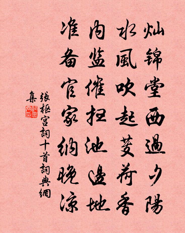 詩詞名句歷史字典書法欣賞書法字典國語詞典說文解字康熙字典古漢語字典標 題 作 者 詩 句 宮詞十首作者:張樞 朝代:宋代宮詞十首原文燦錦堂西過夕陽,水風吹起芰荷香。內監催掃池邊地,準備官家納晚涼。詩詞問答問:宮詞十首的作者是誰?答:張樞問:宮詞十首寫於哪個朝代?答:宋代張樞宮詞十首書法欣賞宮詞十首書法作品詩詞推薦出遊陸游〔宋代〕近過父老遠尋僧,病起經行力漸增。織室蹋機鳴軋軋,稻陂瀦水築登登。淺深村落時分徑,高下川原自作層。薄暮此君軒蘇軾〔宋代〕雲幢煙節十洲人,犀甲檀槍百萬軍。翳薈叢生何足道,此君真是此君君。次韻雪寒郡中糶米食源有賦高斯得〔宋代〕父兮兒飢母兮寒,瓶中無粟囊無錢。天公何不知人苦,獰風裂膚雪塞戶。我來日月雖未多,舛令已乾天譴呵。醫瘡東窗遣興陸游〔宋代〕巾屨長閒客,簾櫳薄暑天。巢空重乳燕,葉密未鳴蟬。壺箭看多算,圖書理斷編。悠然已日夕,卻上采菱船。和仁仲舟中三絕胡寅〔宋代〕異代紛爭戰伐多,樓船贏負倚蒼波。如今天險如平地,讐虜深謀只用和。菩薩蠻程垓〔宋代〕客窗曾剪燈花弄。誰教來去如春夢。冷落舊梅台。小桃相次開。人間春易老。只有山中好。閒卻槿花籬。莫教溪外邵考功遺鮆魚及鮆醬梅堯臣〔宋代〕已見楊花撲撲飛,鮆魚江上正鮮肥。早知甘美勝羊酪,錯把蓴羹定是非。西江月晏幾道〔宋代〕南苑垂鞭路冷,西樓把袂人稀。庭花猶有鬢邊枝,且插殘紅自醉。畫幕涼催燕去,香屏曉放雲歸。依前青枕夢回時東齋雜書陸游〔宋代〕藥與疾相當,何恙不能已。良醫善用藥,疾去藥亦止。晨晡節飲食,勞佚時臥起。藉臼米長生,耄期直易爾。赴京道中逢還鄉友高啟〔明代〕我去君卻歸,相逢立途次。欲寄故鄉言,先詢上京事。念奴嬌 方景兩先生廟鄭燮〔清代〕乾坤欹側,藉豪英幾輩,半空撐住。千古龍逢源不死,七竅比干肺腑。竹杖 * ,朱袍 * ,樸拙為艱苦。信心而洞仙歌晁端禮〔宋代〕年時此際,向扁舟同載。風送征帆暮天外。對沙汀宿鷺,與波上輕鷗,雙雙處,相喚相呼自在。如今重整棹,煙景巧婦梅堯臣〔宋代〕巧婦口流血,辛勤非一朝。莠荼時補紩,風雨畏漂搖。所託樹枝弱,而嗟巢室翹。周公誠自感,聊復賦鴟鴞。春秋戰國門魯仲連周曇〔唐代〕昔迸燒牛發戰機,夜奔驚火走燕師。今來躍馬懷驕惰,十萬如無一撮時。游羅浮山一首示兒子過蘇軾〔宋代〕人間有此白玉京,羅浮見日雞一鳴。南樓未必齊日觀,郁儀自欲朝朱明。(劉夢得有詩,記羅浮夜半見日事。山不相國廣平文簡程公輓歌二首司馬光〔宋代〕明直君臣合,安危將相兼。金章四輔貴,玉帳萬兵嚴。禦侮長城隱,臨繁利刃銛。南山隕岩石,何以慰民瞻。何處春深好二首張耒〔宋代〕何處春深好,春深居士家。荒園幾畦菜,環堵數株花。自蠟登山屐,仍驅下澤車。時時客問字,醉帽任傾斜。登邕州城陶弼〔宋代〕夜半孤成百尺台,亂蟲聲里一樽開。憂邊日繞南雲下,戀闕心隨北斗回。小重山·秋到長門秋草黃薛昭蘊〔唐代〕秋到長門秋草黃。畫梁雙燕去,出宮牆。玉簫無復理霓裳。金蟬墜,鸞鏡掩休妝。憶昔在昭陽。舞衣紅緩帶,繡鴛丁酉重九日宿順昌步雲閣絕句七首呈味道明府劉克莊〔宋代〕先倩清風掃水軒,更呼涼月倒金樽。定知明府歸侵夜,縣郭留燈未閉門。名句推薦謾道愁須殢酒,酒未醒、愁已先回秦觀《滿庭芳·碧水驚秋》 當家才知鹽米貴,養子方知父母恩。佚名《增廣賢文·上集》 地冷葉先盡,谷寒雲不行。李白《冬日歸舊山》 子治世之能臣,亂世之奸雄也。羅貫中《三國演義·第一回》 君看石芒碭,掩淚悲千古李白《丁督護歌》 長恨此身非我有,何時忘卻營營。蘇軾《臨江仙·夜飲東坡醒復醉》 其交也以道,其接也以禮,斯孔子受之矣。孟子《孟子·萬章章句下·第四節》 塵中見月心亦閒,況是清秋仙府間。劉禹錫《八月十五夜桃源玩月》 快意事過非快意,自古敗名因敗事。佚名《增廣賢文·下集》 玉露凋傷楓樹林,巫山巫峽氣蕭森杜甫《秋興八首·其一》