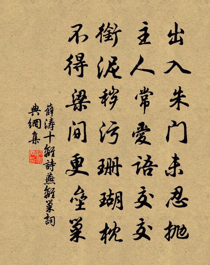 詩詞名句歷史字典書法欣賞書法字典國語詞典說文解字康熙字典古漢語字典標 題 作 者 詩 句 十離詩。燕離巢作者:薛濤 朝代:唐代十離詩。燕離巢原文出入朱門未忍拋,主人常愛語交交。銜泥穢污珊瑚枕,不得梁間更壘巢。詩詞問答問:十離詩。燕離巢的作者是誰?答:薛濤問:十離詩。燕離巢寫於哪個朝代?答:唐代薛濤十離詩。燕離巢書法欣賞十離詩。燕離巢書法作品注釋全唐詩詩詞推薦貢院樓北新栽小松白行簡〔唐代〕華省春霜曙,樓陰植小松。移根依厚地,委質別危峰。北戶知猶遠,東堂幸見容。心堅終待鶴,枝嫩未成龍。夜影六憶詩沈約〔南北朝〕憶坐時。點點羅帳前。或歌四五曲。或弄兩三弦。笑時應無比。嗔時更可憐。過溫湯石介〔宋代〕驪山山下水洋洋,一勺之多解破唐。敢告後人商鑒近,溫湯今日是唐湯。和孫端叟寺丞農具十五首其十五牧笛梅堯臣〔宋代〕牧人樂下牧,背騎吹短笛。聲穿吳雲低,韻入楚梅的。誰嗟苦調急,自與幽意寂。應同堯時民,歌將土壤擊。山竹枝(自化感寺攜來,至清源,投之輞川耳)元稹〔唐代〕深院虎溪竹,遠公身自栽。多慚折君節,扶我出山來。貴宅安危步,難將混俗材。還投輞川水,從作老龍回。予秋夜觀月得瘧疾枕上賦小詩自戲陸游〔宋代〕貪看霜月步亭皋,不覺寒侵范叔袍。且倚誦詩驅瘧鬼,斷無人寄碧腴膏。次韻吉老游青原將歸黃庭堅〔宋代〕欣欣林皋樂,賞心天際翔。清樽鱠魴鯉,朱果實圓方。醉罷聽疏雨,衾寒夢國香。雨余山吐月,的皪滿簾霜。展轉句徐似道〔宋代〕一帶拒霜三十里,又催簫鼓作秋聲。送林孔英葉適〔宋代〕東堂質疑匙啟鑰,西廂坐講水赴壑。本朝合選經博士,萬里那投郡文學。東風吹散石門冰,吳人送去蜀人迎。雪山偈六十九首釋道寧〔宋代〕有利無利,不離行市。師子嚬呻,象王遊戲。洎乎檢點將來,未是衲僧巴鼻。雖然吟五首方回〔宋代〕沽灑人家短竹籬,門前三兩牧牛兒。雖然此是尋常物,軍馬才過不見之。夏夜陳與義〔宋代〕閒弄玉如意,天河白練橫。時無李供奉,誰識謝宣城。兩鶴翻明月,孤松立快晴。南陽半年客,此夜滿懷清。書所見聞示諸友魏了翁〔宋代〕聞說奔軍闖閬州,余州民潰去如流。親曾見虎誠堪怖,只為狐驚亦可羞。頌古十六首釋道寧〔宋代〕百鍊精金大冶中,任他騰焰亘大紅。須臾拈出教人看,添得行家價轉豐。晚登瀼上堂杜甫〔唐代〕故躋瀼岸高,頗免崖石擁。開襟野堂豁,系馬林花動。雉堞粉如雲,山田麥無壟。春氣晚更生,江流靜猶涌。四序閱武堂下新渠曾鞏〔宋代〕方渠新鑿北林開,流水遙經畫閣來。洗耳厭聞夸勢利,濯纓羞去傍塵埃。不憂待月乾詩筆,已欲看華泛酒杯。卻憶詠銅柱李休烈〔唐代〕天門街里倒天樞,火急先須御火珠。計合一條絲線挽,何勞兩縣索人夫。久不作詩喜仲兄遷鄰居因成長句樓鑰〔宋代〕宦遊各天涯,泉州今雁行。官居半里所,相過復相望。西鄰得老屋,往來連戶窗。水竹占幽勝,風雨對一床。十年偶題陳宓〔宋代〕竇姬欲趙誤至代,昭君色妍還和醜。信知天命不可移,舉世奔趨果何有。【仙呂】游四門佚名〔元代〕野塘花落杜鵑啼,啼血送春歸。花開不拚花前醉,醉里又傷悲。伊,快活了是便宜。 柳綿飛盡綠絲垂,則管送名句推薦夢後樓台高鎖,酒醒簾幕低垂。晏幾道《臨江仙·夢後樓台高鎖》 學之乃知,不問不識。王充《論衡·卷二十六·實知篇》 南湖秋水夜無煙,耐可乘流直上天。李白《游洞庭湖五首·其二》 誰向若耶溪上,倩美人西去,麋鹿姑蘇。辛棄疾《漢宮春·會稽蓬萊閣懷古》 此身合是詩人未?細雨騎驢入劍門。陸游《劍門道中遇微雨》 貧賤非辱,貧賤而諂求於人者為辱王永彬《圍爐夜話·第三一則》 柴門聞犬吠,風雪夜歸人。劉長卿《逢雪宿芙蓉山主人》 歸雁橫秋,倦客思家。張可久《折桂令·九日》 新啼痕壓舊啼痕,斷腸人憶斷腸人。王實甫《十二月過堯民歌·別情》 君子戰雖有陳,而勇為本焉。墨子《墨子·02章 修身》