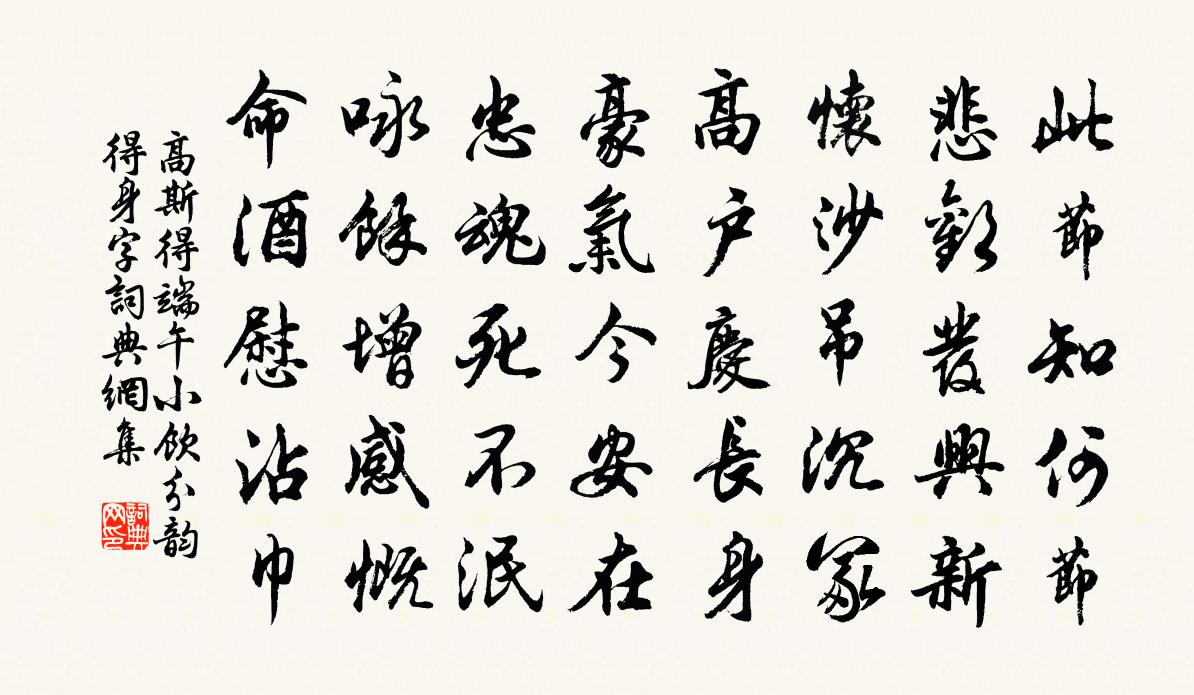 詩詞名句歷史字典書法欣賞書法字典國語詞典說文解字康熙字典古漢語字典標 題 作 者 詩 句 端午小飲分韻得身字作者:高斯得 朝代:宋代端午小飲分韻得身字原文此節知何節,悲歡發興新。懷沙吊沉冢,高戶慶長身。豪氣今安在,忠魂死不泯。詠余增感慨,命酒慰沾巾。詩詞問答問:端午小飲分韻得身字的作者是誰?答:高斯得問:端午小飲分韻得身字寫於哪個朝代?答:宋代高斯得端午小飲分韻得身字書法欣賞端午小飲分韻得身字書法作品詩詞推薦洞庭春色蘇軾〔宋代〕二年洞庭秋,香霧長噀手。今年洞庭春,玉色疑非酒。賢王文字飲,醉筆蛟龍走。既醉念君醒,遠餉為我壽。瓶開曉行湖上黃溍〔元代〕曉行重湖上,旭日青林半。霧露寒未除,鳧翳靜初散。夤緣際余景,閃倏多遺玩。會心乍有得,撫己還成嘆。夙予水龍吟(賦酴醿)盧祖皋〔宋代〕盪紅流水無聲,暮煙細草黏天遠。低回倦蝶,往來忙燕,芳期頓懶。綠霧迷牆,翠虬騰架,雪明香暖。笑依依欲挽和熊叔雅四詠潭溪秋碧劉子翬〔宋代〕秋空晚自明,孤煙澹難起。適意一枝筇,時來對寒水。喜魯直還用前韻再作晁說之〔宋代〕鷓鴣不入饌,松柏有常心。歸來應未老,但道古猶今。聞杜鵑有感王遂〔宋代〕人物同為氣所乘,良心露處即良能。天津有此驚康節,西蜀無之感少陵。蒙蔡藏用惠古風一軸嘆仰不足輒賦病桐書為謝王銍〔宋代〕老境憂患集,坐受衰病侵。山林成獨往,樽酒惟孤斟。萬事信已矣,滅跡棲蒼岑。對鏡未免愁,寒雲生岳陰。斯時歸自陶山舟中示暹侄蘇泂〔宋代〕鐘聲四山晚,一舸鏡中歸。遠舍火明樹,寒天露濕衣。塔高城不禁,林暗鳥疇依。有句傳猶子,吾疏合世違。在水軍宴贈幕府諸侍御李白〔唐代〕月化五白龍,翻飛凌九天。胡沙驚北海,電掃洛陽川。虜箭雨宮闕,皇輿成播遷。英王受廟略,秉鉞清南邊。雲旗寄元均石介〔宋代〕君為儒者豈知兵,何事欣隨壁馬行。裴度樽前坐韓愈,趙成帳下立荀卿。御戎誰道全無策,對壘寧妨一下枰。須信玉堂春馬鈺〔元代〕閒論修持,修持非草草。猛舍家緣,方求大道。滅盡無明,如軻能養浩。肯逐人情似桔*。駕食鶉居,自然無煩惱張儀徐夤〔唐代〕荊楚南來又北歸,分明舌在不應違。懷王本是無心者,籠得蒼蠅卻放飛。雜曲歌辭少年行四首王維〔唐代〕新豐美酒斗十千,鹹陽遊俠多少年。相逢意氣為君飲,系馬高樓垂柳邊。出身仕漢羽林郎,初隨驃騎戰漁陽。孰知夜寒行戴表元〔宋代〕昨日天寒不成醉,今日天寒不成寐。醉遲得酒可強歡,寐少愁多亦頻喟。紫竿葦炬鬧荒城,役夫遙作鸛鴨鳴。擁衾歲暮白居易〔唐代〕已任時命去,亦從歲月除。中心一調伏,外累盡空虛。名宦意已矣,林泉計何如。擬近東林寺,溪邊結一廬。渭水西別季侖崔國輔〔唐代〕隴外長亭堠,山深古塞秋。不知嗚咽水,何事向西流?天寧長老新齋堂請轉語吳潛〔宋代〕慧公幻出一齋堂,巨棟危梁壓十方。更有心堂無量闊,闊中別有好思量。下京口埭夜行孫逖〔唐代〕孤帆度綠氛,寒浦落紅曛。江樹朝來出,吳歌夜漸聞。南溟接潮水,北斗近鄉雲。行役從茲去,歸情入雁群。送陸澧還吳中(一作李嘉祐詩)劉長卿〔唐代〕瓜步寒潮送客,楊柳暮雨沾衣。故山南望何處,秋草連天獨歸。白鶴峰張祉〔宋代〕我登白鶴峰,下窺滄海日。色與朱橘同,形比彈丸一。夜半佇玩間,無質而生質。所以神仙侶, * 須超出。名句推薦送君不相見,日暮獨愁緒。孟浩然《送辛大之鄂渚不及》 連雨不知春去,一晴方覺夏深。范成大《喜晴》 求之有道,得之有命,是求無益於得也,求在外者也。孟子《孟子·盡心章句上·第三節》 愁凝處,渺渺殘照紅斂吳文英《宴清都·秋感》 豪華盡成春夢,留下古今愁。康與之《訴衷情令·長安懷古》 金風細細。葉葉梧桐墜。晏殊《清平樂·金風細細》 夫惜草茅者耗禾穗,惠盜賊者傷良民。韓非及後人《韓非子·難二》 肅肅花絮晚,菲菲紅素輕。杜甫《春遠 / 春運》 想子胥今夜見嫦娥,沉冤雪。史達祖《滿江紅·中秋夜潮》 博學而詳說之,將以反說約也。孟子《孟子·離婁章句下·第十五節》