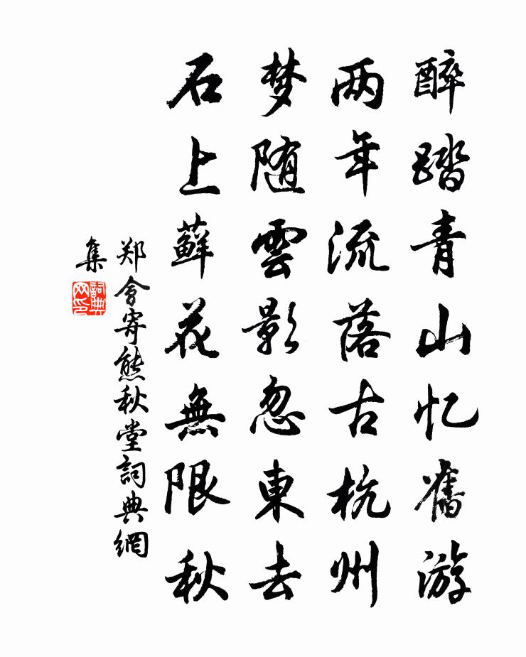 詩詞名句歷史字典書法欣賞書法字典國語詞典說文解字康熙字典古漢語字典標 題 作 者 詩 句 寄熊秋堂作者:鄭會 朝代:宋代寄熊秋堂原文醉踏青山憶舊遊,兩年流落古杭州。夢隨雲影忽東去,石上蘚花無限秋。詩詞問答問:寄熊秋堂的作者是誰?答:鄭會問:寄熊秋堂寫於哪個朝代?答:宋代鄭會寄熊秋堂書法欣賞寄熊秋堂書法作品詩詞推薦論語絕句一百首張九成〔宋代〕子心俯仰一無欺,由也升堂尚不知。疾病如何猶請禱,孰分上下與神只。祈雪霧豬泉出城馬上作贈舒堯文蘇軾〔宋代〕三年走吳越,踏遍千重山。朝隨白雲去,暮與棲鴉還。翩如得木狖,飛步誰能攀。一為符竹累,坐老敲榜間。此行杭湖夜歸陸游〔宋代〕昔如架上九秋鷹,今似窗間十月蠅。無復櫜鞬思出塞,不妨粥飯略同僧。白苹洲晚初回棹,綠樹村深已上燈。莫謂虞美人元好問〔金代〕一杯薄酒休辭醉。願一千二百歲。白雲長伴此身閒,桂月苹風,分取□壺天。鵲爐香□黃金尾。庭院生秋意。倒傾湘中阻風孔武仲〔宋代〕夜泊湖南岸,曉開天北風。愁雲來覆渚,白浪起吞空。瓮酒霞將薄,瓶花錦帶紅。鄰舟如隔海,孤坐寂寥中。湖州張公濟仰高亭曾幾〔宋代〕苕溪霅溪磨青銅,南山北山無數峰。不知當用幾錢買,羅列乃在君窗中。屬官屬私置莫問,但辦一榻眠清風。煙波題神岡廟其神蓋六朝時劉竺使君也周必大〔宋代〕岸斷川平拔一峰,丹青剝落古靈宮。邦人歲久忘遺愛,賈客時來乞好風。二水有情猶磬折,霜楓無數尚旗紅。岡頭西樓晚眺張玉孃〔宋代〕向晚登高樓,簾妝樓上頭。白煙凝野水,望斷使人愁。寄湯伯紀侍郎二首劉克莊〔宋代〕仗下鳴曾驚眾聽,省中語不願人傳。騷留屈子芳菲在,史視胡公糞土然。士到後凋方見節,世除勇退別無仙。遙知寄天台陳希畋徐夤〔唐代〕陰山冰凍嘗迎夏,蟄戶雲雷只待春。呂望豈嫌垂釣老,西施不恨浣紗貧。坐為羽獵車中相,飛作君王掌上身。拍手夜坐陸游〔宋代〕杳杳霜鍾十里聲,娟娟江月半窗明。陳編欲絕猶堪讀,微火相依更有情。九曲煙雲新散吏,百年鉛槧老諸生。頹然君莫非(此後九首和李餘)元稹〔唐代〕鳥不解走,獸不解飛。兩不相解,那得相譏。犬不飲露,蟬不啖肥。以蟬易犬,蟬死犬飢。燕在梁棟,鼠在階基。句高似孫〔宋代〕有晉風姿如此蟹,個個能空無能解。明融楊簡〔宋代〕妙絕虛明萬里光,融融靜靜渺茫茫。其間變化無蹤跡,卻有方圓與短長。仰首看空閒顧盼,聚頭竊語足商量。竹稍謝東粹包宏父三首癸卯夏戴復古〔宋代〕詩文雖兩途,理義歸乎一。鳳騷凡幾變,晚唐諸子出。本朝師古學,六經為世用。諸公相羽翼,文章還正統。晦翁六醜楊 * 〔宋代〕嘆濃歡易散,便忍把、恩情拋擲。恁時寸心,惟思生翅翼。別後蹤跡。不定如萍泛,暫拋江沔,又留連京國。芳容十月二十二夜同方寺丞宿瀑庵讀劉賓客集劉克莊〔宋代〕瀑山木落霜寒夜,共讀吾家夢得詩。坐對遺篇忘漏盡,手遮殘燭怕風吹。森嚴似聽元戎令,機警如看國手棋。千載送張秀才兼簡德麟陳師道〔宋代〕長安千門憎熱客,我獨憐君來解熱。呼兒具飯懶出口,藜羹不糝甘一啜。北州別駕玉刻麟,索書往見良可人。驛使次太白水西韻陳柄〔宋代〕涇巘翠插天,涇溪清繞郭。巒環松竹里,崖磴自樓閣。是時秋陽驕,三日此棲泊。曉色林端來,晴雲岩際落。飛梯李英公勣石介〔宋代〕一言容易廢忠謀,徇主從昏可自尤。今日始知辜付託,當時齒指血空流。名句推薦桂魄初生秋露微,輕羅已薄未更衣。王維《秋夜曲》 春路雨添花,花動一山春色。秦觀《好事近·夢中作》 君自故鄉來,應知故鄉事。王維《雜詩三首·其二》 五原春色舊來遲,二月垂楊未掛絲。張敬忠《邊詞》 冷紅葉葉下塘秋。長與行雲共一舟。姜夔《憶王孫·番陽彭氏小樓作》 一節見則百節知矣。劉向《說苑·尊賢》 即從巴峽穿巫峽,便下襄陽向洛陽。杜甫《聞官軍收河南河北》 巧媳婦煮不得沒米粥馮夢龍《警世通言·卷十二》 日暮飛鴉集,滿山蕎麥花。溫庭筠《題盧處士山居 / 處士盧岵山居》 落日照大旗,馬鳴風蕭蕭。杜甫《後出塞五首》