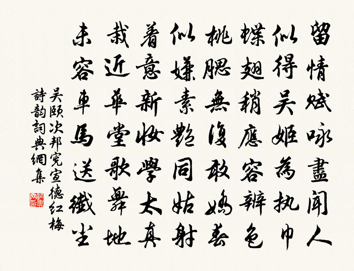 詩詞名句歷史字典書法欣賞書法字典國語詞典說文解字康熙字典古漢語字典標 題 作 者 詩 句 次邦憲宣德紅梅詩韻作者:吳頤 朝代:宋代次邦憲宣德紅梅詩韻原文留情賦詠盡聞人,似得吳姬為執巾。蝶翅稍應容辨色,桃腮無復敢嬌春。似嫌素艷同姑射,著意新妝學太真。栽近華堂歌舞地,未容車馬送纖塵。詩詞問答問:次邦憲宣德紅梅詩韻的作者是誰?答:吳頤問:次邦憲宣德紅梅詩韻寫於哪個朝代?答:宋代吳頤次邦憲宣德紅梅詩韻書法欣賞次邦憲宣德紅梅詩韻書法作品詩詞推薦方何二公回自郡所得不同作詩戲之王洋〔宋代〕南鄰博士只破幃,春來數日分春衣。東風陌上催蒙茀,不許看花緩緩歸。那此此理未可訴,破費書廚走長路。靜思晨炊皂徑楊萬里〔宋代〕問路無多子,驅車半日間。行穿崖石古,蹈破蘚花斑。綠語鶯邊柳,青眼水底山。人家豈無地,爭住小溪灣?孟門行崔顥〔唐代〕黃雀銜黃花,翩翩傍檐隙。本擬報君恩,如何反彈射。金罍美酒滿座春,平原愛才多眾賓。滿堂儘是忠義士,何意谷隱寺書事詩李廌〔宋代〕雲如戲我舒還卷,雨似欺人去復來。學道忘憂從老至,持杯得意使顏開。驪駒喜飽嘶猶戀,猘犬夸獰吠欲催。三日金剛隨機無盡頌知見不生分第三十一釋印肅〔宋代〕慮恐後來迷,黃葉止孩啼。依前不是息,閒且伸眉□。圩丁詞十解楊萬里〔宋代〕年年圩長集圩丁,不要招呼自要行。萬杵一鳴千畚土,大呼高唱總齊聲。次韻王鞏懷劉莘老蘇轍〔宋代〕兩都來往太頻頻,真是人間自在人。十載讀書同白屋,千金為客買朱唇。結交京邑傾心肺,寓思禪宗離垢塵。為問伯父《送先人下第歸蜀》詩云︰人稀野店休安蘇軾〔宋代〕乞墦何足羨,負米可忘艱。莫為無車馬,含羞入劍關。天山雪歌,送蕭治歸京岑參〔唐代〕天山有雪常不開,千峰萬嶺雪崔嵬。北風夜卷赤亭口,一夜天山雪更厚。能兼漢月照銀山,復逐胡風過鐵關。交河閉門徐夤〔唐代〕閉卻閒門臥小窗,更何人與療膏肓。一生有酒唯知醉,四大無根可預量。骨冷欲針先覺痛,肉頑頻灸不成瘡。漳濱陽羨雜詠十九首。西陽亭陸希聲〔唐代〕隔林殘日照孤亭,玄晏先生酒未醒。入夜莫愁迷下路,昔人猶在逐流螢。宿慈恩寺郁公房賈島〔唐代〕病身來寄宿,自掃一床閒。反照臨江磬,新秋過雨山。竹陰移冷月,荷氣帶禪關。獨住天台意,方從內請還。李中令輓詞二首宋祁〔宋代〕贈窆充幽隧,鳴簫異素輪。山丘華屋遠,桃李故蹊春。使幕被愁霧,談犀委暗塵。須知悟生滅,終得法為身。謁金門(春恨)王平子〔宋代〕舊一紙。小砑吳箋香細。讀到別來心下事。蹙殘眉上翠。怕落傍人眼底。握向抹胸兒里。針線不忺收拾起。和衣和天井關韋莊〔唐代〕太行山上雲深處,誰向雲中築女牆?短綆詎能垂玉甃,繚垣何用學金湯。劚開嵐翠為高壘,截斷雲霞作巨防。守吏怡顏堂王之道〔宋代〕人生無百年,半被憂患苦。其間開口笑,一月僅四五。誰能盼庭柯,怡然見眉宇。積財不得用,真是守錢虜。書窗即事朱淑真〔宋代〕花落春無語,春歸鳥自啼。多情是蜂蝶,飛過粉牆西。偈頌七十六首釋師範〔宋代〕時節不相饒,俄當七月朝。未聞桐葉落,已覺稻香飄。泣露蟬聲咽,迎秋雁影遙。有誰相共委,突兀對凌霄。胡笳十八拍十八首王安石〔宋代〕鞠之育之不羞恥,恩情亦各言其子。天寒日暮山谷里,腸斷非關隴頭水。兒呼母兮啼失聲,依然離別難為情。灑血憶廬山舊居處默〔唐代〕粗衣糲食老煙霞,勉把衰顏惜歲華。獨鶴只為山客伴,閒雲常在野僧家。叢生嫩蕨粘松粉,自落乾薪帶蘚花。明月名句推薦朝真暮偽何人辨,古往今來底事無。白居易《放言五首·其一》 招魂楚些何嗟及,山鬼暗啼風雨。元好問《摸魚兒·雁丘詞 / 邁陂塘》 何處征帆木末去,有時野鳥沙邊落。吳潛《滿江紅·豫章滕王閣》 有情不管別離久。情在相逢終有。晏幾道《秋蕊香·池苑清陰欲就》 春種一粒粟,秋收萬顆子。李紳《古風二首 / 憫農二首》 更無柳絮因風起,惟有葵花向日傾。司馬光《客中初夏》 年年負卻花期!過春時,只合安排愁緒送春歸。張惠言《相見歡·年年負卻花期》 理郁者苦貧,辭溺者傷亂劉勰《文心雕龍·神思》 志不強者智不達。墨子《墨子·02章 修身》 酒闌更喜團茶苦,夢斷偏宜瑞腦香。李清照《鷓鴣天·寒日蕭蕭上瑣窗》
