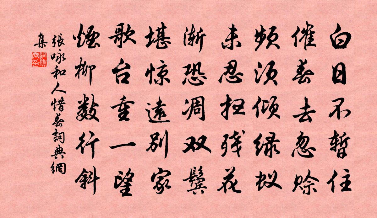 詩詞名句歷史字典書法欣賞書法字典國語詞典說文解字康熙字典古漢語字典標 題 作 者 詩 句 和人惜春作者:張詠 朝代:宋代和人惜春原文白日不暫住,催春去忽賒。頻須傾綠蟻,未忍掃殘花。漸恐凋雙鬢,堪驚遠別家。歌台重一望,煙柳數行斜。詩詞問答問:和人惜春的作者是誰?答:張詠問:和人惜春寫於哪個朝代?答:宋代張詠和人惜春書法欣賞和人惜春書法作品詩詞推薦送趙介之赴舂陵十首彭龜年〔宋代〕嫣然亭上雨,鑒止池邊月。人隔九疑山,何以慰愁絕。【中呂】醉高歌過喜春來 題情貫雲石〔元代〕自然體態溫柔,可意龐兒奈羞。看時節偷眼將人溜,送與人些風流證候。 蜂媒蝶使空迤逗,燕子鶯兒不自由。贈王道士周賀〔唐代〕藥力資蒼鬢,應非舊日身。一為嵩岳客,幾葬洛陽人。石縫瓢探水,雲根斧斫薪。關西來往路,誰得水銀銀。南歌子程大昌〔宋代〕才出滄溟底,旋明紫岫腰。玉光漫漫涌層潮。上有乘流海賈、臥 * 。更上雲台望,翻牽旅思遙。我生何許著簞瓢似村陳耆卿〔宋代〕縛茅本不傍孤村,盡日焚香深閉門。陌上紅塵高沒馬,誰知巢父箇中存。應天長方千里〔宋代〕嫩黃上柳,新綠漲池,東風艷冶天色。又見乍晴還雨,年華傍寒食。春依舊,身是客。對麗景、易傷岑寂。悵凝望踏莎行(中秋玩月)毛滂〔宋代〕碧樹陰圓,綠階露滿。金波瀲灩堆瑤盞。行雲會事不飛來,長空一片琉璃淺。玉燕釵寒,藕絲袖冷。只應未倚闌乾仙居縣傅夢得〔宋代〕經過太匆匆,山行去路通。客衣沾曉露,縣陌帶春風。沽酒從村市,騎牛任老翁。相逢有吟者,約我醉城中。葛仙井任翻〔唐代〕古井碧沈沈,分明見百尋。味甘傳邑內,脈冷應山心。圓入月輪淨,直涵峰影深。自從仙去後,汲引到如今。古店方回〔宋代〕古店看題壁,儒風豈易還。匪因登貢籍,即為叩賢關。騰踏雲霄上,沉埋草莽間。其人俱已矣,遺蹟尚斑斑。賀新郎(再次韻)徐鹿卿〔宋代〕雲橫遠浦。一段秋光煩著語。月下誰家。丹桂迎風一兩花。雙鳧來去。不踏人間風日處。才入雲溪。問我來時總不劉後村被召武衍〔宋代〕銜上官雖顯,吟邊興不衰。細評南嶽稿,遠過後山詩。才大人多忌,名高士素知。瓣香吾敢後,幸見召環時。吳歈一首送丘宗卿自平江移會稽贈壽老范成大〔宋代〕農圃規模昔共論,雲奎卜築又逢君。眉庵壽老長隨喜,好個拋梁伏願文。廬山唐寅〔明代〕匡廬山高高几重,山雨山濃復濃。燒丹未住屏風迭,騎驢來看香爐峰。江上烏帽誰渡水,岩際白衣人采松。古句又記呂岩〔唐代〕數載性樂幽幽, * 逃寒暑性逼。不求名與利,猶恐身心役。苦志慕黃庭,殷勤求道跡。陰功暗心修,善行長日積自跋江西道院集戲答客問二首楊萬里〔宋代〕問我來朝南內南,便從花底趁朝參。新詩猶作江西集,為帶筠州刺使銜。壕上感春楊萬里〔宋代〕長壕無事不耐靜,若非織綃便磨鏡。竹君不作五斗謀,風前折腰也如磬。先生節里城上嬉,朝游暮游不肯歸。晴空張推水亭賞蓮惠詩次韻舒邦佐〔宋代〕玉環妖血不飛天,化作芙蕖滿眼前。恰有六郎來比似,便喔七字斗清妍。曉妝洗露漢宮女,晚步凌波水府仙。得待次韻李壽卿明府憶梅陳造〔宋代〕炯若橫陳耐凍枝,清篇細讀更重披。即令扶病揩塵硯,痛憶尋芳載酒時。政使雪霙來眼底,卻愁霜鬢被花欺。暗香春色滿皇州張嗣初〔宋代〕何處年華好,皇州淑氣勻。韶陽潛應律,草木暗迎春。柳變金堤畔,蘭抽曲水濱。輕黃垂輦道,微綠映天津。麗景名句推薦碧水浩浩雲茫茫,美人不來空斷腸。李白《早春寄王漢陽》 雲青青兮欲雨,水澹澹兮生煙。李白《夢遊天姥吟留別 / 別東魯諸公》 幾處早鶯爭暖樹,誰家新燕啄春泥。白居易《錢塘湖春行》 一樹春風千萬枝,嫩於金色軟於絲。白居易《楊柳枝詞》 相呴以濕,相濡以沫,不如相忘於江湖。莊子《莊子·內篇·大宗師》 須作一生拚,盡君今日歡。牛嶠《菩薩蠻·玉爐冰簟鴛鴦錦》 寒燈思舊事,斷雁警愁眠。杜牧《旅宿》 忠臣挾難進之術,吐逆耳之言陳壽《三國志·魏書·辛毗楊阜高堂隆傳》 雲開汶水孤帆遠,路繞樑山匹馬遲。高適《東平別前衛縣李寀少府 / 送前衛縣李宷少府》 恨人間、會少離多,萬古千秋今夕。張埜《奪錦標·七夕》