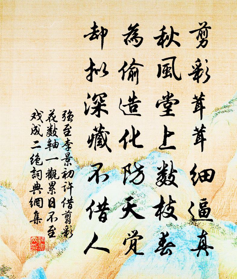 詩詞名句歷史字典書法欣賞書法字典國語詞典說文解字康熙字典古漢語字典標 題 作 者 詩 句 李景初許借翦彩花數軸一觀累日不至戲成二絕作者:強至 朝代:宋代原文剪彩茸茸細逼真,秋風堂上數枝春。為偷造化防天覺,卻擬深藏不借人。詩詞問答問:《李景初許借翦彩花數軸一觀累日不至戲成二絕》的作者是誰?答:強至問:該詩寫於哪個朝代?答:宋代書法欣賞李景初許借翦彩花數軸一觀累日不至戲成二絕書法作品詩文賞析【原題】:李景初許借翦彩花數軸一觀累日不至戲成二絕督之詩詞推薦先春亭司馬光〔宋代〕園林近鈴閣,旦夕被仁風。自得芳菲早,豈將疏遠同。冰開半塘綠,雨借數枝紅。會待韶光遍,還應到野叢。鷓鴣天元好問〔金代〕酒興濃於琥珀濃。爭教相望水西東。人家寒食清明後,天氣輕煙細雨中。花不盡,柳無窮。賞心難是此時同。阿連三月韓偓〔唐代〕辛夷才謝小桃發,蹋青過後寒食前。四時最好是三月,一去不回唯少年。吳國地遙江接海,漢陵魂斷草連天。新愁李誠之待制輓詞二首蘇轍〔宋代〕脫遺章句事經綸,滿腹龍蛇自屈伸。南駕威聲傳絕域,西征舊恨失奸臣。空留諫疏驚頹靡,終托詩詞話苦辛。直氣賽神元稹〔唐代〕村落事妖神,林木大如村。事來三十載,巫覡傳子孫。村中四時祭,殺盡雞與豚。主人不堪命,積燎曾欲燔。旋風對酒春園作王勃〔唐代〕投簪下山閣,攜酒對河梁。陝水牽長鏡,高花送斷香。繁鶯歌似曲,疏蝶舞成行。自然催一醉,非但閱年光。小園雙竹呈瑞二首岳珂〔宋代〕曲檻紅闌小圃西,平池影浸碧玻璃。便同雙劍看龍化,未許孤奩舞鳳棲。連袂縱觀金谷妓,聯篇頻付錦囊奚。使符望江南淨圓〔宋代〕娑婆苦,身世一浮萍。蚊蚋睫中爭小利,蝸牛角上竊虛名。一點氣難平。人我盛,日夜長無明。地獄爭頭成隊入,宴客夜歸六言楊萬里〔宋代〕月在荔支梢上,人行抹利花間。但覺胸吞碧海,不知身落南蠻。望都范成大〔宋代〕荒寺疏鍾解客鞍,由山東畔白煙寒。望都風土連唐縣,翁媼排門帶癭看。次韻婺州蕭教授見寄林季仲〔宋代〕不到雙溪久,渾疑一夢間。把君詩在手,見我別來山。薄宦故不惡,危塗難自閒。翩翩出林翼,飛倦合知還。寒食值雨歐陽修〔宋代〕禁火仍風雨,客心愁復淒。陰雲花更重,春日水平堤。油壁逢南陌,鞦韆出綠蹊。尋芳無厭遠,自有錦障泥。周十三丈約同馬三丈入青原山賦詩五首以記行趙蕃〔宋代〕蕭散得終日,驅馳難久居。滅瘢蘇病竹,拋食引潛魚。問話僧尋蜀,多茶椀似盧。主人佛事外,遊戲亦多餘。閶門懷古韋應物〔唐代〕獨鳥下高樹,遙知吳苑園。淒涼千古事,日暮倚閶門。適思顏胄〔唐代〕芳歲不我與,颯然涼風生。繁華掃地歇,蟋蟀充堂鳴。感物增憂思,奮衣出遊行。行值古墓林,白骨下縱橫。田豎宮詞一百首岳珂〔宋代〕鳳儀魚躍更龍拿,傳寶猶矜趙璧瑕。一夜神光照東井,天教景命屬天家。次韻劉貢父登黃樓懷子瞻二首蘇轍〔宋代〕青山開四面,白水繞三禺。野闊時聞籟,人閒舊據梧。畫船留上客,遺蹟問田夫。事少日常飲,才疏世未須。決河念金鑾子二首白居易〔唐代〕衰病四十身,嬌痴三歲女。非男猶勝無,慰情時一撫。一朝舍我去,魂影無處所。況念夭化時,嘔啞初學語。始知山中期張芬不至李端〔唐代〕石堤春草碧,雙燕向西飛。悵望雲天暮,佳人何處歸。藥欄蟲網遍,苔井水痕稀。誰道嵇康懶,山中自掩扉。玉樓春馮延巳〔唐代〕雪雲乍變春雲簇,漸覺年華堪縱目。北枝梅蕊犯寒開,南浦波紋如酒綠。芳菲次第長相續,自是情多無處足。尊前名句推薦夜雨連明春水生,嬌雲濃暖弄陰晴。蘇舜欽《初晴游滄浪亭》 揚子江頭楊柳春,楊花愁殺渡江人。鄭谷《淮上與友人別》 知是人家花落盡,菜畦今日蝶來多。高啟《春暮西園》 人心似鐵,官法如爐。佚名《增廣賢文·上集》 刻薄不賺錢,忠厚不折本。馮夢龍《醒世恆言·卷三》 取酒須勤醉,鄉關不可思。司馬光《送張寺丞覲知富順監》 誠有功,則雖疏賤必賞;誠有過,則雖近愛必誅。韓非及後人《韓非子·主道》 牆外行人,牆裡佳人笑。蘇軾《蝶戀花·春景》 仁遠乎哉?我欲仁,斯仁至矣。孔子弟子《論語·述而篇》 孤客傷逝湍,徒旅苦奔峭。謝靈運《七里瀨》