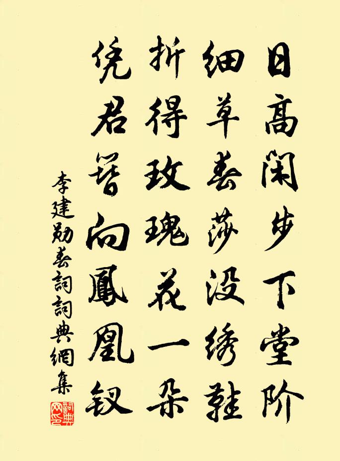 詩詞名句歷史字典書法欣賞書法字典國語詞典說文解字康熙字典古漢語字典標 題 作 者 詩 句 春詞作者:李建勛 朝代:唐代春詞原文日高閒步下堂階,細草春莎沒繡鞋。折得玫瑰花一朵,憑君簪向鳳凰釵。詩詞問答問:春詞的作者是誰?答:李建勛問:春詞寫於哪個朝代?答:唐代問:春詞是什麼體裁?答:七絕李建勛春詞書法欣賞春詞書法作品注釋全唐詩:卷739-74詩詞推薦和陳魯和陳魯山十詩以孟夏草木長遶屋樹扶疏陸游〔宋代〕風花憐寂寞,起舞為我娛。舉酒謝風花,吾道殊不疏。汝開何自有?汝落何自無?居然會此理,吾汝皆如如。夜集作離合詩謝惠連〔南北朝〕四坐宴嘉賓。一客自遠臻。九言何所戒。十善故宜遵。元宵燈謎曹雪芹〔清代〕天運無功理不窮,有功無運也難逢。因何鎮日紛紛亂,因為陰陽數不通。——打一物寄雲際寺敬上人許渾〔唐代〕萬山秋雨水縈迴,紅葉多從紫閣來。雲冷竹齋禪衲薄,已應飛錫過天台。淮上亂後寄子都兄五詩李洪〔宋代〕殘臘倉皇間道奔,相逢悲喜語還吞。巡檐慘澹梅花月,壽酒淋漓柏葉樽。禦敵孤城存即墨,還家聚首似羌村。見幾曉霧樓鑰〔宋代〕曉霧冥濛水拍堤,稜嶒亂石與雲齊。扁舟不用兼程去,到得稽城日已西。自曹家沙風中拋江危甚抵銅陵縣董嗣杲〔宋代〕朔風吹沙昏,聚落風物蕃。劇邑此寄治,零星數軍屯。奸狡紛雁鶩,生殖豐雞豚。獵子事兵仗,儒家扃蓽門。時聞重遊清源洞釋圓悟〔宋代〕此地今重到,藤蘿長碧陰。緬思仙去後,長有客來吟。出鳥江濤白,連雲嶺樹深。杖藜宜少駐,靈跡尚堪尋。龜溪即事五首高斯得〔宋代〕父兄吳下宅,師友苕溪磯。亦欲從之游,煦濕相因依。睽孤諒無樂,旅瑣良可唏。古來遁世士,獨立取眾非。咨予郭功父得楊次公家金書細字經求予作贊黃庭堅〔宋代〕為一□□□,□說妙蓮華。清淨法光明,透徹十二部。我□□□□,□□□曾說。是故秘密藏,藏在微塵中。有大關山月顧非熊〔唐代〕海上清光發,邊營照轉淒。深閨此宵夢,帶月過遼西。殿柱記李石〔宋代〕蒼龍甲戌歲,修築周公殿。文翁至高君,學校已再變。順考興平年,寔紀漢之獻。或雲鍾會書,入木字隱見。自獻為倉使吳荊溪先生壽趙孟堅〔宋代〕人祝先生壽,勛名而福祿。伊惟小門生,而乃異斯祝。所祝在斯文,其壽非已獨。嘗聞侍席言,檃括因以復。孔孟和楊教授張栻〔宋代〕客少從蒿長,居深懶戶開。孤城歲雲莫,瘦馬子能來。長策憐葵向,新詩更雨催。相看前日事,此首忍重回。和崔侍御尉佗〔唐代〕千歲荒台隳路隅,一煩太守重椒塗。感君拂拭意何極,贈爾美婦與明珠。度大庾嶺朱彝尊〔清代〕雄關直上嶺雲孤,驛路梅花歲月徂。丞相祠堂虛寂寞,越王城闕總荒蕪。自來北至無鴻雁,從此南飛有鷓鴣。鄉國和鄒思道寄詠西湖熊瑞〔宋代〕畫橋楊柳不勝愁,萬縷千條俛碧流。問著翠華霜日事,人人只道好杭州。別鄭大用於潯陽楊冠卿〔宋代〕子真千載士,流風凜然存。襟期輩古人,喜見雲礽孫。客里青燈連夜語,痛飲忘形到爾汝。欣髯一笑倚胡床,浩歌送張甥歸上饒吳芾〔宋代〕悲惱情懷未易除,相逢猶未免嗟吁。暫停絲竹雖雲冷,只對江山亦足娛。我得退閒為上策,汝能勤苦是亨衢。欲行劉德修殿院持節歸蜀袁說友〔宋代〕堂堂柏府幾人過,屈指精忠竟若何。正爾浮雲遮白日,賴公砥柱立頹波。回天力挽千鈞重,去國身輕一葉多。萬里名句推薦三年耕,必有一年之食;九年耕,必有三年之食。戴聖《禮記·王制》 青女素娥俱耐冷,月中霜里斗嬋娟。李商隱《霜月》 燕子飛來窺畫棟,玉鉤垂下簾旌。歐陽修《臨江仙·柳外輕雷池上雨》 闌乾風冷雪漫漫,惆悵無人把釣竿。姜夔《釣雪亭》 重重蕊葉相憐,似青帔艷妝神仙侶。曹勛《夾竹桃花·詠題》 一年最好,偏是重陽。吳文英《惜黃花慢·菊》 花開紅樹亂鶯啼,草長平湖白鷺飛。徐元傑《湖上》 古之為政,愛人為大戴聖《禮記·哀公問》 春草如有情,山中尚含綠李白《金門答蘇秀才》 還與去年人,共藉西湖草。蘇軾《卜運算元·感舊》