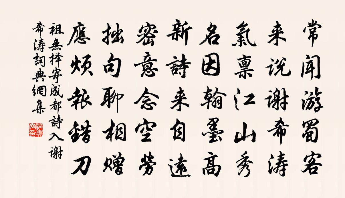 詩詞名句歷史字典書法欣賞書法字典國語詞典說文解字康熙字典古漢語字典標 題 作 者 詩 句 寄成都詩入謝希濤作者:祖無擇 朝代:宋代寄成都詩入謝希濤原文常聞游蜀客,來說謝希濤。氣稟江山秀,名因翰墨高。新詩來自遠,密意念空勞,拙句聊相贈,應煩報錯刀。詩詞問答問:寄成都詩入謝希濤的作者是誰?答:祖無擇問:寄成都詩入謝希濤寫於哪個朝代?答:宋代祖無擇寄成都詩入謝希濤書法欣賞寄成都詩入謝希濤書法作品詩詞推薦阻風呈趙史君三絕洪咨夔〔宋代〕長紅送酒出江城,檣燕喃喃第二程。風色似知攀臥意,打頭未肯放舡行。戲和虞卿王洋〔宋代〕君有輕舠恰稱身,我家亦有嶺頭雲。君雲容易能分我,亦有吾雲可寄君。題龍華山寺何耕〔宋代〕傑閣山為佛,精廬地布金。水涵空闊淨,路繞翠微深。鳥下窺齋缽,龍歸識梵音。城中塵眯目,那得此幽尋。有感三首方回〔宋代〕倉皇得郡免朝辭,十六年間老轉痴。一角未堪峨獬豸,二螯敢笑食蟛蜞。刊摩乾寶搜神記,嘯詠陶潛責子詩。格是玉樓春朱彝尊〔清代〕殘霞散盡魚天錦,臥柳門前萍葉浸。一梁塵暝燕空妝,露井風多蛩未寢。悲秋楚客今逾甚,那有閒情拚夜飲。屏山高風行懷本齋王柏〔宋代〕人皆喜君出,我獨喜君歸。君出豈不媺,事業生光輝。君歸亦不惡,風味高一時。人才有消長,世運有盛衰。公論減字木蘭花(次昌甫韻)韓淲〔宋代〕年光虛度。能得幾多消散處。莫恨歸遲。得見新詞不自持。山中酒里。笑語喧譁知有弟。此意誰如。世事紛紛一任郡中閒獨,寄微之及崔湖州白居易〔唐代〕少年賓旅非吾輩,晚歲簪纓束我身。酒散更無同宿客,詩成長作獨吟人。蘋洲會面知何日,鏡水離心又一春。兩處已亥雜詩 230龔自珍〔清代〕二王只合為奴僕,何況唐碑八百通。欲與此銘分浩逸,北朝差許鄭文公。隋堤懷古張祜〔唐代〕隋季窮兵復浚川,自為猛虎可周旋。錦帆東去不歸日,汴水西來無盡年。本欲山河傳百二,誰知鐘鼎已三千。那堪村居偶成姚孝錫〔宋代〕靜愛柴門野興幽,杖藜徐步到岩丘。深林有獸鳥先噪,廢圃無人泉自流。土瘠稅租隨力辦,年豐禾黍過時收。客來行香子沈端節〔宋代〕煙淡回塘。月浸疏篁。一枝□、壓盡群芳。修然風度,玉質金章。有許多情,許多韻,許多香。中酒情懷,琢句心李總乾遺詩十四句師於一句之下加頌七句釋印肅〔宋代〕自家先已痴,逢迷實不迷。能令石人舞,解使木哥吹。寂寂孤雲裹,逍遙勿我知。萬億恆沙佛,皆同一性齊。和河南楊少尹奉陪薛司空石筍詩許渾〔唐代〕暖溪寒井碧岩前,謝傅賓朋盛綺筵。雲斷石峰高並筍,日臨山勢遠開蓮。閒留幢節低春水,醉擁笙歌出暮煙。聞道暮過回樂烽李益〔唐代〕烽火高飛百尺台,黃昏遙自磧西來。昔時征戰回應樂,今日從軍樂未回。奉和襲美太湖詩二十首聖姑廟陸龜蒙〔唐代〕渺渺洞庭水,盈盈芳嶼神。因知古佳麗,不獨湘夫人。流蘇盪遙吹,斜領生輕塵。蜀彩駁霞碎,吳綃盤霧勻。可憐次德和韻寄談李二丈二首王阮〔宋代〕心在淮山下,身行湘水中。喜拋餘子去,恨不故人同。舊隱勞征夢,浮名任化工。衡陽春漸暖,終欲伴歸鴻。嘉禾頌七章章四句吳泳〔宋代〕惟唐叔是景,獻諸天子。天子不有,以歸肇祀。鶴會三首劉克莊〔宋代〕投不貲軀火宅中,須臾鬢雪換顏紅。暮年頗欲從翁去,共過蓬萊聽水鳳。小松(一作杜荀鶴詩,非)羅隱〔唐代〕已有清陰逼座隅,愛聲仙客肯過無。陵遷谷變須高節,莫向人間作大夫。名句推薦燕雁無心,太湖西畔隨雲去。姜夔《點絳唇·丁未冬過吳松作》 鵝鴨不知春去盡,爭隨流水趁桃花。晁沖之《春日·陰陰溪曲綠交加》 綠陰青子老溪橋。羞見東鄰嬌小。吳文英《西江月·賦瑤圃青梅枝上晚花》 失意還獨語,多愁只自知。張籍《薊北旅思 / 送遠人》 未必素娥無悵恨,玉蟾清冷桂花孤。晏殊《中秋月》 善刪者字去而意留,善敷者辭殊而義顯。劉勰《文心雕龍·熔裁》 教子弟求顯榮,不如教子弟立品行。王永彬《圍爐夜話·第四五則》 激氣已能驅粉黛,舉杯便可吞吳越。史達祖《滿江紅·中秋夜潮》 草木雖無情,因依尚可生李白《樹中草》 相尋夢裡路,飛雨落花中。晏幾道《臨江仙·鬥草階前初見》