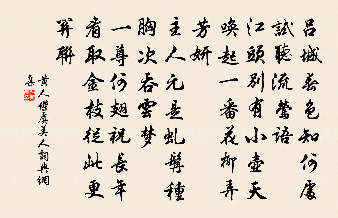 詩詞名句歷史字典書法欣賞書法字典國語詞典說文解字康熙字典古漢語字典標 題 作 者 詩 句 虞美人作者:黃人傑 朝代:宋代虞美人原文呂城春色知何處。試聽流鶯語。江頭別有小壺天,喚起一番花柳、弄芳妍。主人元是虬髯種。胸次吞雲夢。一尊何翅祝長年。看取金枝從此、更關聯。詩詞問答問:虞美人的作者是誰?答:黃人傑問:虞美人寫於哪個朝代?答:宋代問:虞美人是什麼體裁?答:詞黃人傑虞美人書法欣賞虞美人書法作品詩詞推薦枕上聞櫓聲李流謙〔宋代〕勸君不須下瞿唐,順流從此道路長。勸君早上瞿唐去,溯流雖艱近家鄉。我今出蜀幾寒暑,催歸苦念家人語。更煩高宗皇帝輓詞蕭燧〔宋代〕撥亂只興事,艱難創業同。好生天地德,立極帝王功。與子基圖永,成尊福祿崇。一朝違大養,悽愴櫟陽宮奉和文潛贈無咎篇末多見及以既見君子云胡不黃庭堅〔宋代〕北寺鎖齋房,塵鑰時一啟。晁張跫然來,連璧照書幾。庭柏郁蔥蔥,紅榴罅多子。時蒙吐佳句,幽處萬籟起。范忠宣南都帖贊岳珂〔宋代〕符佑戰,九河溢,砥柱植兮。珪確競,天地昏,清風滌兮。大中之道,關百聖而不熄兮。用之不失其時,公獨得兮贈景福順長老二首蘇轍〔宋代〕屈指江西老,多言劍外人。身心已無著,鄉黨漫相親。竄逐知何取,周旋意甚真。仍將大雷雨,一洗百生塵。吏部謠佚名〔唐代〕岑愔獠子後,崔湜令公孫。三人相比校,莫賀咄骨渾。點絳唇(奉酬富季申)李彌遜〔宋代〕翦翦疏花,托根宛在長松底。蔓柯相倚。便有凌霄志。丹鳳忽來,小隊迎秋起。留無計。待公歸侍。重與分紅翠。和鄭閎中仙居十一首陳襄〔宋代〕我愛仙居好,民純不用拘。閭閻興禮讓,囹圄長榛鞠。網闊奸逾少,風恬惡自無。一年人已焦,感激謝張弧。自蜀州暫還成都奉簡諸公陸游〔宋代〕不染元規一點塵,行歌偶到錦江濱。淋漓詩酒無虛日,判斷鶯花又過春。客路柳陰初墮絮,還家梅子欲生仁。更須野次遇雨王炎〔宋代〕木末雲屯飛雨暗,柳梢水到水溪深。身隨王事有行役,家在江南無信音。但得林泉堪著眼,莫將軒冕更關心。拂衣題洪和觀靜齋五邁〔宋代〕蠻觸當戰沖,蚌鶩據爭境。相持無了期,復命終歸靜。人事告紛拿,世態異炎冷。遠抱異俗觀,照以清明景。餘生骨肉聞已至文安而邊日有雨甚念之戲成絕句鄭剛中〔宋代〕行人未到雨瀟瀟,最苦酴醿葉盡飄。風雨不遮春去路,障泥空滯馬蹄驕。古道陳杰〔宋代〕殺雞季偉蔬留客,列鼎孫弘外一餚。古道無存幾夫子,今人何限不全交。失調名秦觀〔宋代〕我會從事風流府。西湖曲/玉樓春朱敦儒〔宋代〕今冬寒早風光好。休怪攙先敧絮帽。蟹肥一個可稱斤,酒美三杯真合道。年年閒夢垂垂了。且喜風松吹不倒。平分送鄭秀才曾鞏〔宋代〕鄭生雙瞳光欲溢,我意海月藏其中。齒清發紺心獨老,秋崖直聳千年檜。來趨學宮葉文字,進退佩玉何玲瓏。一朝花枕楊凝〔唐代〕席上沈香枕,樓中盪子妻。那堪一夜裡,長濕兩行啼。同安權縣林丞和餘二首趁韻答之劉克莊〔宋代〕頗聞四境有弦聲,雉傍人飛犬不驚。在處棠陰應勿伐,等閒花判亦流行。掞庭子盍摛新藻,絕廩□□□落英。台府記夢三首楊萬里〔宋代〕雲袖危相復,霜鍾韻政遲。忽然數聲急,卻是住撞時。題孔氏東園三首李廌〔宋代〕桐已參天柏已蒼,昔年曾見似人長。樹猶如此人休怪,賓主相逢鬢各霜。名句推薦山川蕭條極邊土,胡騎憑陵雜風雨。高適《燕歌行》 看破的,遁入空門;痴迷的,枉送了性命。曹雪芹《紅樓夢·第五回》 復恐匆匆說不盡,行人臨發又開封。張籍《秋思》 山下出泉,蒙;君子以果行育德。佚名《易傳·象傳上·蒙》 雁過也,正傷心,卻是舊時相識。李清照《聲聲慢·尋尋覓覓》 一人興善,萬人可激宋濂、王褘《元史·列傳·卷五十六》 神女生涯原是夢,小姑居處本無郎。李商隱《無題·重幃深下莫愁堂》 一張一弛,文武之道戴聖《禮記·雜記下》 言必信,行必果。孔子弟子《論語·子路篇》 田田初出水,菡萏念嬌蕊。龔翔麟《菩薩蠻·題畫》
