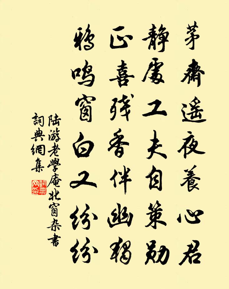 詩詞名句歷史字典書法欣賞書法字典國語詞典說文解字康熙字典古漢語字典標 題 作 者 詩 句 老學庵北窗雜書作者:陸游 朝代:宋代老學庵北窗雜書原文茅齋遙夜養心君,靜處工夫自策勛。正喜殘香伴幽獨,鴉鳴窗白又紛紛。詩詞問答問:老學庵北窗雜書的作者是誰?答:陸游問:老學庵北窗雜書寫於哪個朝代?答:宋代問:陸游的名句有哪些?答:陸游名句大全陸游老學庵北窗雜書書法欣賞老學庵北窗雜書書法作品詩詞推薦隔浦蓮(和葉編修士則韻)吳潛〔宋代〕蘭橈環城數疊。霧雨侵簾箔。翠竹交蒼樹,幽鳥聲聲如答。葦岸游綠鴨。暮山合。天際濃雲罨,水周幣。提攜一醉出朝天門繚長堤至劉侍郎廟由小西門歸陸游〔宋代〕曉從北郭過西城,十里沙堤似席平。澹日向人供帽影,微風傍馬助鞭聲。歡情寂寂隨年減,俗事紛紛逐日生。到處朋元不赴湖上觀雪之集,明日余召試玉堂,見范成大〔宋代〕文場寧復鬢霜宜,白玉堂前雪霽時。不惜狂言棖忌諱,禿毫冰硯竟無奇。春怨周弼〔宋代〕極浦苹花白,空壕蘭萼紅。傷心城上燕,飛入館娃宮。題章正字道正新居(孝標)朱慶餘〔唐代〕獨在御樓南畔住,生涯還似舊時貧。全無竹可侵行徑,一半花猶屬別人。吟處不妨嫌鼓鬧,眼前唯稱與僧鄰。近來窗前葵萱皆吐花成詩二首趙蕃〔宋代〕落去梅堪裹,乍開台更重。老懷非我獨,幽質為誰容。短髮簪猶惜,高軒詠可供。還愁早衰歇,無以慰疎慵。送僧游五台山釋簡長〔宋代〕五峰橫絕漢,寒翠倚蒼冥。積雪無煩暑,高杉礙落星。磧雪簷外見,邊角坐中聽。師到棲禪夜,龍湫獨灌瓶。紀游十首劉克莊〔宋代〕二客如龍虎,同登蟹井顛。吾今成聱叟,渠久作飛仙。讀黃子實詩卷吳泳〔宋代〕唐人漫自說金華,山谷雲孫自當家。玄色釀成真一酒,別機織出象生花。緬懷友義留巫峽,難割閨情下漢嘉。看徹素梅 三十王冕〔元代〕溪谷冰霜春到遲,老夫長夜只吟詩。憑誰說與中朝士?此是江南第一枝。羈春王勃〔唐代〕客心千里倦,春事一朝歸。還傷北園裡,重見落花飛。出山相贊釋如淨〔宋代〕凍不死,餓不死,深山走出這面觜。咦,人間天上風波起。鑒裁一首蘇籀〔宋代〕喬公評老瞞,謫仙奇郭令。視遠數十載,偉歟真智聖。破賊此郎子,勿反吾同姓。凡才慁世間,鑒裁惟其證。大奸中牟縣旅王禹偁〔宋代〕古縣日初沉,軺車忽見尋。不將遷客累,方認故人心。無酒銷寒漏,挑燈聽遠砧。郟郊重里路,並轡未妨吟。和劉侍郎入隆唐觀楊炯〔唐代〕福地陰陽合,仙都日月開。山川臨四險,城樹隱三台。伏檻排雲出,飛軒繞澗回。參差凌倒影,瀟灑軼浮埃。百果如夢令王師錫〔宋代〕竹上一樓鳳翠。竹下一渠春水。中有隱人居,破屋數間而已。無事。無事。靜夜月明千里。范蠡陸龜蒙〔唐代〕平吳專越禍胎深,豈是功成有去心。勾踐不知嫌鳥喙,歸來猶自鑄良金。滿江紅 次白君舉州卒所寄韻。君舉三十年前曹伯啟〔元代〕比以簿書倥傯,不酬答,聞改除天台,恐因得簪盍於惠泉之側,用以敘壯歲分攜,凝望眼、略無虛日。嗟我輩、江瑞鶴仙(張四益生日)王千秋〔宋代〕夷吾在江左。罄氈裘俱礱,笑清邊瑣。遺民冀巾裹。個規模欲繼,外人誰可。一花兩果。晚占熊、材能更夥。試頒十一月三日過升仙橋作陸游〔宋代〕熨手金鞭天馬駒,冰河雪谷笑談無。只言燕趙多奇士,豈必書生盡腐儒。名句推薦春朝秋夜思君甚,愁見繡屏孤枕。魏承班《滿宮花·雪霏霏》 揚雲霓之晻藹兮,鳴玉鸞之啾啾。屈原《離騷》 繞池閒步看魚游,正值兒童弄釣舟。白居易《觀游魚》 得言不可以不察。數傳而白為黑,黑為白。呂不韋《呂氏春秋·論·慎行論》 還怕掩、深院梨花,又作故人清淚。吳文英《無悶·催雪》 四月十七,正是去年今日,別君時。韋莊《女冠子·四月十七》 車轔轔,馬蕭蕭,行人弓箭各在腰。杜甫《兵車行》 昔孟母,擇鄰處。子不學,斷機杼。王應麟《三字經·全文》 東君也不愛惜,雪壓霜欺。晁沖之《漢宮春·梅》 枝枝相糾結,葉葉競飄揚。李白《古意》