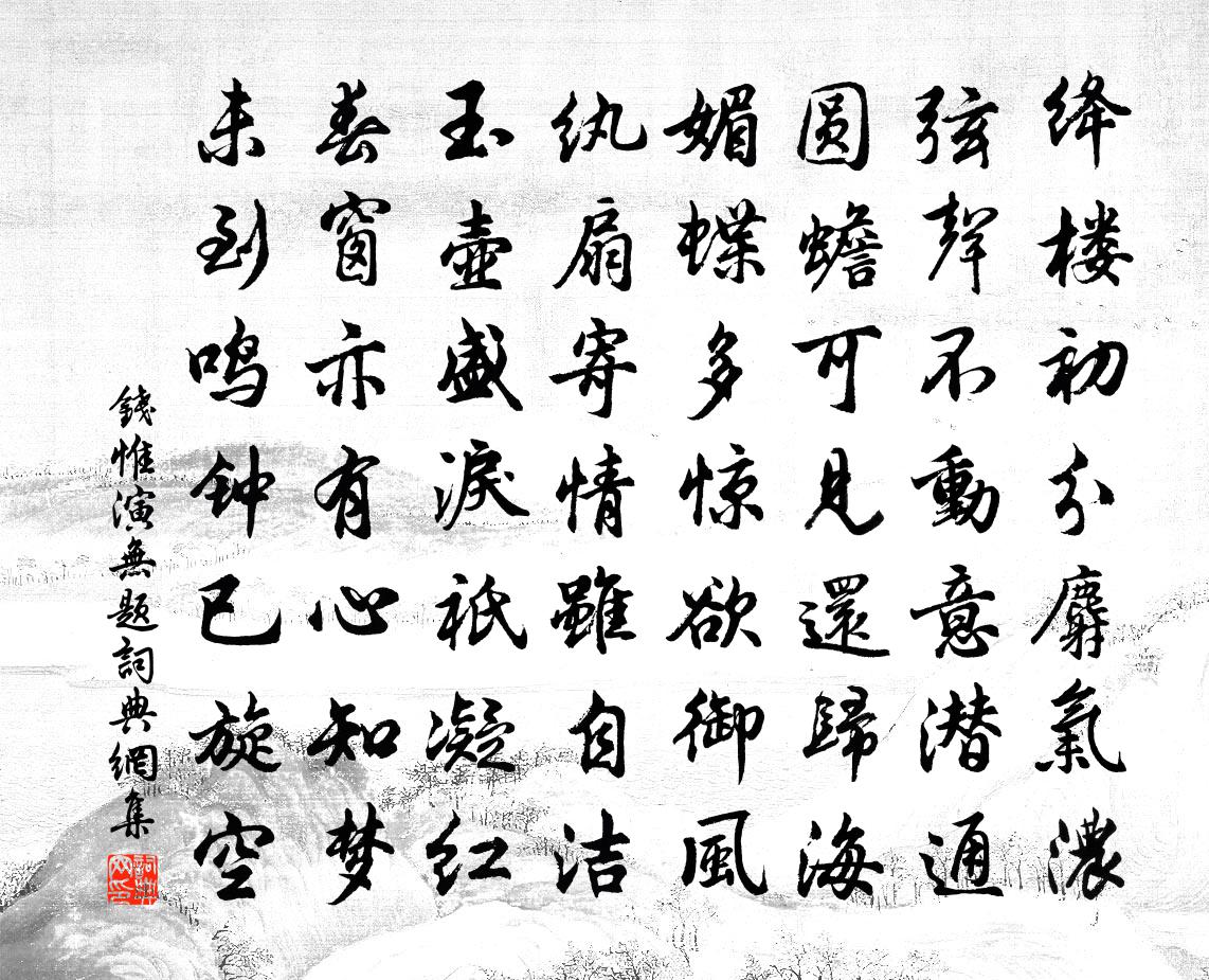 詩詞名句歷史字典書法欣賞書法字典國語詞典說文解字康熙字典古漢語字典標 題 作 者 詩 句 無題作者:錢惟演 朝代:宋代無題原文絳樓初分麝氣濃,弦聲不動意潛通。圓蟾可見還歸海,媚蝶多驚欲御風。紈扇寄情雖自潔。玉壺盛淚祇凝紅。春窗亦有心知夢,未到鳴鐘已旋空。詩詞問答問:無題的作者是誰?答:錢惟演問:無題寫於哪個朝代?答:宋代錢惟演無題書法欣賞無題書法作品詩詞推薦西湖柴望〔宋代〕年年柳眼青歸處,門外遊人可自閒。天氣又晴晴又雨,樓台依寺寺依山。酒邊歌拍穿花外,船上簫聲落水間。光景西江月 題邯鄲王化呂仙翁祠堂 中州樂府案此儲泳〔宋代〕壁斷何人舊字,爐寒隔歲殘香。洞天人去海茫茫。玩世仙翁已往。西日長安道遠,春風趙國台荒。行人誰不悟黃糧宿佛日山樓鑰〔宋代〕平生臨平山,知誦藕花句。輕帆幾來往,山色澹如故。寧知千萬峰,中間著佳趣。蕭蕭蒼髯翁,為指花城路。我來念奴嬌(謝人惠竹榻)姜夔〔宋代〕楚山修竹,自娟娟、不受人間袢暑。我醉欲眠伊伴我,一枕涼生如許。象齒為材,花藤作面,終是無真趣。梅風吹寄江陵王少府方乾〔唐代〕分手頻曾變寒暑,迢迢遠意各何如。波濤一阻兩鄉夢,歲月無過雙鯉魚。吟處落花藏筆硯,睡時斜雨濕圖書。此來別高家店施樞〔宋代〕獨抱朱弦識者稀,湖山與我獨相知。煙迷柳岸經行少,月照梅窗做夢遲。酒價寒高誰與貰,衾綿夜薄自多思。歸舟誡子弟詞陸九韶〔宋代〕聽聽聽聽聽聽聽,衣食生身天付定。酒肉貪多折人壽,經營太甚違天命。頌古二十六首釋嗣宗〔宋代〕不是風旛不是心,祖師正眼只如今。如今不識山河礙,識得如今海岳沉。贈電眸陳相士姚勉〔宋代〕岩電當年說阿戎,清談於世竟何功。君今雙目真如電,舉世忠邪一覽中。癸酉立春沖雪觀梅陳文蔚〔宋代〕吾翁當日手親栽,今郵芳英幾度開。把酒未能如一醉,沖寒犯雪日須來。小童薛陽陶吹觱栗歌(和浙西李大夫作)白居易〔唐代〕剪削乾蘆插寒竹,九孔漏聲五音足。近來吹者誰得名?關璀老死李袞生。袞今又老誰其嗣?薛氏樂童年十二。指點過永樂文長老已卒蘇軾〔宋代〕初驚鶴瘦不可識,旋覺雲歸無處尋。三過門間老病死。一彈指頃去來今。存亡慣見渾無淚,鄉井難忘尚有心。欲向室思徐幹〔魏晉〕沉陰結愁憂,愁憂為誰興?念與君相別,各在天一方。良會未有期,中心摧且傷。不聊憂餐食,慊慊常飢空。端坐古淡師然公遊方薛嵎〔宋代〕野僧攜錫別,何處度殘春。天地無窮事,江湖自在身。真心齊得物,道貌異於人。昔日安禪地,深山虎亦馴。奉和家大人將赴官舍留示及門之作孫應時〔宋代〕師訓勤誠數十年,此心端不愧高天。諸君體我家嚴意,學殖毋為齒莽田。嵩山十二首公路澗歐陽修〔宋代〕驅馬渡寒流,斷澗橫荒堡。槎危欲欹岸,花落多依草。擊汰翫游鯈,倒影看飛鳥。留連愛芳杜,漸下西峰照。嘉泰壬戍歸省墳墓感仲叔舊所惠詩及延慶堂夢姜特立〔宋代〕延慶堂中夢,人言積善家。翠娥環繞句,今日定如何。臨川見新柳崔櫓〔唐代〕不見江頭三四日,橋邊楊柳老金絲。岸南岸北往來渡,帶雨帶煙深淺枝。何處故鄉牽夢想,兩回他國見榮衰。汀洲次前韻酬王景雲見和三首陳著〔宋代〕與子相逢別未長,新詩寄我寂寞鄉。嚼情咀義心如醉,背立西風不自將。予居曲江五年今歲又暮慨然有感朱翌〔宋代〕坐對研旁峰,臥閱屏上山。一事不掛心,萬病方窮源。吾君禮南郊,吾母望北還。一歲幾得書,五年闕問安。是自名句推薦常人安於故習,學者溺於所聞。商鞅《商君書·更法》 廢一善,則眾善衰。賞一惡,則眾惡歸。黃石公《三略·下略》 御柳如絲映九重,鳳凰窗映繡芙蓉。溫庭筠《楊柳枝》 十四萬人齊解甲,更無一個是男兒!花蕊夫人《述國亡詩》 一樹春風千萬枝,嫩於金色軟於絲。白居易《楊柳枝詞》 觀今宜鑑古,無古不成今。佚名《增廣賢文·上集》 總為浮雲能蔽日,長安不見使人愁。李白《登金陵鳳凰台》 一雙舞燕,萬點飛花,滿地斜陽。陳子龍《訴衷情·春遊》 百結愁腸郁不開,此生惆悵異鄉來。秋瑾《九日感賦》 騷人可煞無情思,何事當年不見收。李清照《鷓鴣天·桂花》
