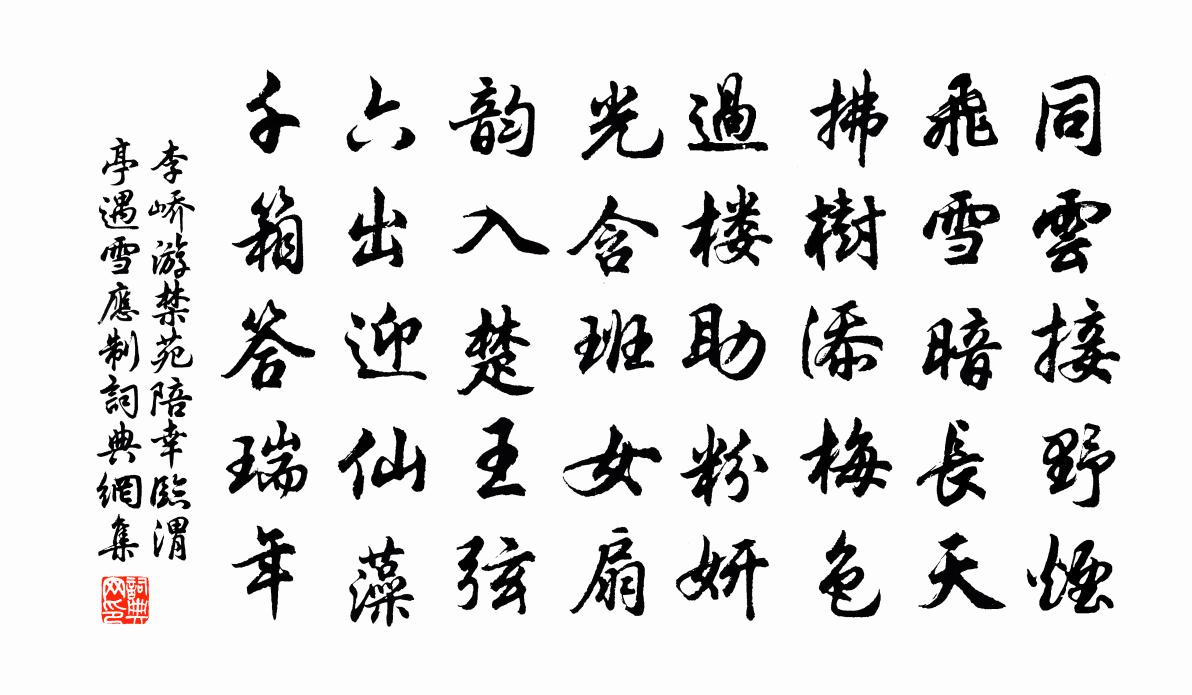 詩詞名句歷史字典書法欣賞書法字典國語詞典說文解字康熙字典古漢語字典標 題 作 者 詩 句 游禁苑陪幸臨渭亭遇雪應制作者:李嶠 朝代:唐代游禁苑陪幸臨渭亭遇雪應制原文同雲接野煙,飛雪暗長天。拂樹添梅色,過樓助粉妍。光含班女扇,韻入楚王弦。六出迎仙藻,千箱答瑞年。詩詞問答問:游禁苑陪幸臨渭亭遇雪應制的作者是誰?答:李嶠問:游禁苑陪幸臨渭亭遇雪應制寫於哪個朝代?答:唐代問:游禁苑陪幸臨渭亭遇雪應制是什麼體裁?答:五律李嶠游禁苑陪幸臨渭亭遇雪應制書法欣賞游禁苑陪幸臨渭亭遇雪應制書法作品注釋全唐詩:卷58_13詩詞推薦以虎臂杖送李任道二首黃庭堅〔宋代〕未衰筋力先扶杖,能救衰年十二三。八百老彭嗟杖晚,可憐矍鑠馬征南。送汪莊仲赴江東倉幕強仲荊門簽判樓鑰〔宋代〕之子游何許,平州更玉州。山川稱勝絕,幕府信風流。翠巘寒逾秀,金蓮夜不收。天涯念鄉國,少上仲宣樓。贊黃檗和尚釋法薰〔宋代〕破布裹真珠,古寺甘守拙。與裴國安名,對百丈吐舌。棒頭敲出小廝兒,卻向大愚言下瞥。瞥不瞥,返遭一掌如何有所恨二章歐陽詹〔唐代〕相思君子,吁嗟萬里。亦既至止,曷不覯止。本不信巫,謂巫言是履。在門五日,如待之死。有所恨兮。相思遺衣趙高徐鈞〔宋代〕閹奴久矣擅秦權,鹿馬欺君亦熱然。輒向望夷行弒逆,此身不殺是無天。蓼蕭佚名〔先秦〕蓼彼蕭斯,零露湑兮。既見君子,我心寫兮。燕笑語兮,是以有譽處兮。蓼彼蕭斯,零露瀼瀼。既見君子,為龍為淮西趙漕子固輓詩虞儔〔宋代〕西帥予曾忝,無何馬首東。計台初不遠,交篆竟成空。夜壑移舟半,淮山落木中。堂堂寧復見,丹旐獵霜風。謝人惠三峰朱柿陳洎〔宋代〕烏椑珍果益丹名,新折紅林蔕尚青。漿冷夜凝仙掌露,味甘秋割楚江萍。圓堆玉盌櫻難並,賸薦金樽酒易醒。應念十一月奉教作李嶠〔唐代〕凝陰結暮序,嚴氣肅長飆。霜犯狐裘夕,寒侵獸火朝。冰深遙架浦,雪凍近封條。平原已從獵,日暮整還鑣。西溪見牡丹范仲淹〔宋代〕陽和不擇地,海角亦逢春。憶得上林色,相看如故人。晚行田間書事三首趙蕃〔宋代〕青裙汲水過前溪,白髮譍門兒戲啼。試問主人何所在,為言南畝下扶犁。商山二首司空圖〔唐代〕清溪一路照羸身,不似雲台畫像人。國史數行猶有志,只將談笑繼英塵。馬上搜奇已數篇,籍中猶愧是頑仙。關頭頌古三十八首釋從瑾〔宋代〕鍾送黃昏雞報曉,趙州何用閒煩惱。裂破虛空作兩邊,古廟香爐出芝草。雁山釋如珙〔宋代〕石龍滴滴鼻中水,二十名泉類莫齊。頭白山翁貪漱齒,杖藜逐石過橋西。贈勉周濟川陳郁〔宋代〕坐窗長記別時愁,欲訊平安尚未由。客袂重來驚日久,義懷高甚薄雲浮。論心句好能令喜,到骨貧深不足憂。更向清平樂辛棄疾〔宋代〕連雲松竹。萬事從今足。拄杖東家分社肉。白酒床頭初熟。西風梨棗山園。兒童偷把長竿。莫遣旁人驚去,老夫靜窺園王安石〔宋代〕杖策窺園日數巡,攀花弄草興常新。董生只被公羊惑,肯信捐書一語真。諸公賦東園兄銅雀硯甚夸余獨不然然蘇長公艾性夫〔宋代〕臨洮健兒衷甲衣,曹家養兒乘禍機。匹夫妄作九錫夢,鬼蜮敢學神龍飛。負鼎而趍不遄死,築台尚俗儲歌舞。但知詠史上揚雄二首陳普〔宋代〕展禽未必非龔勝,孤竹猶將笑薛方。可怪揚雄非桀犬,一生終倚桀門牆。宿翁靈舍幽居期趙紫芝不至徐照〔宋代〕江城過一雨,秋氣入宵濃。蛩響移砧石,螢光出瓦松。月遲將近曉,角盡即聞鍾。又起行庭際,思君恨幾重。名句推薦願妾身為紅菡萏。年年生在秋江上。歐陽修《漁家傲·近日門前溪水漲》 行宮見月傷心色,夜雨聞鈴腸斷聲。白居易《長恨歌》 臣強則死,念妄則亡。來俊臣《羅織經·事上卷第二》 多謝浣紗人未折,雨中留得蓋鴛鴦。鄭谷《蓮葉》 存科名之心者,未必有琴書之樂王永彬《圍爐夜話·第二六則》 月有盈虧花有開謝,想人生最苦離別。張鳴善《普天樂·詠世》 蘭有秀兮菊有芳,懷佳人兮不能忘。劉徹《秋風辭》 不論平地與山尖,無限風光盡被占羅隱《蜂》 日暖桑麻光似潑,風來蒿艾氣如薰。蘇軾《浣溪沙·軟草平莎過雨新》 放眼暮江千頃,中有離愁萬斛,無處落征鴻。楊炎正《水調歌頭·把酒對斜日》