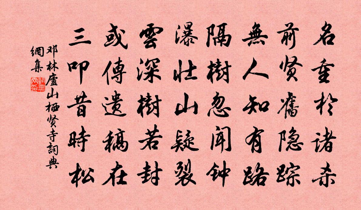 詩詞名句歷史字典書法欣賞書法字典國語詞典說文解字康熙字典古漢語字典標 題 作 者 詩 句 廬山棲賢寺作者:鄧林 朝代:宋代廬山棲賢寺原文名重於諸殺,前賢舊隱蹤。無人知有路,隔樹忽聞鍾。瀑壯山疑裂,雲深樹若封。或傳遺稿在,三叩昔時松。詩詞問答問:廬山棲賢寺的作者是誰?答:鄧林問:廬山棲賢寺寫於哪個朝代?答:宋代鄧林廬山棲賢寺書法欣賞廬山棲賢寺書法作品詩詞推薦午醉徑睡比覺已甲夜矣陸游〔宋代〕自我歸城西,已復再見冬。雖未掛衣冠,其實則老農。好事或餉酒,石室酒最醲。一醉輒至暮,臥聞湖寺鐘。心安性地頌張伯端〔宋代〕不移一步到西天,端坐諸方在目前。項後有光猶是幻,雲生足下未為仙。夜夢從數客雨中載酒出遊山川城闕極雄麗雲長陸游〔宋代〕有酒不謀州,能詩自勝侯。但須繩系日,安用地埋憂。射雉侵星出,看花秉燭游。殘春杜陵雨,不恨濕貂裘。游山陸游〔宋代〕蕭然破帽伴枯藤,逢著青山不厭憎。家似江淮歸業戶,身如湖嶺罷參僧。煨柴夜宿寒爐火,洗釜晨敲古澗冰。果向童謠佚名〔先秦〕吳王出遊觀震湖。龍威丈人名隱居。北上包山入靈墟。乃造洞庭竊禹書。天帝大文不可舒。此文長傳六百初。今強偈頌三十六首釋如珙〔宋代〕惡是罪業,善亦是罪業,罪業消除, * 。西河弄獅子,豐乾騎猛虎。老玄沙卓牌,鄧師伯打瓦鼓。金剛隨機無盡頌如理實見分第五釋印肅〔宋代〕方明實見身,見身非是身。法身無所得,非相本來人。贈黃叔向二絕戴栩〔宋代〕常恐清吟不療時,軟弓輕劍學兵書。君今得句欹紗帢,馬上功名更莫疎。泛永康江詩沈約〔南北朝〕長枝萌紫葉。清源 * 苔。山光浮水至。春色犯寒來。臨睨信永矣。望美曖悠哉。寄言幽閨妾。羅袖勿空裁。送鄭公績赴試金陵朱翌〔宋代〕筆端忘杻械,舌本貴溫潤。明明猶麟書,作世大龜鏡。哀哉束高閣,斯文久不勝。皇五開老眼,牽復首拜命。秋來謝潘端叔惠紅梅樓鑰〔宋代〕黃姑曾為點冰肌,亦有緇塵染素衣。何似煙脂天賜與,暗香猶在是耶非。步虎辱與予游最久其所為詩文僅窺一二未獲搴杜范〔宋代〕昔君游我里,諸老皆競爽。今逾三十年,百事一非往。君今來京都,相對各槁項。清燈話疇昔,未語意先惘。橐中答豆盧次方皎然〔唐代〕吾愛道交論,為高貴世名。昔稱柴桑令,今聞豆盧生。彼生清淮氣,獨鍾文中彩。近作公宴詩,如逢何柳在。吾用夢南塘一首劉克莊〔宋代〕惜哉典刑盡,久矣幽明分。忽夢如生平,握手各悲欣。素排俗學誤,獨策聖處勛。共起淹中蕝,重理閣上芸。援琴上政府五首郭印〔宋代〕政和乙未對彤庭,袖筆曾陪四海英。三十七年渾夢境,六千餘里邈神京。大鈞播物無垠際,小錄搜才有姓名。屈指下第獻座主張謂閻濟美〔唐代〕謇諤王臣直,文明雅量全。望爐金自躍,應物鏡何偏。南國幽沉盡,東堂禮樂宣。轉令遊藝士,更惜至公年。芳樹題太和主簿趙昌父思隱堂楊萬里〔宋代〕西昌主簿如襌僧,日餐秋菊嚼春冰。西昌官舍如佛屋,一物也無唯有竹。俸錢三月不曾支,竹陰過午未晨炊。大兒次韻子瞻留別三首蘇轍〔宋代〕公來十日坐東軒,手自披雲出朝日。山川滿目竟何有,波浪翻天同一濕。諸門迭出驚異狀,間道懷歸終舊壁。此行曉汲宋庠〔宋代〕曉汲過春畦,高梧待鳳欹。瓮思閒鑿{左土右遂},瓶險畏居湄。照影香釵墜,蠲煩素綆垂。寂寥無醉轄,瓢飲共句釋可勛〔宋代〕天曉不乾鐘鼓事,月明豈為夜行人。名句推薦今日斗酒會,明旦溝水頭。卓文君《白頭吟》 窮不失義,達不離道。孟子《孟子·盡心章句上·第九節》 向來吟秀句,不覺已鳴鴉。韓翃《酬程延秋夜即事見贈》 雲拼欲下星斗動,天樂一聲肌骨寒。劉禹錫《八月十五夜桃源玩月》 樂遊原上清秋節,鹹陽古道音塵絕。李白《憶秦娥·簫聲咽》 野渡舟橫,楊柳綠陰濃。謝逸《江神子·杏花村館酒旗風》 天下英雄誰敵手?曹劉。生子當如孫仲謀辛棄疾《南鄉子·登京口北固亭有懷》 欲祭疑君在,天涯哭此時。張籍《沒蕃故人》 平生多感激,忠義非外獎。李白《酬裴侍御對雨感時見贈》 春近寒雖轉,梅舒雪尚飄。陰鏗《雪裡梅花詩》