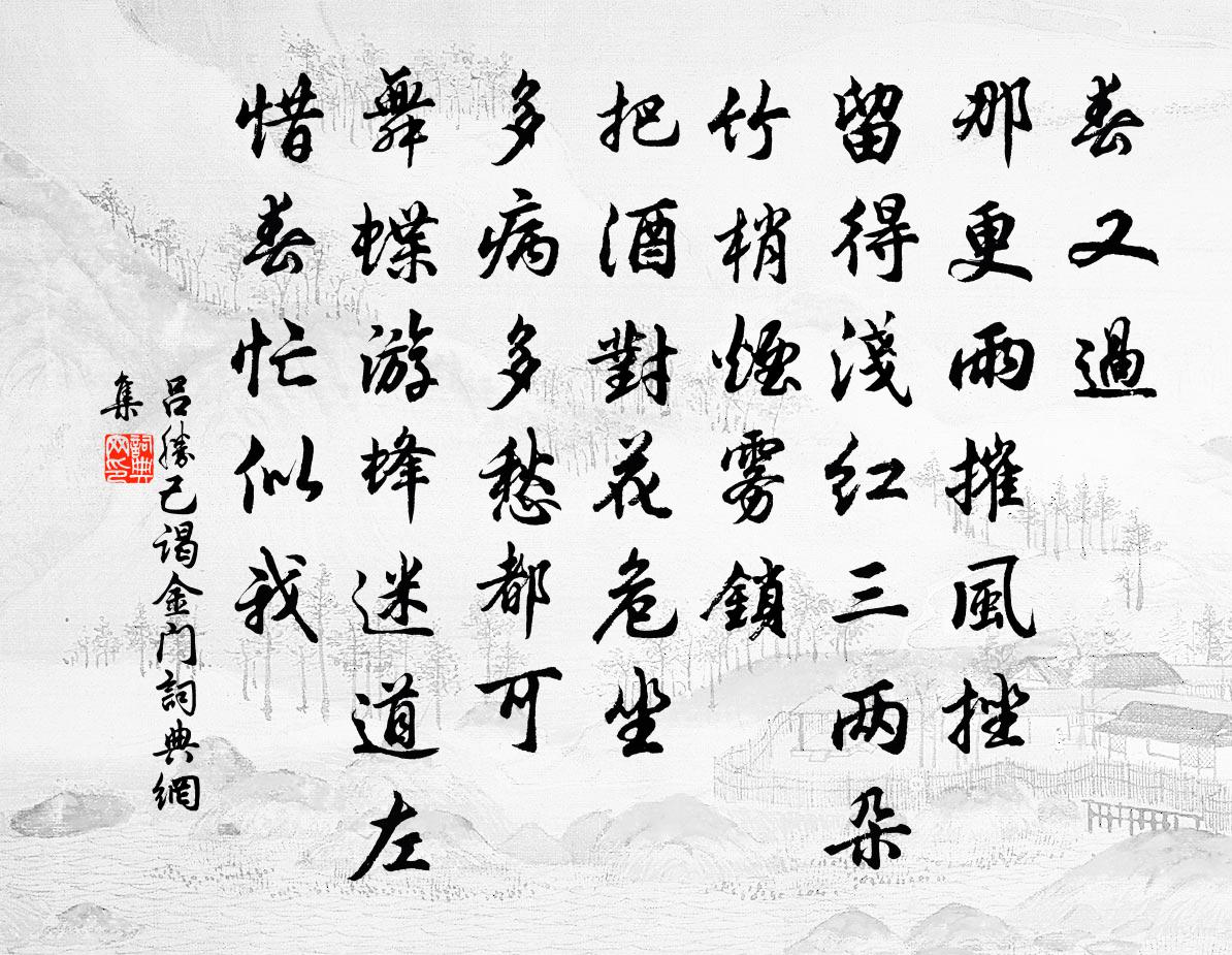 詩詞名句歷史字典書法欣賞書法字典國語詞典說文解字康熙字典古漢語字典標 題 作 者 詩 句 謁金門作者:呂勝己 朝代:宋代謁金門原文春又過。那更雨摧風挫。留得淺紅三兩朵。竹梢煙霧鎖。把酒對花危坐。多病多愁都可。舞蝶游蜂迷道左。惜春忙似我。詩詞問答問:謁金門的作者是誰?答:呂勝己問:謁金門寫於哪個朝代?答:宋代問:謁金門是什麼體裁?答:詞呂勝己謁金門書法欣賞謁金門書法作品詩詞推薦瑤台第一層 詠茶佚名〔宋代〕一氣才交,雷震動一聲,吐黃芽。玉人採得,收歸鼎內,製造無差。鐵輪萬轉,羅撼漸急,千遍無查。妙如法用,酬李才叔見贈王之道〔宋代〕篙師且緩莫予催,老眼逢君喜暫開。相與未成招隱什,分攜宜盡送行杯。誰令急景堂堂去,我為佳人得得來。萬壑力外吟邵雍〔宋代〕以少為多,以無為有。力外周旋,不能長久。秋居雜詠十首李彌遜〔宋代〕顒顒集癯仙,娟娟羅靜女。孤標與秀色,悠然出不堵。我來三二月,離立僅成伍。及秋新梢敷,接葉庇風雨。一日更漏子杜安世〔宋代〕雪肌輕,花臉薄。愁困不忺梳掠。眉翠裊,眼波長。偎人言語香。看難厭,憐不足。苦恨別離何速。珠樹遠,彩鸞寄題張光祿榮佚堂梅堯臣〔宋代〕疏氏昔二傅,張氏今兩卿。相去千餘載,能與同令名。亦嘗便侍從,況有冰玉清。山懷山東業,力制河北兵。雲煙李波小妹歌魏胡太后〔南北朝〕李波小妹字雍容,褰裙逐馬如卷蓬。左射右射必疊雙。婦女尚如此,男子安可逢。贈李得甫寄拙軒方回〔宋代〕吾嘗鄙文賦,陸機自炫鬻。濬發夸巧心,見唾憾拙目。□□淵明詩,莫若黃山谷。或者巧斧斤,疑謂拙不足。詩文重題小舫贈周從事兼戲微之白居易〔唐代〕細篷青篾織魚鱗,小眼紅窗襯麴塵。闊狹才容從事座,高低恰稱使君身。舞筵須揀腰輕女,仙棹難勝骨重人。不似東陽光化士乞頌釋慧遠〔宋代〕古殿燒殘不記年,冷光相射鬥牛寒。投機會有揮斤手,碧瓦朱甍翠插天。即事宋祁〔宋代〕我來春已晏,道樾半清陰。崖暗石蹲虎,林明花散金。頌古三十八首釋慧方〔宋代〕趙州曾探水,茱萸無一滴。東覷西覷了,拄杖便靠壁。滄海深處歸,何人辨端的。春日書事呈歷陽縣蘇仁仲八首王之道〔宋代〕公餘槐柳轉斜日,吏散鳥雀來空庭。康成書帶可人意,坐見茸茸相對青。感遇二十五首張耒〔宋代〕西京全盛日,宮闕上參天。建章千萬戶,白晝下神仙。金瓊麗雲日,栱角壓山川。一朝喪亂至,兩觀入戈鋋。漸台再留幾復黃庭堅〔宋代〕客興蓮藕敝鶉衣,蓮藕囊金罄褭蓮藕蹄。羸驂蓮藕多斷轡,垢發不勝篦。道德千年事,窮通一理齊。晚田猶溉種,漁舍觀海寄修竹黃庚〔宋代〕寒雲漠漠護牆陰,瀟灑梅枝出竹林。影落荒磯和雪釣,香浮老瓦帶春斟。幾恁水驛傳芳信,祗許沙鷗識素心。回首游熙六年端午帖子詞皇后合五首崔敦詩〔宋代〕鬭草人歸午漏徐,宮簾不動玉窗虛。旋開蕊笈尋仙典,閒點松腴試法書。浣溪沙(方響)蘇軾〔宋代〕花滿銀塘水漫流。犀槌玉板奏涼州。順風環佩過秦樓。遠漢碧雲輕漠漠,今宵人在鵲橋頭。一聲敲徹絳河秋。好離鄉 景金本注云,二首本名南鄉子 述懷丘處機〔元代〕獨坐向南溪。一事無能百不知。所愛冥冥煙雨後,東西。雲綻峨峨列翠微。蒼骨太虛齊。冉冉寒光映日飛。何事中晨起聞杜鵑趙蕃〔宋代〕水聲嘈雜蛙聲小,客子披衣坐侵曉。平生嗜懶每貪眠,行李催人未渠了。不勝倦嘆歌方苦,更聽林間杜鵑語。杜鵑名句推薦見碧水丹山,黃蘆苦竹。宋江《滿江紅·喜遇重陽》 天時、地利、人和,三者不得,雖勝有殃。孫臏《孫臏兵法·月戰》 烏絲闌紙嬌紅篆,歷歷春星。納蘭性德《紅窗月·燕歸花謝》 春水迷天,桃花浪、幾番風惡。張元乾《滿江紅·自豫章阻風吳城山作》 湘淚淺深滋竹色,楚歌重疊怨蘭叢。李商隱《潭州》 政者正也。君為正,則百姓從政矣。戴聖《禮記·哀公問》 無一語,對芳尊。安排腸斷到黃昏。秦觀《鷓鴣天·枝上流鶯和淚聞》 但憑闌無語,煙花三月春愁。鄭覺齊《揚州慢·瓊花》 湘江千歲未為陵,水底魚龍應識字。鮑溶《襄陽懷古》 且欲近尋彭澤宰,陶然共醉菊花杯。崔曙《九日登望仙台呈劉明府容》