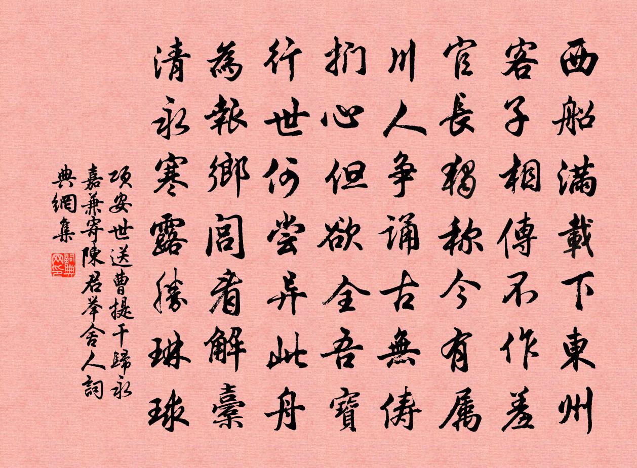 詩詞名句歷史字典書法欣賞書法字典國語詞典說文解字康熙字典古漢語字典標 題 作 者 詩 句 送曹提乾歸永嘉兼寄陳君舉舍人作者:項安世 朝代:宋代原文西船滿載下東州,客子相傳不作羞。官長獨稱今有屬,川人爭誦古無儔。捫心但欲全吾寶,行世何嘗異此舟。為報鄉閭看解橐,清永寒露勝琳球。詩詞問答問:《送曹提乾歸永嘉兼寄陳君舉舍人》的作者是誰?答:項安世問:該詩寫於哪個朝代?答:宋代書法欣賞送曹提乾歸永嘉兼寄陳君舉舍人書法作品詩詞推薦起水陸堂釋普濟〔宋代〕一漚大覺海中興,十趣波濤不暫停。返本還源空覺海,滿堂風月雨初晴。冊上公太常奏雅樂佚名〔宋代〕司樂陳金石,逶迤引上公。奏音人語絕,清韻佩聲通。應律煙雲改,來儀鳥獸同。得賢因舉頌,修禮便觀風。聖壽說謎三絕吳儆〔宋代〕滿身珠翠間花鈿,舞到梁州最可憐。一捻宮腰如束素,清風明月畫堂前。初歸雜詠陸游〔宋代〕雪滿漁蓑雨墊巾,超然無處不清真。胸中那可有一事,天下故應無兩人。騎馬每行秋棧路,喚船還渡暮江津。酒樓守閘書事時已退居五首曹勛〔宋代〕十年壯節下清都,鷁首常辭負弩驅。一棹西來黃篾舫,閘胥指點右樵漁。老人行王安石〔宋代〕老人低心逐年少,年少還為老人調。兩家挾詐自相欺,四海傷真誰復誚。翻手作雲覆手雨,當面輸心背面笑。古來劉宗元索余賦愚谷古人以愚自命及命人者多矣彭龜年〔宋代〕以愚名谷意何如,肯以愚溪認作吾。天地中間有真我,蕭然陋巷不關渠。虞美人王炎〔宋代〕鏡中失畫雙青鬢。懶更占花信。小梅半謝雨垂垂。未許輕紅破蕾、綴桃枝。社前歸燕穿簾語。似說人憔悴。自緣老閒詠二絕黃圖安〔清代〕落花天氣半晴陰,好去尋芳傍碧林。是物含情知愛惜,鶯聲聲里喚春深。桃花水到報平渠,喜動新流見躍魚。一枕題趙尉洞源泉許月卿〔宋代〕歸去來詞書印歷,高風千載汝南評。松間風影有地籟,林下炎天無水聲。行客詩魂同石瘦,主人心事共泉清。明朝舒州人歌佚名〔唐代〕鄰邑谷不登,我土豐粢盛。禾稼美如雲,實系我使君。摸魚兒劉辰翁〔宋代〕想幼安、遼東歸後,自羞年少龍首。長安市上壚邊臥,枉卻快行家走。空兩袖。染醉墨淋漓,把似天香透。功名邂浣溪沙(月夜對梅小酌)毛滂〔宋代〕蠟燭花中月滿窗。楚梅初試壽陽妝。麒麟為脯玉為漿。花影燭光相動盪,抱持春色入金觴。鴨爐從冷醉魂香。長相思周邦彥〔宋代〕好風浮,晚雨收,林葉陰陰映鷁舟,斜陽明倚樓。黯凝眸,憶舊遊,艇子扁舟來莫愁,石城風浪秋。言懷·恨乏平戎策高駢〔唐代〕恨乏平戎策,慚登拜將壇。手持金鉞冷,身掛鐵衣寒。主聖扶持易,恩深報效難。三邊猶未靜,何敢便休官?思九江舊居三首李中〔唐代〕結茅曾在碧江隈,多病貧身養拙來。雨歇汀洲垂釣去,月當門巷訪僧回。靜臨窗下開琴匣,悶向床頭潑酒醅。遊宦破虜凱歌二十四首周麟之〔宋代〕黧面長須桀黠兒,一生渾事 * 嬉。莫將遺像欺群目,曾向貞元殿里窺。六言三首劉克莊〔宋代〕溪北酒旗裊裊,溪南社鼓冬冬。寧問餔糟漁父,懶求賦芧狙公。寄曾使君謝伋〔宋代〕江色城霞氣象新,中興岳牧用詩人。爭趨畫戟高門地,竊伏荒山漲海瀕。敢望車魚延傳舍,先持箋簡具州民。猿驚句姚孝錫〔宋代〕雲生古木千章秀,山抱晴川一掌平。名句推薦草木雖無情,因依尚可生李白《樹中草》 酷暑天,葵榴發,噴鼻香十里荷花。白樸《得勝樂·夏》 強整繡衾,獨掩朱扉,枕簟為誰鋪設。阮逸女《花心動·春詞》 楊花落盡子規啼,聞道龍標過五溪。李白《聞王昌齡左遷龍標遙有此寄》 春色滿園關不住,一枝紅杏出牆來。葉紹翁《遊園不值》 曲妙人不能盡和,言是人不能皆信。王充《論衡·卷二十七·定賢篇》 落紅不是無情物,化作春泥更護花。龔自珍《己亥雜詩·其五》 大江東去,浪淘盡,千古風流人物。蘇軾《念奴嬌·赤壁懷古》 寧為雞口,無為牛後。劉向《戰國策·韓一·蘇秦為楚合從說韓王》 雍雍新雁咽寒聲,愁恨年年長相似。李煜《謝新恩·冉冉秋光留不住》