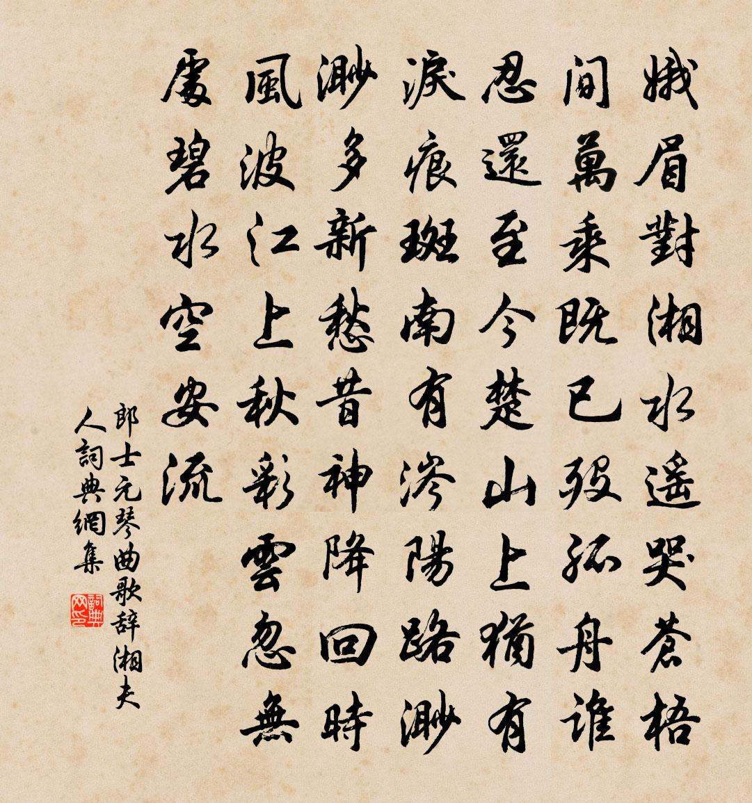 詩詞名句歷史字典書法欣賞書法字典國語詞典說文解字康熙字典古漢語字典標 題 作 者 詩 句 琴曲歌辭湘夫人作者:郎士元 朝代:唐代琴曲歌辭湘夫人原文娥眉對湘水,遙哭蒼梧間。萬乘既已歿,孤舟誰忍還。至今楚山上,猶有淚痕斑。南有涔陽路,渺渺多新愁。昔神降回時,風波江上秋。彩雲忽無處,碧水空安流。詩詞問答問:琴曲歌辭湘夫人的作者是誰?答:郎士元問:琴曲歌辭湘夫人寫於哪個朝代?答:唐代問:琴曲歌辭湘夫人是什麼體裁?答:樂府郎士元琴曲歌辭湘夫人書法欣賞琴曲歌辭湘夫人書法作品注釋全唐詩:卷23_9詩詞推薦次呂居仁見寄韻張元乾〔宋代〕老去猶為客,誰人念退居。相望千里路,賴有數行書。白曬猶堪寄,烏牛政憶渠。何時聞枉駕,竹里喚行廚。回文佚名〔宋代〕寒信風飄桑葉黃,冷燈殘月照空狀。看君寄憶迴文錦,字字縈愁寫斷腸。夢相親/玉樓春賀鑄〔宋代〕清琴再鼓求凰弄。紫陌屢盤驕馬鞚。遠山眉樣認心期,流水車音牽目送。歸來翠被和衣擁。醉解寒生鐘鼓動。此歡寶氣亭三首趙蕃〔宋代〕西下扁舟浩所經,暫梯堤石上津亭。偶從長老詢遣跡,說道神遊尚炳靈。送建安鄭尉劉克莊〔宋代〕路人能說尉,壹似建溪清。寸錦不攜去,束書相伴行。無心乾舉將,有面見賢兄。應笑東陽令,淹留白髮生。琴高魚歐陽修〔宋代〕琴高一去不復見,神仙雖有亦何為。溪鱗佳味自可愛,何必虛名務好奇。楊白花舒岳祥〔宋代〕楊白花,懊惱隨風渡江水。將心莫托少年郎,少年一去輕萬里。楊條插地便生根,花性飄揚似夢塵。恨不築城高萬再和楊公濟梅花十絕蘇軾〔宋代〕天教桃李作輿台,故遣寒梅第一開。憑仗幽人收艾納,國香和雨入青苔。柳姜特立〔宋代〕森森萬木勢崢嶸,千尺孤標更上征。惟有柳絲低拂路,腰支憔悴為多情。州城西園入齋祠社陳叔達〔唐代〕升壇預潔祀,詰早肅分司。達氣風霜積,登光日色遲。農教先八政,陽和秩四時。祈年服垂冕,告幣動褰帷。瘞地弄水亭次李察院韻喻良能〔宋代〕清溪一曲抱危亭,天水無塵相與明。昔日紫微今御史,兩翁詩句一般清。池上木芙蓉欲開述興二首張鎡〔宋代〕芙蓉環望壓波明,燕尾舟從綠處撐。待得花成紅沓墮,老夫天地錦縱橫。送曾景建道州聽讀李自中〔宋代〕晚節傷弓未足憐,江湖因此累諸賢。名標宇宙各年在,事屬朝廷萬口傳。湘水有情空引些,舂陵無事早歸田。多年四言贈兄秀才入軍詩 其十二嵇康〔兩漢〕輕車迅邁。息彼長林。春木載榮。布葉垂陰。習習谷風。吹我素琴。交交黃鳥。顧儔弄音。感悟馳情。思我所欽。晚泛草塘有魚入舟呼童膾之適見瑞蓮駢植與客方岳〔宋代〕柳邊又報瑞蓮開,持與南薰討論來。君子花寧兒女熊,隱居人豈艷陽才。一經在昔曾雙薦,三世於今不異財。自有次韻徐秀才十首陳造〔宋代〕釣湖鱠紅鱗,斸山飯黃獨。書生甘若飴,八珍不在目。出處有餘裕,贔屓營寸祿。一舟指三徑,不遠儻許復。後漢門明帝周曇〔唐代〕朝臣鹹佞孰知非,張佚公忠語獨奇。博士一言除太傅,謚為明帝信其宜。至揚州文天祥〔宋代〕青衣山下汲荒泉,道遇腥風走不前。向晚歸來號且哭,胡兒只為解腰纏。浣溪沙·水漲魚天拍柳橋周邦彥〔宋代〕水漲魚天拍柳橋。雲鳩拖雨過江皋。一番春信入東郊。閒碾鳳團消短夢,靜看燕子壘新巢。又移日影上花梢。參政大資毗陵張公輓詩十首周麟之〔宋代〕一馬龍驤後,中朝草創初。秉樞登政路,扈蹕擁宸裾。像入去台畫,名標玉府書。太平資舊德,不及駕安車。名句推薦總為浮雲能蔽日,長安不見使人愁。李白《登金陵鳳凰台》 經目之事,猶恐未真;背後之言,豈能全信?施耐庵《水滸傳·第二十六回》 飛流直下三千尺,疑是銀河落九天。李白《望廬山瀑布》 一葉浮萍歸大海,為人何處不相逢!吳承恩《西遊記·第四十回》 大曰逝,逝曰遠,遠曰反。老子《老子·道經·第二十五章》 何處營巢夏將半,茅檐煙里語雙雙。杜牧《村舍燕》 煙橫水際,映帶幾點歸鴉,東風銷盡龍沙雪。賀鑄《石州引·薄雨初寒》 聞道欲來相問訊,西樓望月幾回圓。韋應物《寄李儋元錫》 月色穿簾風入竹,倚屏雙黛愁時。顧敻《臨江仙·月色穿簾風入竹》 夕陽閒淡秋光老,離思滿蘅皋柳永《少年游·參差煙樹灞陵橋》