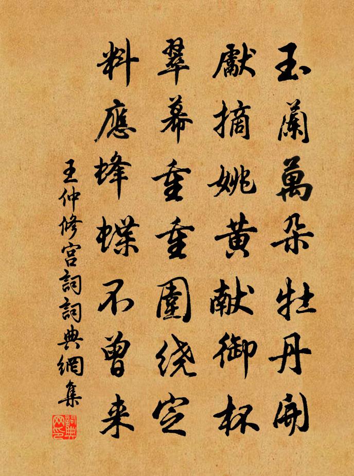 詩詞名句歷史字典書法欣賞書法字典國語詞典說文解字康熙字典古漢語字典標 題 作 者 詩 句 宮詞作者:王仲修 朝代:宋代宮詞原文玉蘭萬朵牡丹開,先摘姚黃獻御杯。翠幕重重圍繞定,料應蜂蝶不曾來。詩詞問答問:宮詞的作者是誰?答:王仲修問:宮詞寫於哪個朝代?答:宋代王仲修宮詞書法欣賞宮詞書法作品詩詞推薦題方興化塋舍趙師秀〔宋代〕使君如玉不雕鐫,可惜埋藏已十年。佳兆昔令人入夢,遺經今有子能傳。紫藤附暖應生地,蒼柏凌空欲到天。要識次韻曹好謙負春曹緯〔宋代〕作計尋芳不屬貧,可憐風物自良辰。飛花有意能留客,啼鳥多情解喚人。涉世乍驚翻捭薄,論交多語白頭新。十年七夕吟金朋說〔宋代〕銀河東達鵲橋西,織女牛郎會晤時。才得歡娛又離別,相逢擬待隔年期。加頌蜀僧雪頌釋印肅〔宋代〕庭前雪子落紛紛,妙觸靈明應普門。不是藥山無用處,權令龐老警兒孫。柳枝詞十首徐鉉〔唐代〕新春花柳競芳姿,偏愛垂楊拂地枝。天子遍教詞客賦,宮中要唱洞簫詞。東陽道旁涵碧亭劉宰〔宋代〕四山委蒼翠,一沼湛清漣。雲飛松竹留,石墮藤蘿牽。泉昔亂絲竹,鳥語賡笑言。斯亭作者誰,挽仰四百年。棟宇頌古四十五首釋慧遠〔宋代〕梵志有錢時,能肥又能白。梵志無錢時,能瘦又能黑。十字街頭立,被人喚作賊。黃巢墓釋鑒〔宋代〕圖王爭霸業,知古仗戈矛。英風今何在,都成一古丘。玉艷亭即事五首白玉蟾〔宋代〕犬見行人吠,牛尋熟路回。煙光迷碧嶂,花片點蒼苔。答陳傳道五首之四賀鑄〔宋代〕聞有高秋興,清樽醉飛鴻。應悲故人遠,薄晚面西風。寄太白隱者李洞〔唐代〕開闢已來雪,為山長欠春。高遮辭磧雁,寒噤入川人。棧閣交冰柱,耕樵隔日輪。此中棲息者,不識兩京塵。游洞霄聶兼善〔宋代〕吾聞洞霄山水妙天下,繚白縈青勝圖寫。九重扃錀極深嚴,一岫寬閒更瀟灑。倚空天柱何孤高,諸峰羅立猶兒曹。寄遠人翁卷〔宋代〕秋氣日淒清,秋衣紉未成。在家猶不樂,行路若為情。幾處好山色,暮天群雁聲。分明相憶夢,夜夜出江城。秋夜王鎡〔宋代〕桂香吹老月中秋,人在西風雁過樓。半夜枕寒清夢斷,銀河影掛玉簾鉤。題窗間墨竹胡仲弓〔宋代〕一寸毛錐當小鋤,新篁移傍野人居。難棲天上鳴陽鳳,且伴窗前剔蠹魚。大節肯隨風俯仰,數枝長帶月扶疎。此君和張文裕安寒十首司馬光〔宋代〕何處初寒好,初寒肅政台。官閒免簿領,門靜少塵埃。天借風霜氣,人無鷹隼猜。庭荒余老柏,尚有夕烏來。再和病起韻答曹仲明項安世〔宋代〕愛我空城美疢休,未蒙鍼砭若為瘳。齒疏發脫真無用,語澀行遲見寡尤。稍善知醫似高子,敢雲稱病學留侯。徑煩郭熙畫圖四詠冬雲密雪曾豐〔宋代〕湖玉幻山濁界,羞將遮肉眼,清都贏得破天顏。公收點墨輕丸玫,燠館涼台侑詩酒。海客李商隱〔唐代〕海客乘槎上紫氛,星娥罷織一相聞。只應不憚牽牛妒,聊用支機石贈君。舟上晚望庾樓董嗣杲〔宋代〕跨城作州治,陰晴巧變幻。廬峰翠色老,逐日供遠盼。白雲擘碎綿,隨地卷舒慣。春先紫煙樓,梅花雪前綻。名句推薦低花樹映小妝樓,春入眉心兩點愁。白居易《春詞》 楊枝飄泊,桃根嬌小,獨自個思量。項鴻祚《太常引·客中聞歌》 秋到邊城角聲哀,烽火照高台。陸游《秋波媚·七月十六日晚登高興亭望長安南山》 東面望者不見西牆,南鄉視者不睹北方呂不韋《呂氏春秋·覽·有始覽》 寒沙四面平,飛雪千里驚。范雲《效古詩》 鄉思不堪悲橘柚,旅遊誰肯重王孫。譚用之《秋宿湘江遇雨》 烏啼鵲噪昏喬木,清明寒食誰家哭。白居易《寒食野望吟》 平沙芳草渡頭村。綠遍去年痕。洪咨夔《眼兒媚·平沙芳草渡頭村》 圖難於其易,為大於其細老子《老子·德經·第六十三章》 一生傲岸苦不諧,恩疏媒勞志多乖。李白《答王十二寒夜獨酌有懷》