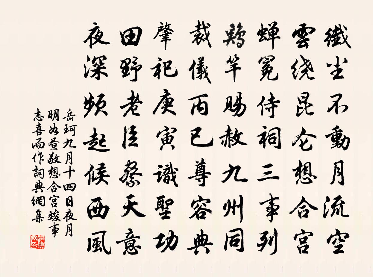詩詞名句歷史字典書法欣賞書法字典國語詞典說文解字康熙字典古漢語字典標 題 作 者 詩 句 九月十四日夜月明如晝敬想合宮竣事誌喜而作作者:岳珂 朝代:宋代原文纖塵不動月流空,雲繞崑崙想合宮。蟬冕侍祠三事列,雞竿賜赦九州同。裁儀丙已尊容典,肇祀庚寅識聖功。田野老臣察天意,夜深頻起候西風。詩詞問答問:《九月十四日夜月明如晝敬想合宮竣事誌喜而作》的作者是誰?答:岳珂問:該詩寫於哪個朝代?答:宋代書法欣賞九月十四日夜月明如晝敬想合宮竣事誌喜而作書法作品詩詞推薦【正宮】端正好_漁樂釣艇小張可久〔元代〕漁樂釣艇小苫寒波,蓑笠軟遮風雨,打魚人活計蕭疏。儂家鸚鵡洲邊住,對江景真堪趣。【滾繡球】黃蘆岸似錦鋪一半兒王鼎〔元代〕鴉瓴般水鬢似刀裁,小顆顆芙蓉花額兒窄。待不梳妝怕娘左猜。不免插金釵,一半兒蓬鬆一半兒歪。夏日山居好十首舒岳祥〔宋代〕夏日山居好,蟲鳴山更幽。青鞋紫藤杖,玉醴綠翁甌。飛露吹黃葛,涼風灑白頭。已知時雨順,更有虎狼憂。客舍喜鄭三見寄劉長卿〔唐代〕客舍逢君未換衣,閉門愁見桃花飛。遙想故園今已爾,家人應念行人歸。寂寞垂楊映深曲,長安日暮靈台宿。窮巷偶書宋祁〔宋代〕遠作分符守,猶為持橐官。易漂非待煦,自栗不須寒。發變他年素,心餘即日丹。過門休骯髒,逢路定汍瀾。忌刻觀藏珠夏竦〔宋代〕敏手機心頗自安,遮藏有路巧千般。主公當面無因見,只怕旁人冷眼看。頌古三十一首釋原妙〔宋代〕幸然無事鼓風濤,激起洪波萬丈高。直得渾家都浸殺,至今平地浪滔滔。用安之韻招君從安之正叔不疑二十六日南園為司馬光〔宋代〕真率春來頻宴聚,不過東里即西家。小園容易邀嘉家,饌具雖無亦有花。點絳唇(二之一)蘇軾〔宋代〕閒倚胡床,庾公樓外峰千朵。與誰同坐。明月清風我。別乘一來,有唱應須和。還知麽。自從添個。風月平分破。登臨海嶠初發強中作與從弟惠連見羊何共和之謝靈運〔南北朝〕杪秋尋遠山,山遠行不近。與子別山阿,含酸赴修軫。中流袂就判,欲去情不忍。顧望脰未悁,汀曲舟已隱。隱汀八聲甘州(木樨和韻)仲並〔宋代〕正西山、雨過弄晴景,竹屋貫斜暉。問誰將千斛,霏瑛落屑,吹上花枝。風外青鞋未熟,鼻觀已先知。擾損江南客送侍御帥夔府喻良能〔宋代〕千古楚東郡,風流今在茲。魯公元直道,文正不妨詩。鉗吏似束濕,麾龍如使兒。甘棠足遺愛,會有去思碑。定風波(一·瓮城)仲殊〔宋代〕南徐好,鼓角亂雲中。金地浮山星雨點,鐵城橫鎖瓮三重。開國舊夸雄。春過後,佳氣盪晴空。淥水畫橋沽酒市,戲詠村居陸游〔宋代〕歌起陂頭正插秧,梯斜籬外又劙桑。日長處處鶯聲美,歲樂家家麥飯香。林杏半丹禁宿雨,叢萱自歛避斜陽。北窗好事近(和城中諸友韻)辛棄疾〔宋代〕雲氣上林梢,畢竟非空非色。風景不隨人去,到而今留得。老無情味到篇章,詩債怕人索。卻笑近來林下,有許多送殿中楊監赴蜀見相公(杜鴻漸鎮蜀,辟楊炎為判官)杜甫〔唐代〕去水絕還波,泄雲無定姿。人生在世間,聚散亦暫時。離別重相逢,偶然豈定期。送子清秋暮,風物長年悲。豪俊贈琴客陸元章白玉蟾〔宋代〕手持一枚寒水晶,十指擊戛如玉鳴。曲彈白雪陽春調,調有高山流水聲。松梢鶴唳恰夜半,寒煙寂寂風泠泠。紙衾山中四絕句趙蕃〔宋代〕去年徂暑桃源過,今歲秋高到武夷。不遇名山一來訪,篋中寧有此山詩。夕日操王令〔宋代〕我盡日乃傾,獨何求於爾星。煜煜夕日,不尚有朝。皦皦君子,去誰繇招。死如可從,生百不聊。雜歌謠辭。李夫人歌李賀〔唐代〕紫皇宮殿重重開,夫人飛入瓊瑤台。綠香繡帳何時歇?青雲無光宮水咽。翩聯桂花墜秋月,孤鸞驚啼商絲髮。紅壁名句推薦荷花開後西湖好,載酒來時。歐陽修《採桑子·荷花開後西湖好》 鳧脛雖短,續之則憂;鶴脛雖長,斷之則悲。莊子《莊子·外篇·駢拇》 朽木不可雕也,糞土之牆不可杇也,於予與何誅?孔子弟子《論語·公冶長篇》 郎到斷橋須有路,儂住處,柳如金。張惠言《江城子·填張春溪西湖竹枝詞》 知是人家花落盡,菜畦今日蝶來多。高啟《春暮西園》 唯天下至誠,為能盡其性;能盡其性,則能盡人之性。子思《中庸·第二十二章》 江帶峨眉雪,川橫三峽流。李白《經亂離後天恩流夜郎憶舊遊書懷贈江夏韋太守良宰》 悠悠天宇曠,切切故鄉情。張九齡《西江夜行》 星垂平野闊,月涌大江流。杜甫《旅夜書懷》 力微休負重,言輕莫勸人。佚名《增廣賢文·上集》
