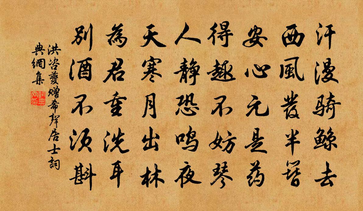 詩詞名句歷史字典書法欣賞書法字典國語詞典說文解字康熙字典古漢語字典標 題 作 者 詩 句 贈希聲居士作者:洪咨夔 朝代:宋代贈希聲居士原文汗漫騎鯨去,西風發半簪。安心元是藥,得趣不妨琴。人靜恐鳴夜,天寒月出林。為君重洗耳,別酒不須斟。詩詞問答問:贈希聲居士的作者是誰?答:洪咨夔問:贈希聲居士寫於哪個朝代?答:宋代洪咨夔贈希聲居士書法欣賞贈希聲居士書法作品詩詞推薦仲春有懷張栻〔宋代〕西湖景物元瀟灑,楊柳新來兩岸垂。亦有遊人往來否,不應閒過看花時。登劉賓客高齋(時公初退相,一作春題劉相公山齋)錢起〔唐代〕能以功成疏寵位,不將心賞負雲霞。林間客散孫弘閣,城上山宜綺季家。蝴蝶晴連池岸草,黃鸝晚出柳園花。日陪和答斯遠因梅見屬三首趙蕃〔宋代〕梅時寄我詩,梅月方能至。迢迢隔三湘,莽莽非一水。褰裳欲何之,浩蕩正如此。謁金門呂勝己〔宋代〕芳思切,舊事不堪重說。濃露凝香花噴血。花心雙蛺蝶。燕語鶯啼都歇。又過清明時節。記得離歌三兩闋。未歌先觸目陳師道〔宋代〕溪響飢魚食,川明柱影斜。驚禽穿密竹,噪鵲立浮查。谷暗山藏雨,林喧雀啅蛇。鄉閭等行路,何向更為家。古墓釋文珦〔宋代〕不知何代公侯墓,酹壇欹傾牧兒聚。淒涼翁仲滿身苔,獨對寒松泣秋雨。三游洞李石〔宋代〕危磴俯寒水,陰崖擘蒼煙。上開水雪窟,下垂珠玉淵。何時雷斧手,拓此壺中天。自然渾沌竅,不受百巧鐫。地勝渭川秋望寄右軍王特進高駢〔唐代〕長川終日碧潺湲,知道天河與地連。憑寄兩行朝闕淚,願隨流入御溝泉。訴衷情 繼古韻王丹桂〔元代〕瑞雲深處是仙家。高枕臥煙霞。調引箇中物象,玉兔配烏鴉。甘淡素,棄輕紗。遠浮華。身崇三教,心敬三光,頭摸魚兒黃升〔宋代〕問山中、小桃開後,曾經多少晴雨。遙知載酒花邊去,唱我舊歌金縷。行樂處。正蝶繞蜂圍,錦繡迷無路。風光有詩牌楊公遠〔宋代〕閒亭虛閣多標揭,舊句新篇各斗工。為拂塵埃題數語,敢期他日碧沙籠。挽陳夫人卓氏二首黃公度〔宋代〕貴不改舊習,老猶遵幼儀。安貧偕隱者,急義勝男兒。餘澗河九里,寧馨桂一枝。秋毫有遺恨,石窌剖封遲。江行阻風小市羅與之〔宋代〕弭棹黃蘆外,江雲繞柂牙。寒深身軫粟,風急浪生花。日暮人收市,年窮客念家。倚篷無可奈,忍見後歸鴉。喜雨白居易〔唐代〕西北油然雲勢濃,須臾滂沛雨飄空。頓疏萬物焦枯意,定看秋郊稼穡豐。試闈即事三絕蘇籀〔宋代〕近歲顓門不讀書,右文搜拔廣該儒。立言不朽非吾任,貪叩玄門隱者廬。六月二日乙丑濫溪大雷雨岳珂〔宋代〕人言龜夏月雨甲龜子,赤地千里真旱祥。今年六月天久亢,平疇龜坼田禾秧。農夫慟哭眼滴血,郡邑奔走焚巫尫。古劍行陳長方〔宋代〕不辨干將與莫耶,仗之使我心無邪。光芒紫氣射牛斗,知音今不乏張華。百鏈精剛鷗冶手,一仗尚能清九有。有時馮翊諺佚名〔唐代〕苦泉羊,洛水漿。呈劉子卿四首趙蕃〔宋代〕南渡六十載,況談元佑時。故家垂欲盡,遺事莽難知。文字既多舛,傳聞寧破疑。唯公有源委,萬折必東之。失調名許左之〔宋代〕誰知花有主。誤入花深處。放直下、酒杯乾、便歸去。名句推薦漢甲連胡兵,沙塵暗雲海。李白《經亂離後天恩流夜郎憶舊遊書懷贈江夏韋太守良宰》 若似月輪終皎潔,不辭冰雪為卿熱。納蘭性德《蝶戀花·辛苦最憐天上月》 青青子衿,悠悠我心。佚名《子衿》 我亦且如常日醉,莫教弦管作離聲。歐陽修《別滁》 亦有白骨歸鹹陽,營家各與題本鄉。王建《渡遼水》 取之非易,守之尤艱;智不足弗得,謀有失竟患,死生事也。來俊臣《羅織經·控權卷第四》 淡淡梅花香欲染,絲絲柳帶露初乾。曹雪芹《香菱詠月·其二》 最無端處,總把良宵,只恁孤眠卻。柳永《尾犯·夜雨滴空階》 澗戶寂無人,紛紛開且落。王維《辛夷塢》 關西老將不勝愁,駐馬聽之雙淚流。王維《隴頭吟》