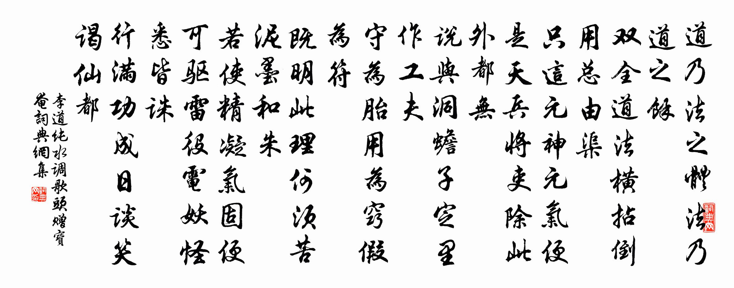 詩詞名句歷史字典書法欣賞書法字典國語詞典說文解字康熙字典古漢語字典標 題 作 者 詩 句 水調歌頭 贈寶奄作者:李道純 朝代:元代水調歌頭 贈寶奄原文道乃法之體,法乃道之餘。雙全道法,橫拈倒用總由渠。只這元神元氣,便是天兵將吏,除此外都無。說與洞蟾子,定里作工夫。守為胎,用為竅,假為符。既明此理,何須苦泥墨和朱。若使精凝氣固,便可驅雷役電,妖怪悉皆誅。行滿功成日,談笑謁仙都。詩詞問答問:水調歌頭 贈寶奄的作者是誰?答:李道純問:水調歌頭 贈寶奄寫於哪個朝代?答:元代問:水調歌頭 贈寶奄是什麼體裁?答:詞李道純水調歌頭 贈寶奄書法欣賞水調歌頭 贈寶奄書法作品詩詞推薦春日郊居黃庚〔宋代〕卜築幽居慰寂寥,數椽茅屋傍江郊。庭前滕薛筍爭長,籬下陳雷蔓結交。杏圃花香蜂課蜜,芹塘泥暖燕營巢。山窗小韓店寇準〔宋代〕昔從鄴下游梁苑,孤店曾經十數回。歲月暗移人事改,白頭重到小韓來。論語絕句一百首張九成〔宋代〕孔子於仁論不違,回心三月亦如之。不違乃是回心事,心事如何子得知。雲入窗牖徐僑〔宋代〕白雲入戶牖,幽趣頗相關。俗遠人無累,心夷物自閒。權勢張耒〔宋代〕權勢世所重,桓溫役孟嘉。桓公自人雄,為下未足嗟。頗怪蔡中郎,為董受疵瑕。因之以取死,曾不念漢家。士固湘浦有懷李鹹用〔唐代〕鴻雁哀哀背朔方,餘霞倒影畫瀟湘。長汀細草愁春浪,古渡寒花倚夕陽。鬼樹夜分千炬火,漁舟朝卷一蓬霜。儂家海棠花董嗣杲〔宋代〕鸚柔猩艷勝西川,有色無香意態妍。吟令美招名友聚,眠春羞並醉妃傳。錦莊紅濯垂絲雨,繡幄青籠秉燭煙。莫待菩薩蠻(六軍閱罷,犒飲兵將官)王安中〔宋代〕中軍玉帳旌旗繞。吳鉤錦帶明霜曉。鐵馬去追風。弓聲驚塞鴻。分兵閒細柳。金字回飛奏。犒飲上恩濃。燕然思勒回至泰陽村得家信二首張鎡〔宋代〕桂隱聞知得雨來,榴花應對竹光開。歸家早見南湖月,飲水猶勝舉酒杯。春日閒賦許月卿〔宋代〕數行竹樹鳴春雨,一簇人家帶曉煙。省事山丹自籬落,親人海燕並庭檐。樓高思遠天無極,酒罷歌闌月正圓。新茗浙西園苑方回〔宋代〕壁間墨客掃龍蛇,所寫詩佳字亦佳。忽見一詩增感慨,吾家宗伯老秋崖。明水寺范應鈴〔宋代〕環山清淺一溪水,夾徑高低十里松。煙鎖石門疑路斷,斜陽影裹忽聞鍾。和景仁噴玉潭司馬光〔宋代〕昨朝景氣如暑天,僮僕流汗衣裘單。安知向曉暴風作,一變陽春成大寒。此時結友尋名山,伶俜徒步水石間。棘刺高宗郊前朝獻景靈宮二十一首真宗〔宋代〕瑤源誕民,玉牒筆榮。覆育群有,監觀圓清。酒一既洽,登薦惟誠。無有後艱,駿惠雲仍。次韻十絕染須樓鑰〔宋代〕染須欲學少年時,笑殺當年榮啟期。公道世間惟此耳,年來猶幸不相欺。六一泉董嗣杲〔宋代〕離別孤山十八年,重來忍見講堂泉。當時同出師門下,今日多傷井屋前。取重歐公名有自,肯教勤老跡空傳。此銘送蘇參軍戎昱〔唐代〕憶昨青襟醉里分,酒醒回首愴離群。舟移極浦城初掩,山束長江日早曛。客來有恨空思德,別後誰人更議文。常嘆月夜江行寄崔員外宗之李白〔唐代〕飄飄江風起,蕭颯海樹秋。登艫美清夜,掛席移輕舟。月隨碧山轉,水合青天流。杳如星河上,但覺雲林幽。歸路行次下渚湖二首張鎡〔宋代〕綿遷蒼岫補林空,菱荇通船萬鏡中。黃白花明如繡出,蜻蜓猶愛蓼成叢。梅張鎡〔宋代〕冒寒崗路透溪橋,驢仆翩翩葉亂飄。還是去年初見處,青旗茅店恰相招。名句推薦雲鬢花顏金步搖,芙蓉帳暖度春宵。白居易《長恨歌》 空山新雨後,天氣晚來秋。王維《山居秋暝》 人情送匹馬,買賣不饒針!佚名《增廣賢文·下集》 窮且益堅,不墜青雲之志。王勃《滕王閣序》 何日歸家洗客袍?銀字笙調,心字香燒。蔣捷《一剪梅·舟過吳江》 萬里傷心嚴譴日,百年垂死中興時。杜甫《送鄭十八虔貶台州司戶傷其臨老陷賊之故闕為面別情見於詩》 君看石芒碭,掩淚悲千古李白《丁督護歌》 興,百姓苦;亡,百姓苦!張養浩《山坡羊·潼關懷古》 善有善報,惡有惡報。佚名《增廣賢文·上集》 是無貓邪,是不會蓄貓也。樂鈞《世無良貓》