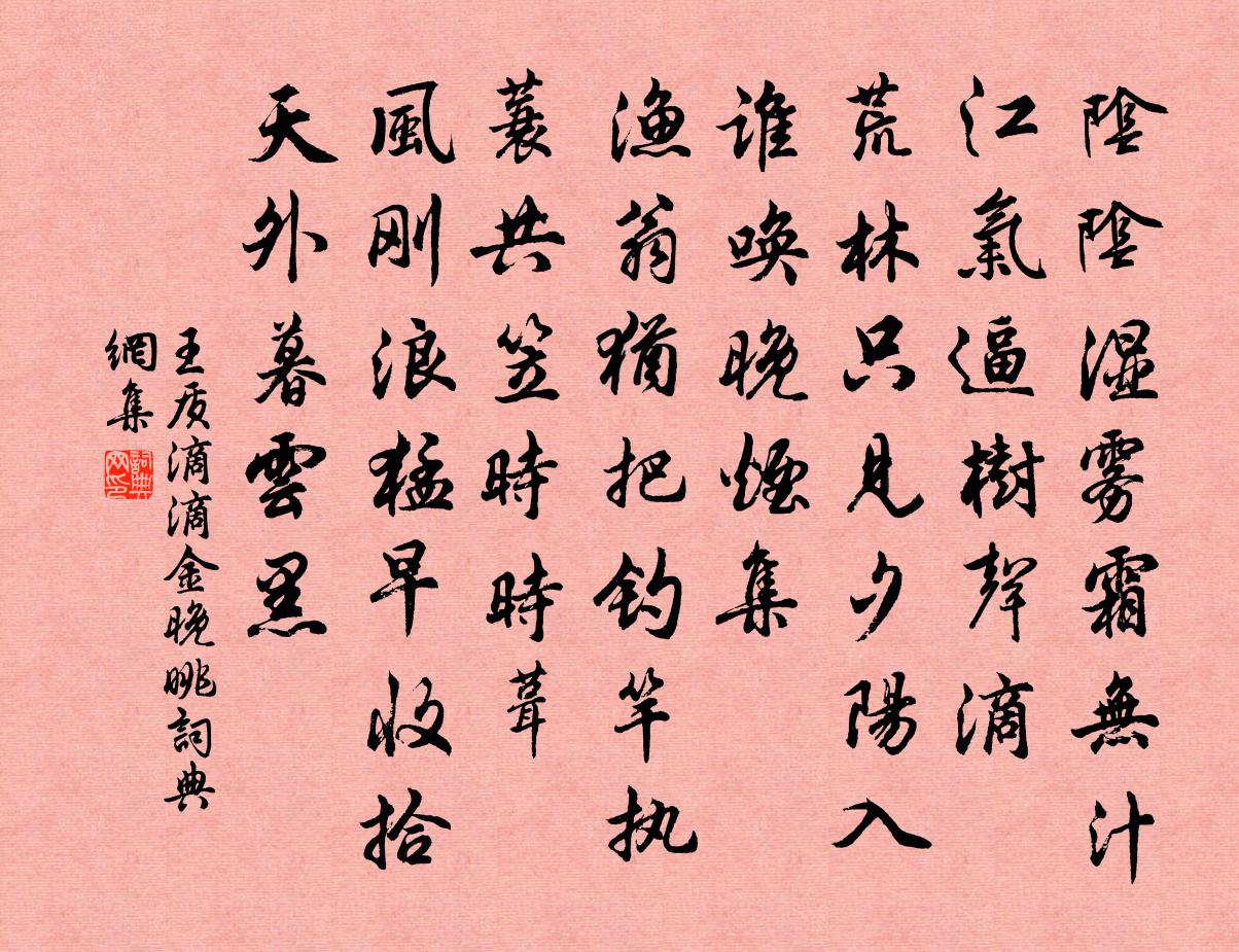 詩詞名句歷史字典書法欣賞書法字典國語詞典說文解字康熙字典古漢語字典標 題 作 者 詩 句 滴滴金(晚眺)作者:王質 朝代:宋代滴滴金(晚眺)原文陰陰濕霧霜無汁。江氣逼、樹聲滴。荒林只見夕陽入。誰喚晚煙集。漁翁猶把釣竿執。蓑共笠、時時葺。風剛浪猛早收拾。天外暮雲黑。詩詞問答問:滴滴金(晚眺)的作者是誰?答:王質問:滴滴金(晚眺)寫於哪個朝代?答:宋代問:滴滴金(晚眺)是什麼體裁?答:詞王質滴滴金(晚眺)書法欣賞滴滴金(晚眺)書法作品詩詞推薦句李琪〔唐代〕哀痛不下詔,登封誰上書。金陵阻風登延祚閣許渾〔唐代〕極目皆陳跡,披圖問遠公。戈鋋三國後,冠蓋六朝中。葛蔓交殘壘,芒花沒後宮。水流簫鼓絕,山在綺羅空。極浦呂司空輓詞三首蘇轍〔宋代〕罷郡來清潁,微官憶宛丘。頹垣那可住,隱几若將休。復起民欣願,全歸天不留。世間反覆手,有德竟無憂。謾題陳宓〔宋代〕胸襟但貯五千卷,意慮曾無分寸私。嘆老嗟卑真淺士,古人心事有誰知。正月二十八日夜大雪尤袤〔宋代〕一冬無雪潤田疇,渴井泉源凍不流。昨夜忽飛三尺雪,今年須兆十分秋。占時父老應先喜,忍凍饑民莫漫愁。晴色武陵春日王建〔唐代〕尋春何事卻悲涼,春到他鄉憶故鄉。秦女洞桃欹澗碧,楚王堤柳舞煙黃。波濤入夢家山遠,名利關身客路長。不似奪錦標 君卿宣慰來別,索鄙作贐行,賦樂府王惲〔元代〕歌之,六朝老樹不無動色也六郡雄藩,會稽旁帶,雨浙風煙如昔。碧草莫傷春浦,冠蓋東南,幾多行客。正新亭父頌古一百二十一首釋宗杲〔宋代〕啞子得夢與誰說,起來相對眼麻彌。已向人前輪肺府,從教他自覓便宜。離無錫夜入溪莊港口張鎡〔宋代〕出川猶自雨隨車,到得溪橋一點無。冷月半明雲未去,垂楊成行葉全枯。竹添東野方清蔭,人在南湖已白須。應是送友人上峽赴東川辟命白居易〔唐代〕見說瞿塘峽,斜銜灩澦根。難於尋鳥路,險過上龍門。羊角風頭急,桃花水色渾。山回若鰲轉,舟入似鯨吞。岸合安靜堂書事蔡襄〔宋代〕勿學異世人,過常不可深。勿學慢世人,側身隨浮沈。白日當中天,難破是非心。不有拔俗器,安得太古音。大暑喜晴曹彥約〔宋代〕捷書遲報已驚神,不分龍公巧障人。傾倒從頭慳澀雨,破除當面艷陽春。有園未賞陰連屋,無地言歸水拍津。報導足弱二首姜特立〔宋代〕腳力雖雲弱,心靈尚宛然。休輕刖孫臏,猶解殺龐涓。藤州道上李孟博〔宋代〕道上何嘗識故侯,解鞍聊發小遲留。莫向漳江更南望,四十八驛是藤州。七年十二日夜登清心閣曹勛〔宋代〕小樓秋夜明月底,仰不見天惟見水。岸巾獨立四無人,白月青天伴陽子。誰知橫玉作秋聲,一聲吹盡九陌塵。月輪宮詞三十三首曹勛〔宋代〕連年逆虜斷侵凌,聖連當天日正升。頂相如山知美讖,紹隆火德即中興。陌上花八首晁補之〔宋代〕娘子歌傳樂府悲,當年陌上看芳菲。曼聲更緩何妨緩,莫似東風火急歸。水調歌頭 送王子初之太原王惲〔元代〕將軍報書切,高臥起螭蟠。悲歡離合常事,知己古為難。憶昔草廬人去,鬱郁風雲英氣,千載到君還。歌吹展江底龍州韋郎中先夢六赤後因打葉子以詩上李洞〔唐代〕紅蠟香菸撲畫楹,梅花落盡庾樓清。光輝圓魄銜山冷,彩鏤方牙著腕輕。寶帖牽來獅子鎮,金盆引出鳳凰傾。微黃早梅李龍高〔宋代〕賈少難逃賦鵩災,終童不載使纓回。只須浪作爭春態,留取孤芳殿後開。名句推薦此身行作稽山土,猶吊遺蹤一泫然。陸游《沈園二首》 地勢,坤;君子以厚德載物。佚名《易傳·象傳上·坤》 望斷金馬門,勞歌采樵路。孟浩然《田園作》 志士不忘在溝壑,勇士不忘喪其元。孟子《孟子·滕文公章句下·第一節》 我行殊未已,何日復歸來。宋之問《題大庾嶺北驛》 正江令恨別,庾信愁賦劉辰翁《蘭陵王·丙子送春》 不將辛苦意,難近世間財。馮夢龍《醒世恆言·卷十四》 昔在零陵厭,神器若無依。何遜《行經孫氏陵》 檻菊愁煙蘭泣露。羅幕輕寒,燕子雙飛去。晏殊《蝶戀花·檻菊愁煙蘭泣露》 卻下水晶簾,玲瓏望秋月。李白《玉階怨》