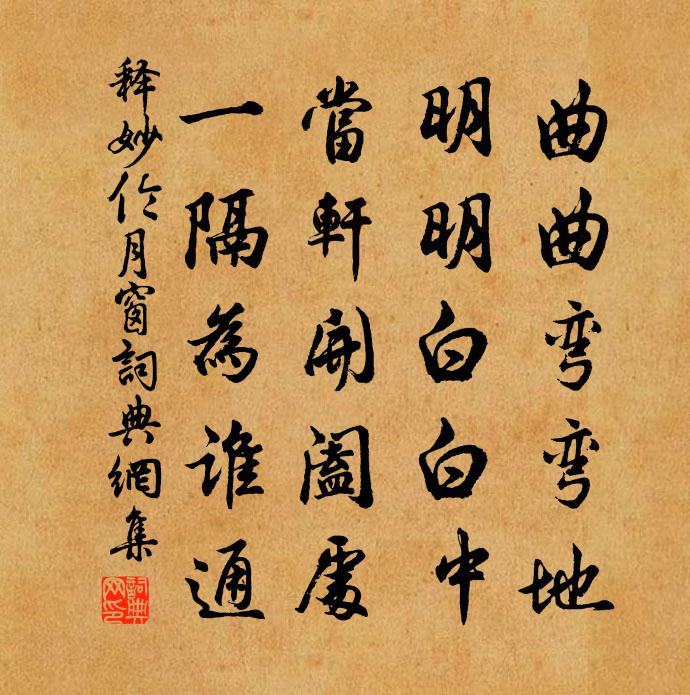 詩詞名句歷史字典書法欣賞書法字典國語詞典說文解字康熙字典古漢語字典標 題 作 者 詩 句 月窗作者:釋妙倫 朝代:宋代月窗原文曲曲彎彎地,明明白白中。當軒開闔處,一隔為誰通。詩詞問答問:月窗的作者是誰?答:釋妙倫問:月窗寫於哪個朝代?答:宋代釋妙倫月窗書法欣賞月窗書法作品詩詞推薦折柳林洪〔宋代〕湖邊楊柳色如金,幾日不來成綠陰。折得柔條入城去,教人知道已春深。同前太行皇太后輓詞二首周必大〔宋代〕憶昨登中壽,梅觴慶九重。回春方晝永,月掩遽雲濃。鐘鼓沈長樂,蠶桑罷濯龍。宣仁遺懿在,定謚獨追蹤。向伯恭薌林詩王銍〔宋代〕楚人喻薌草,可佩復可食。靈均楚同姓,放逐去其國。皎皎忠良心,惕惕懼讒賊。扁舟下滄浪,魂迷招不得。至今和潘叔治題劉道士房畫薛稷六鶴圖六首其三唳梅堯臣〔宋代〕引吭向層霄,聲聞期在耳。鼓吻意豈疏,知音何已矣。安得九皋同,流響入萬里。送知久禪者釋重顯〔宋代〕霜竹凝寒攜九節,銅瓶浪鎖千溪月。天上人間不自知,行行誰共分清絕。和之美諷古二首司馬光〔宋代〕曲逆從漢祖,出奇誰與讓。一朝寄天下,不及王陵戇。登凌歊台許棠〔唐代〕平蕪望已極,況復倚凌歊。江截吳山斷,天臨楚澤遙。雲帆高出樹,水市迥分橋。立久斜陽盡,無言似寂寥。題豐穎樓陳宓〔宋代〕壽溪百里薦寒流,來護楊君少尹丘。三復先公當日翰,重修處士舊時樓。高山不減八千仞,往事空餘五十秋。闢作鳳皇台倪垕〔宋代〕鳳皇凰皇幾千載,鳳皇已去台空在。應多燕雀語畫梁,瞥見蛟龍起滄海。二十年前曾來游,野田白鷺涵清秋。今夕和徐季功舒蘄道中二十首王之道〔宋代〕一夜西風作曉晴,紛然花草斗欣榮。蒼松巧與天桃並,漫使詩人意不平。送徐仲洪尉南安八首彭龜年〔宋代〕催科莫作擾人看,趁此登場早了官。坐視貪殘敗吾子,不如自放一分寬。乙巳邵武建寧夜坐書呈諸公陳普〔宋代〕一合乾坤貯鬼神,入虛何敢謂無人。暗中射鮒誰知見,繞市青衣說與人。送洪景之循州參軍秦觀〔宋代〕寒梅不自重,輒花桃李先。矯枉有佳菊,最後眾芳妍。各因一時美,難以相嗤憐。物理固若是,士林亦宜然。夫子約餘明遠董嗣杲〔宋代〕靜極占鴉鵲,閒來棄簡書。風停思晚醉,泥軟便春耡。透屋哀歌切,懷人吉夢疏。餘樽須共倒,莫惜過吾廬。次韻黃侍郎滄江海棠六絕魏了翁〔宋代〕指麾紅紫思無濱,抵當丹青筆有神。百樹花閒一編易,主人意韻鎮長新。過玉山東三塘五首楊萬里〔宋代〕身行衢信兩中間,夾路尖峰面面寒。只道秋山似春筍,不知春筍似秋山。奉和武功學士舍人紀贈文懿大師淨公徐鉉〔唐代〕往往冥搜宵不寐,時時任性晝仍眠。高情麗句誰偏重,新地詞臣李謫仙。偶書二首方回〔宋代〕一昨懸車後,蹉跎又五年。常書乞米帖,猶費買花錢。諸人頗有和余百梅詩者各賦一首劉克莊〔宋代〕每抱懷中玉雪如,吳霜不覺點虬須。生三槐裔皆當貴,為六梅孫莫太臞。抹黛村眉慚醜怪,約黃宮額費妝塗。南園和李中丞與李給事山居雪夜同宿小酌白居易〔唐代〕憲府觸邪峨豸角,瑣闈駁正犯龍鱗。[二人當官盛事,為時所稱也。]那知近地齋居客,忽作深山同宿人。一盞寒名句推薦長於春夢幾多時,散似秋雲無覓處。晏殊《木蘭花·燕鴻過後鶯歸去》 不作無益害有益,功乃成;不貴異物賤用物,民乃足。佚名《尚書·周書·旅獒》 憶年十五心尚孩,健如黃犢走復來。杜甫《百憂集行》 後不乏人,榮之方久,賢者自苦亦惠嗣。來俊臣《羅織經·固榮卷第六》 不要人夸顏色好,只留清氣滿乾坤。王冕《墨梅》 一節見則百節知矣。劉向《說苑·尊賢》 重五山村好,榴花忽已繁。陸游《乙卯重五詩》 思婦高樓上,當窗應未眠。徐陵《關山月》 姑蘇台上烏棲時,吳王宮裡醉西施。李白《烏棲曲》 好一似食盡鳥投林,落了片白茫茫大地真乾淨。曹雪芹《紅樓夢·第五回》