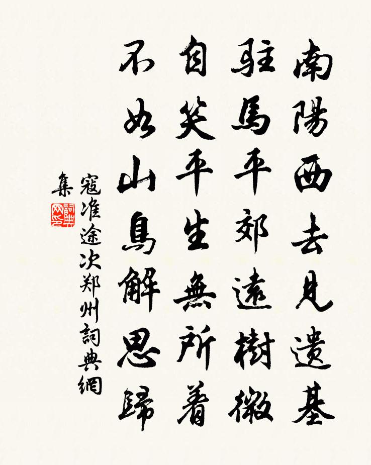 詩詞名句歷史字典書法欣賞書法字典國語詞典說文解字康熙字典古漢語字典標 題 作 者 詩 句 途次鄭州作者:寇準 朝代:宋代途次鄭州原文南陽西去見遺基,駐馬平郊遠樹微。自笑平生無所著,不如山鳥解思歸。詩詞問答問:途次鄭州的作者是誰?答:寇準問:途次鄭州寫於哪個朝代?答:宋代問:寇準的名句有哪些?答:寇準名句大全寇準途次鄭州書法欣賞途次鄭州書法作品詩詞推薦閒吟釋行海〔宋代〕不識朱門識五湖,客中清苦十年余。世無苟取心何愧,句自冥搜貌任癯。筍蕨春來肥雨露,林泉日用狎樵漁。雲蹤樂府雜曲。鼓吹曲辭。臨高台褚亮〔唐代〕高台暫俯臨,飛翼聳輕音。浮光隨日度,漾影逐波深。回瞰周平野,開懷暢遠襟。獨此三休上,還傷千歲心。鷓鴣天黃庭堅〔宋代〕句耳。”因以玄真子遺事足之。憲宗時,畫玄真子像,訪之江湖,不可得,因令集其歌詩上之。玄真之兄松齡,懼梅花喜神譜就實六枝宋伯仁〔宋代〕醉帽不輕飛,秋菊有佳色。自慚群座中,主人猶未識。春圃六言三首劉子翬〔宋代〕小凍猶殘柳雪,新□□□□□。□□□□□□,□酒時須一中。【南呂】一枝花_詠惜花春起佚名〔元代〕詠惜花春起早花間杜宇啼,柳外黃鶯囀。銀河青耿耿,玉露滴涓涓。潛入花園,露濕殘妝面,風吹雲髻偏。畫閣內雪後黃樓寄負山居士陳師道〔宋代〕林廬煙不起,城郭歲將窮。雲日明松雪,溪山進冕風。人行圖畫裡,鳥度醉吟中。不盡山陰興,天留憶戴公。詠史上田疇陳普〔宋代〕徐元宛似歷山中,義氣從間窄不容。不為犬羊殘士類,肯教曹操識盧龍。蝶戀花黃裳〔宋代〕忽送林光禽有語。飛如遙空,失素歸洲鷺。照處無私清望富。餘輝不惜人人與。玉繩欲到中天路。且待飛觴,緩緩送周仲固寺正提舉湖北茶鹽餘建炎己酉歲嘗為曾幾〔宋代〕洞庭湖北飽知聞,嘗以輶軒犯楚氛。遠有光華新令尹,分投閒散故將軍。武陵源口自碧水,古德山頭多白雲。一路送道者朝見後歸山殷文圭〔唐代〕暫隨蒲帛謁金鑾,蕭灑風儀傲漢官。天馬難將朱索絆,海鰲寧覺碧濤寬。松壇月作尊前伴,竹篋書為教外歡。神鼎和建國小韻呈趙求仁使君劉黻〔宋代〕浦出西江有此名,道源澄湛自天成。屋頭松樹年多少,曾識濂溪授二程。哭?十五章辛棄疾〔宋代〕淚盡眼欲枯,痛深腸已絕。汝方游浩蕩,萬里挾雄鐵。用前韻再和許朝奉蘇軾〔宋代〕高門元世舊,客路晚追游。清絕聞詩語,疏通豈法流。傳家有衣缽,斷獄盡春秋。邂逅陪車馬,尋芳謝朓洲。淒涼奉寄田上人仇遠〔宋代〕竹筇輕健草鞋寬,野外消磨半日閒。病葉已霜猶蠻樹,片雲欲雨又歸山。燈分寺塔晴偏見,水隔漁家夜不關。愧我奉酬於中丞登越王樓見寄之什楊牢〔唐代〕劍外書來日,驚忙自折封。丹青得山水,強健慰心胸。事少勝諸郡,江回見幾重。寧悲久作別,且似一相逢。詩合登吳古城歌劉長卿〔唐代〕登古城兮思古人,感賢達兮同埃塵。望平原兮寄遠目,嘆姑蘇兮聚麋鹿。黃池高會事未終,滄海橫流人盪覆。伍員送彭子山提刑郎中赴召二首楊萬里〔宋代〕帝想丹青憶老成,公兼竹潤更蘭馨。獨追洙泗人無訟,再使成康世措刑。召節自天回使節,即星朝斗作台星。花邊和陶淵明飲酒詩滕岑〔宋代〕佛氏苦戒酒,詳見所譯經。謂人諸罪業,多以酒故成。酒豈能造罪,心為物變更。心空罪亦空,徑造金仙庭。今我偈頌一百二十三首釋崇岳〔宋代〕深聞淺悟,三更問路。深悟淺聞,痛處遭針。胡盧子,放教沉。莫將閒學解,埋沒祖師心。名句推薦舊曲梅花唱,新正柏酒傳。孟浩然《歲除夜會樂城張少府宅》 風雨牢愁無著處,那更寒蛩四壁。文天祥《酹江月·和友驛中言別》 親朋無一字,老病有孤舟。杜甫《登岳陽樓》 千雷萬霆,激繞其身,霰雪雨雹,一時皆下。李朝威《柳毅傳》 榴葉擁花當北戶,竹根抽筍出東牆。湯允績《浣溪沙·燕壘雛空日正長》 騎牛遠遠過前村,短笛橫吹隔隴聞。黃庭堅《牧童詩》 明月松間照,清泉石上流。王維《山居秋暝》 表獨立兮山之上,雲容容兮而在下;屈原《九歌》 料峭春寒中酒,交加曉夢啼鶯。吳文英《風入松·聽風聽雨過清明》 其山水揀乳泉、石池漫流者上;其瀑涌湍漱,勿食之。陸羽《茶經·五之煮》