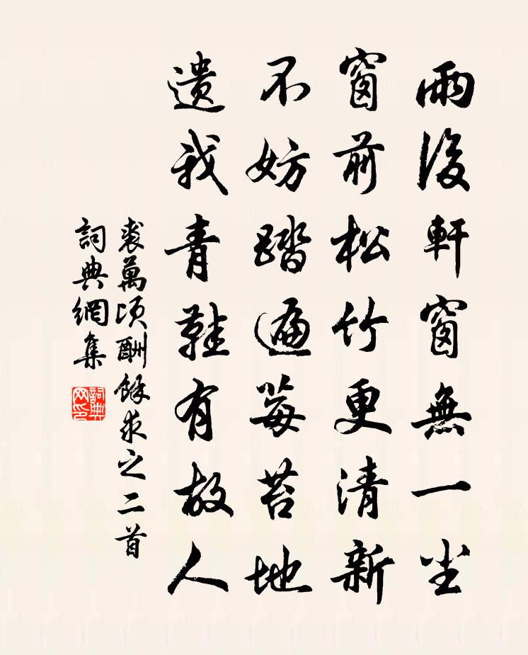 詩詞名句歷史字典書法欣賞書法字典國語詞典說文解字康熙字典古漢語字典標 題 作 者 詩 句 酬余求之二首作者:裘萬頃 朝代:宋代酬余求之二首原文雨後軒窗無一塵,窗前松竹更清新。不妨踏遍莓苔地,遺我青鞋有故人。詩詞問答問:酬余求之二首的作者是誰?答:裘萬頃問:酬余求之二首寫於哪個朝代?答:宋代裘萬頃酬余求之二首書法欣賞酬余求之二首書法作品詩詞推薦菩薩蠻(十之一)鄧肅〔宋代〕隔窗瑟瑟聞飛雪。洞房半醉回春色。銀燭照更長。羅屏圍夜香。玉山幽夢曉。明日天涯杳。倚戶黯芙蓉。涓涓秋露【雙調】新水令_攪閒風吹散關漢卿〔元代〕攪閒風吹散楚台天,天對付滿懷愁悶。您那裡歡娛嫌夜短,俺寂寞恨長更。恰似線斷風箏,絕魚雁杳音信。【駐馬送友人之峽李群玉〔唐代〕東吳有賦客,願識陽台仙。彩毫飛白雲,不減郢中篇。楚水五月浪,輕舟入暮煙。巫雲多感夢,桂楫早迴旋。贈黃愉項安世〔宋代〕三命盤中水火煎,五星局上計羅纏。天公賦與元如此,歷叟欺諛謂不然。一紙向人胡似鏡,平生惟爾直如弦。更持俸金既盡家人問所質物戲答韓元吉〔宋代〕十載棲遲櫑具客,一生憔悴扊扅歌。典衣不為沽春酒,平昔無詩博飯籮。小韓店寇準〔宋代〕昔從鄴下游梁苑,孤店曾經十數回。歲月暗移人事改,白頭重到小韓來。感夢韋應物〔唐代〕歲月轉蕪漫,形影長寂寥。仿佛覯微夢,感嘆起中宵。綿思靄流月,驚魂颯回飆。誰念茲夕永,坐令顏鬢凋。安南觀棋李思衍〔宋代〕地席跏趺午坐涼,棋邊袖手看人忙。檳榔{左月右若}□又春綠,送到誰家橘柚香。聽客話二首方回〔宋代〕客言亂時事,可駭不堪聞。田主戕凶佃,民妻掠亂軍。草高城裡屋,樹赭壠頭墳。降盜多珍賄,人傳大將分。山中古祠張籍〔唐代〕春草空祠墓,荒林唯鳥飛。記年碑石在,經亂祭人稀。野鼠緣朱帳,陰塵蓋畫衣。近門潭水黑,時見宿龍歸。尋徐道士張籍〔唐代〕尋師遠到暉天觀,竹院森森閉藥房。聞入靜來經七日,仙童檐下獨焚香。偈頌一百四十一首釋師範〔宋代〕老胡半夜見明星,瞎卻平生兩眼晴。直至如今無摸索,一回舉著一傷情。吳正仲同諸賓泛舟歸池上梅堯臣〔宋代〕輕舟與客歸,竹下閒棋局。煮鱟吳味新,篘醪楚釀熟。風吹山雨來,冷射膚生粟。醉昏笑語同,不看西齋錄。聽多美唱歌李涉〔唐代〕黃鶯慢轉引秋蟬,沖斷行雲直入天。一曲梁州聽初了,為君別唱想夫憐。減字木蘭花蘇軾〔宋代〕惟熊佳夢。釋氏老君親抱送。壯氣橫秋。未滿三朝已食牛。犀錢玉果。利市平分沾四坐。多謝無功。此事如何到得駕幸太學秦觀〔宋代〕原廟初更十二章,還輿詔蹕幸諸庠。法天辟水遙迎仗,應月深衣不亂行。風動四夷將遣子,禮行三舍遂賓王。前知同張將薊門觀燈孟浩然〔唐代〕異俗非鄉俗,新年改故年。薊門看火樹,疑是燭龍燃。春秋戰國門孫武周曇〔唐代〕理國無難似理兵,兵家法令貴遵行。行刑不避君王寵,一笑隨刀八陣成。遣興七首李流謙〔宋代〕舞空三尺雪,笑指玉如泥。早日羞屠狗,窮途悔射鼷。掛心無妄念,省分有幽棲。舌在何須問,端憂愧老妻。白頭吟一首王銍〔宋代〕浮雲高映天上月,月華未落雲已滅。濁水長羨清路塵,濁水尚流塵已絕。人心不如雲與塵,變態無窮旋消歇。我家名句推薦矮紙斜行閒作草,晴窗細乳戲分茶。陸游《臨安春雨初霽》 曉月過殘壘,繁星宿故關。司空曙《賊平後送人北歸》 荒戍落黃葉,浩然離故關。溫庭筠《送人東遊》 少年心事當拿雲,誰念幽寒坐嗚呃。李賀《致酒行》 力拔山兮氣蓋世。時不利兮騅不逝。項羽《垓下歌》 庭花蒙蒙水泠泠,小兒啼索樹上鶯。貫休《春晚書山家屋壁二首》 水風輕,蘋花漸老,月露冷、梧葉飄黃。柳永《玉蝴蝶·望處雨收雲斷》 行到水窮處,坐看雲起時。王維《終南別業 / 初至山中 / 入山寄城中故人》 豹死留皮,人死留名。歐陽修《新五代史·列傳·死節傳第二十》 枕前何事最傷情?梧桐葉上,點點露珠零。尹鶚《臨江仙·深秋寒夜銀河靜》