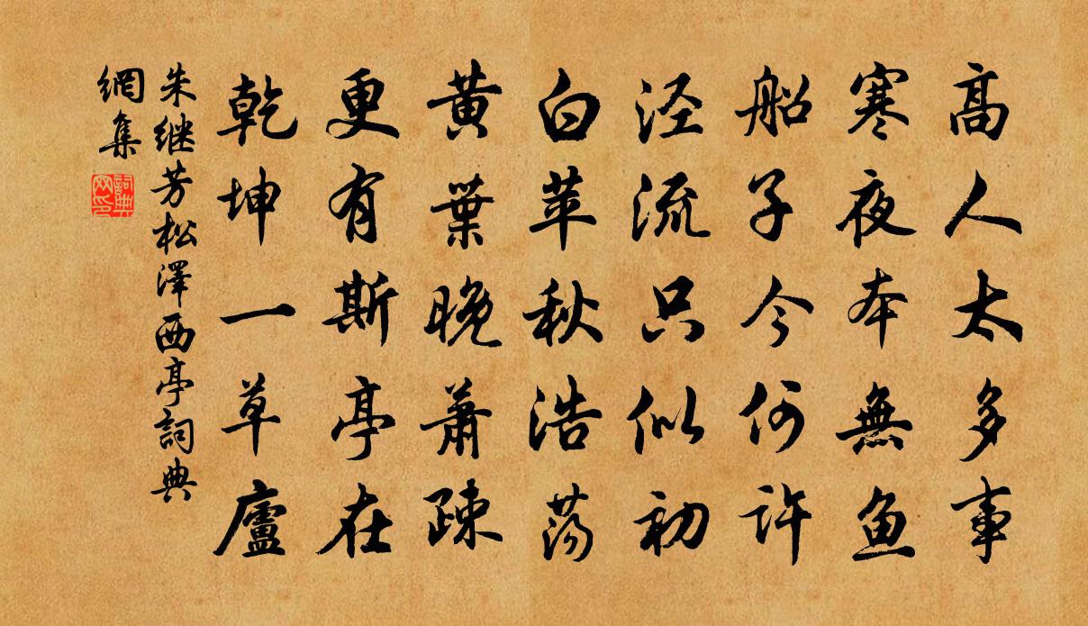 詩詞名句歷史字典書法欣賞書法字典國語詞典說文解字康熙字典古漢語字典標 題 作 者 詩 句 松澤西亭作者:朱繼芳 朝代:宋代松澤西亭原文高人太多事,寒夜本無魚。船子今何許,涇流只似初。白苹秋浩蕩,黃葉晚蕭疎。更有斯亭在,乾坤一草廬。詩詞問答問:松澤西亭的作者是誰?答:朱繼芳問:松澤西亭寫於哪個朝代?答:宋代朱繼芳松澤西亭書法欣賞松澤西亭書法作品詩詞推薦壽徐倉使黃垺〔宋代〕四明山水遠且清,秀氣鍾作千人黃。南州高士真濟美,天地正粹涵中襟。學問淵源派伊洛,文章典麗鏗{徑去彳加睡起三絕岳珂〔宋代〕睡起東窗日已紅,扶頭宿酒未惺松。南陽一夢何關醉,自愛終身作臥龍。和董庶中古散調詞贈尹果毅劉禹錫〔唐代〕昔聽東武吟,壯年心已悲。如何今濩落,聞君辛苦辭。言有窮巷士,弱齡頗尚奇。讀得玄女符,生當事邊時。借名後坡徐僑〔宋代〕扶筇剝啄一山中,幽興偏於此處濃。前屏樹柯呈列岫,旁開林隙出奇峰。座迎夜月分吾石,樽度朝雲對汝松。俗客病中絕句范成大〔宋代〕夜合梢頭蘸紫茸,菉蔥頂上拆黃封。去年團扇題詩處,依舊疏簾細雨中。詩一首盧革〔宋代〕疊嶂最驚目,排青隱星絡。雙溪頗醒心,激素出林薄。家書方回〔宋代〕倚樓閒看雨,已下又重登。困和春深劇,愁逢日暮增。家書聞子病,時事說兵興。流汗才揮扇,風寒忽似冰。題潤州甘露寺張祜〔唐代〕千重構橫險,高步出塵埃。日月光先見,江山勢盡來。冷雲歸水石,清露滴樓台。況是東溟上,平生意一開。喜雪二首吳潛〔宋代〕黃竹歌中百姓歡,去天近處雪花乾。蔡洄事業方歸度,剡曲風流欲訪安。便覺光輝生萬里,定知潤澤被三韓。衰頹再游張鎡〔宋代〕天風吹我落人間,暫入青山又促還。待得霜林收柿栗,卻來重扣白雲關。送人游並汾韋莊〔唐代〕風雨蕭蕭欲暮秋,獨攜孤劍塞垣游。如今虜騎方南牧,莫過陰關第一州。湯孺人輓詞周必大〔宋代〕嘆息閨房秀,霜摧鬢未華。女功丞相念,婦道里人嗟。石窌脂田廢,濤江粉旐斜。西風看花淚,寂寞小窗紗。別周尚書弘正詩庾信〔南北朝〕扶風石橋北。函谷故關前。此中一分手。相逢知幾年。黃鵠一反顧。徘徊應愴然。自知悲不已。徒勞減瑟弦。旅情周賀〔唐代〕黃葉下階頻,徐徐起病身。殘秋螢出盡,獨夜雁來新。別業去千里,舊鄉空四鄰。孤舟尋幾度,又識岳陽人。陳橋王安石〔宋代〕走馬黃昏渡河水,夜爭歸路春風裡。指點韋城太白高,投鞭日午陳橋市。楊柳初回陌上塵,煙脂洗出杏花勻。紛紛齋宿淨明寺小飲易安齋口占喻良能〔宋代〕淨明齋宿近初庚,西蜀東吳一世英。行徑九盤山犖确,流泉百折玉琮琤。頻飛兕斝顏俱渥,細聽犀談座為傾。觴詠洪慶善郎中輓詩四首葛立方〔宋代〕閹茂之年拜伏犀,雞豚同社記金溪。情深縞紵論六契,義切蓬麻荷品題。花底醉春同挈榼,雲中歷妙共扶藜。豈知待旦吟二首曹勛〔宋代〕彼幽人兮何所思,憂耿耿兮天一涯。舉家親屬散百草,關山萬里難追隨。更長不寐聽鳴柝,寒風蕭瑟如淒悲。安得王侍講原叔輓詞三首梅堯臣〔宋代〕衣冠今盛族,蘭玉舊家聲。博古無遺悞,遭時有重名。魂輿臨水發,靈馬向郊鳴。歸葬商丘外,森森柏已成。少年子釋行海〔宋代〕馬頭垂柳復垂楊,日暖遊絲滿洛陽。賤把黃金買歌笑,不知流水去茫茫。名句推薦朝雲亂人目,帝女湘川宿。吳均《登二妃廟》 峻法,所以凌過游外私也;嚴刑,所以遂令懲下也。韓非及後人《韓非子·有度》 男兒何不帶吳鉤,收取關山五十州。李賀《南園十三首·其五》 更落盡梨花,飛盡楊花,春也成憔悴。汪元量《鶯啼序·重過金陵》 大難不死,必有後祿。馮夢龍《喻世明言·卷二十一》 秋色冷並刀,一派酸風卷怒濤。陳維崧《南鄉子·邢州道上作》 不知近水花先發,疑是經冬雪未銷。張謂《早梅》 地冷葉先盡,谷寒雲不行。李白《冬日歸舊山》 新豐美酒斗十千,鹹陽遊俠多少年。王維《少年行四首》 君子動而世為天下道,行而世為天下法,言而世為天下則。子思《中庸·第二十九章》