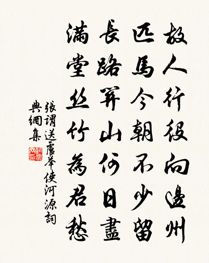 詩詞名句歷史字典書法欣賞書法字典國語詞典說文解字康熙字典古漢語字典標 題 作 者 詩 句 送盧舉使河源作者:張謂 朝代:唐代送盧舉使河源原文故人行役向邊州,匹馬今朝不少留。長路關山何日盡,滿堂絲竹為君愁。詩詞問答問:送盧舉使河源的作者是誰?答:張謂問:送盧舉使河源寫於哪個朝代?答:唐代問:送盧舉使河源是什麼體裁?答:七絕張謂送盧舉使河源書法欣賞送盧舉使河源書法作品注釋全唐詩:卷197_35詩詞推薦宿山觀趙汝鐩〔宋代〕昏暮無處宿,樵人指路頭。僕夫皆已困,道士幸相留。明月夜翻晝,陰崖暑變秋。聞雞便行路,定要到潭州。答杜仲高來書哭兄伯高及辛待制且言杜氏至仲項安世〔宋代〕康廬之麓蠡之皋,太息書來杜仲高。待制功名千古傑,賢良文字萬夫豪。淚痕頻向西風滴,場屋新隨舉子曹。且為寄趙德莊以過去生中作弟兄為韻七首韓元吉〔宋代〕處世那近名,居官敢言清。平生阿堵物,疇能字之兄。春風一杯酒,與君花下傾。窮秋動搖落,江湖渺離情。千里思木待問〔宋代〕君行千里輕所歷,妾馳千里心匪石。春房酌酒意匆匆,愁不在離愁在憶。鴛鴦瓦上昏無色,鸚鵡杯中塵更積。燈前秋晚雲陽驛西亭蓮池許渾〔唐代〕心憶蓮池秉燭游,葉殘花敗尚維舟。煙開翠扇清風曉,水泥紅衣白露秋。神女暫來雲易散,仙娥初去月難留。空懷京中守歲丁仙芝〔唐代〕守歲多然燭,通宵莫掩扉。客愁當暗滿,春色向明歸。玉斗巡初匝,銀河落漸微。開正獻歲酒,千裡間庭闈。水龍吟(春晚留別故人)張炎〔宋代〕亂紅飛已無多,艷游終是如今少。一番雨過,一番春減,催人漸老。倚檻調鶯,捲簾收燕,故園空杳。奈關愁不住贈惠政上人寇準〔宋代〕寥寥長日掩松關,白首忘機古寺間。香爐石房終曉講,葉堆莎徑憶秋山。澄泉心地清無染,野鶴精神老更閒。孤坐春日田園雜興許元發〔宋代〕片雲豈是出山時,曾被東風誤一吹。歸意不煩啼鴂動,閒情只許落花知。桑麻窮巷扉長掩,煙火空林黍自炊。粟里無盡橋郭印〔宋代〕園林作佛事,施子不少吝。攜筇渡一溪,華藏愈無盡。杏花詩庾信〔南北朝〕春色方盈野。枝枝綻翠英。依稀暎村塢。爛熳開山城。好折待賓客。金盤襯紅瓊。夏日陸游〔宋代〕謝客捐書日日閒,行穿密竹臥看山。岩前恨欠煎茶地,安得茆茨一小間?句李邴〔宋代〕長廊風度磬,深院雨留香。菊花高翥〔宋代〕親向東籬手自栽,夕陽小徑重徘徊。花應得似人乖角,過了重陽爛熳開。和梁次張謝得酒見寄四首吳芾〔宋代〕傳得仙家不老方,釀成春色瓮頭香。一樽聊爾資杯酌,爭似相攜入醉鄉。贈唐道士鄧深〔宋代〕靈應堂中一羽衣,衡山來此住多時,因來佛榻終朝臥,醉後敲門半夜歸。留客屢嘗教買酒,向人長自說吟詩。開軒屠甸莫若沖〔宋代〕偶然屠甸見浮屠,為問屠中有物無。見說庖丁洲刃在,恢恢全不費工夫。幽居寄李秘書譚用之〔唐代〕幾年帝里阻煙波,敢向明時叩角歌。看盡好花春臥穩,醉殘紅日夜吟多。印開夕照垂楊柳,畫破寒潭老芰荷。昨夜夔州竹枝歌九首范成大〔宋代〕白帝廟前無舊城,荒山野草古今情。只余峽口一堆石,恰似人心未肯平。鷓鴣天(有感)辛棄疾〔宋代〕出處從來自不齊。後車方載太公歸。誰知孤竹夷齊子,正向空山賦採薇。 * 嫩,晚香枝。一般同是採花時。蜂兒名句推薦桃花落。閒池閣。山盟雖在,錦書難托。陸游《釵頭鳳·紅酥手》 問世間,情是何物,直教生死相許?元好問《摸魚兒·雁丘詞 / 邁陂塘》 送子軍中飲,家書醉里題。岑參《磧西頭送李判官入京》 使君憐小阮,應念倚門愁。李嘉祐《送王牧往吉州謁王使君叔》 此地別燕丹,壯士發衝冠。駱賓王《於易水送人 / 於易水送別》 傳屐朝尋藥,分燈夜讀書。於鵠《題鄰居》 山迴路轉不見君,雪上空留馬行處。岑參《白雪歌送武判官歸京》 見善則遷,有過則改。佚名《易傳·象傳下·益》 驟雨過,珍珠亂撒,打遍新荷。元好問《驟雨打新荷》 風雨如晦,雞鳴不已。佚名《風雨》