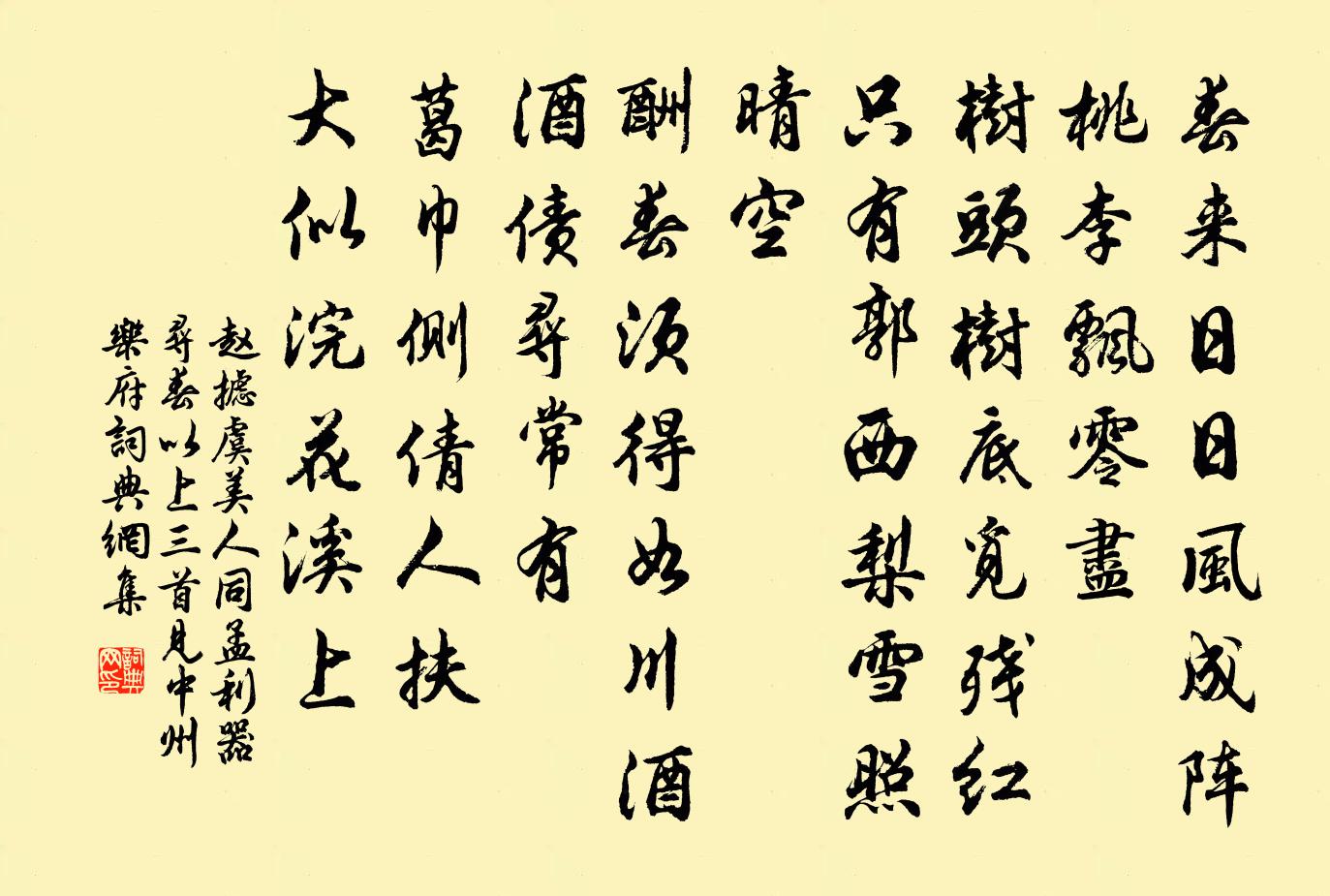 詩詞名句歷史字典書法欣賞書法字典國語詞典說文解字康熙字典古漢語字典標 題 作 者 詩 句 虞美人 同孟利器尋春 以上三首見中州樂府作者:趙攄 朝代:元代原文春來日日風成陣。桃李飄零盡。樹頭樹底覓殘紅。只有郭西梨雪、照晴空。酬春須得如川酒。酒債尋常有。葛巾側倩人扶。大似浣花溪上、詩詞問答問:《虞美人 同孟利器尋春 以上三首見中州樂府》的作者是誰?答:趙攄問:該詩寫於哪個朝代?答:元代問:該詩是什麼體裁?答:詞書法欣賞虞美人 同孟利器尋春 以上三首見中州樂府書法作品詩詞推薦減字木蘭花(內子生日)周紫芝〔宋代〕蓬萊三島。上有青青千歲草。玉佩煙鬟。來作人間一笑歡。 * 行酒。萼綠華歌清韻裊。玉秀蘭芳。醉舞東風彩袖月岩劉錫〔宋代〕不比弋陽名浪傳,疊空三日透山顛。岩分前後兩弦缺,天到中央一月圓。屋擬蟾宮新學士,台存石磴舊遊仙。玲瓏同景仁芝山賞梅丘葵〔宋代〕西風殺群卉,麋鹿覺悽愴。野菊亦憔悴,蕭條不堪賞。主人庵中梅,的皪為誰放。當茲肅霜月,數枝春盎盎。真如交難贈杜漸王令〔宋代〕兩鼠共謀渴,相飲期入水。一鼠下縋缶。一鼠上銜尾。前鼠以之跌,後鼠以之死。鼠死何足噫,夫人才可悲。平地清平樂(題黃寧洞天吹笛台)佚名〔宋代〕蒼崖疊嶂。有路梯雲上。忽見地平方數丈。坐石風林相向。鳳膺時作龍聲。夜深驚動寒星。幾點光芒欲下,傍人頭洪慶善郎中輓詩四首葛立方〔宋代〕筆下翻翻注九河,腹中空洞五車多。麟經旨妙傳洙泗,騷學詞明慰汨羅。六度有為超梵業,一心無累證禪那。龍蛇春日即事三首劉應時〔宋代〕二月風光慚惱人,蒙茸細雨濕花唇。可憐病目長憔悴,坐看紛紛萬卉春。別永嘉使君趙致軒柴望〔宋代〕一番出處計何如,流泊中川不為漁。落日淒涼秋老矣,西風浩蕩客歸歟。吟成白髮逢知己,費盡黃金買古書。明發華亭百詠唳鶴灘許尚〔宋代〕養鶴人何在,湖邊水尚清。喚回中夜夢,灘上戛然聲。清心鏡 道友問修行馬鈺〔元代〕雲朋詢,霞友答。性命事大,自當救拔。免輪迴、決在今生,可細搜細刷。青蓮開,白蓮發。蓮花帳內,奼嬰仰觀游景空寺蘭若孟浩然〔唐代〕龍象經行處,山腰度石關。屢迷青嶂合,時愛綠蘿閒。宴息花林下,高談竹嶼間。寥寥隔麈事,疑是入雞山。寄孟五少府高適〔唐代〕秋氣落窮巷,離憂兼暮蟬。後時已如此,高興亦徒然。知君念淹泊,憶我屢周旋。征路見來雁,歸人悲遠天。平生依韻和孫侔鴈盪二首梅堯臣〔宋代〕鴈盪高高路莫通,銜蘆秋翼入雲峰。山頭水闊不見影,岩下沙平時有蹤。千仞柱天何斂閃,萬工揮筆漫輕濃。葛巾寄榮子雍三首張耒〔宋代〕蒼蒼老柏古南禪,裊裊修篁泮水灣。此地笑談惟我共,百年交友得君難。已甘心向詩書老,會與身圖雲水閒。年少送韓嶼秀才南遊趙湘〔唐代〕楊柳一蟬清,關河九日行。卻來時未熟,此去雨初晴。仆懶嫌書重,驢幽喜骨輕。還因得新句,山寺遍題名。秋興三首張耒〔宋代〕秋日照荊椿,空山莽蕭索。人稀雞犬閒,古道轉城腳。旗亭數家市,炊煙起籬落。牛羊暮求群,歸烏紛落泊。菅麻戲妙德二偈曹勛〔宋代〕穩得身心常坦坦,此事從來高著眼。山河大地遍遊行,只是雨下不借傘。三印頌示眾釋正覺〔宋代〕印水印泥印空,誰傳祖稱家風。夢眼影迷一色,轉身體合全功。次韻審知十三日四絕趙蕃〔宋代〕連朝風雨已如秋,頗念林園柿栗收。謾說為生鄙計算,邇來鹽米屢關憂。偈頌一百五十首釋心月〔宋代〕五髻峰頭望海東,煙重重又水重重。同人相見論心事,又得西來一信通。名句推薦謾道愁須殢酒,酒未醒、愁已先回秦觀《滿庭芳·碧水驚秋》 華而不實,恥也。左丘明《國語·晉語·秦伯享重耳以國君之禮》 涓涓不壅,終為江河佚名《孔子家語·觀周》 信,國之寶也,民之所庇也左丘明《左傳·僖公·僖公二十五年》 功被天下,守之以讓。荀子《荀子·宥坐》 劃然長嘯,草木震動,山鳴谷應,風起水涌蘇軾《後赤壁賦》 奇卓異非至人,至人只是常。洪應明《菜根譚·概論》 露從今夜白,月是故鄉明。杜甫《月夜憶舍弟》 遙知獨聽燈前雨,轉憶同看雪後山。納蘭性德《於中好·送梁汾南還為題小影》 天涯也有江南信。梅破知春近。黃庭堅《虞美人·宜州見梅作》