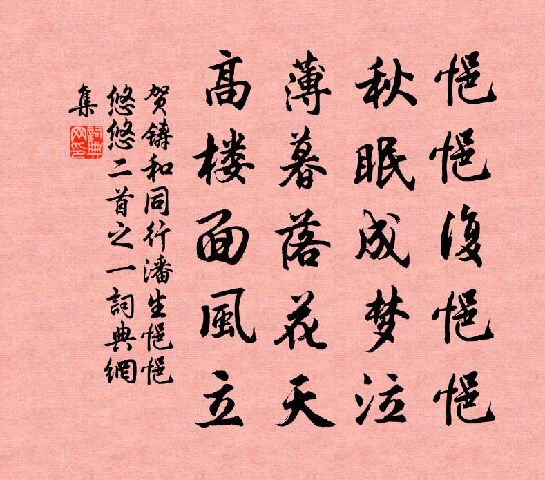 詩詞名句歷史字典書法欣賞書法字典國語詞典說文解字康熙字典古漢語字典標 題 作 者 詩 句 和同行潘生悒悒悠悠二首之一作者:賀鑄 朝代:宋代原文悒悒復悒悒,秋眠成夢泣。薄暮落花天,高樓面風立。詩詞問答問:《和同行潘生悒悒悠悠二首之一》的作者是誰?答:賀鑄問:該詩寫於哪個朝代?答:宋代問:賀鑄的名句有哪些?答:賀鑄名句大全書法欣賞和同行潘生悒悒悠悠二首之一書法作品詩詞推薦酬元主簿子球別贈皎然〔唐代〕故人方遠適,訪我陳別情。此夜偶禪室,一言了無生。覽君緘中寶,如搴清玉瑛。胡為蘊高價,歲晚徒營營。辭秩種穀吟邵雍〔宋代〕農家種穀時,種禾不種莠。奈何禾未榮,而見莠先茂。莠若不誅鋤,禾亦未成就。又況雨霈時,沾及恩一溜。送趙殿孫歸成都司馬光〔宋代〕蜀棧錦衣來,高堂綬笥開。恩輝同日至,喜色共春回。駟馬過鄰社,朝裾捧壽杯。吾生無此樂,空使寸心摧。金丹詩四十八首張繼先〔宋代〕真鉛真汞最堪憑,此理昭昭卻少行。 * 鼎中成玉液,螣蛇宮裡養金精。坎男離女分三位,日月東西合一程。若幾送曹伯高二首曾豐〔宋代〕筆研為謀左,風霜與歲瀕。犬呿如不夜,雞噤似無晨。杖屨喚行客,衣冠辭主人。願言偏強飯,涵養竇庭椿。玉樓春晏幾道〔宋代〕雕鞍好為鶯花住,占取東城南陌路。盡教春思亂如雲,莫管世情輕似絮。古來多被虛名誤,寧負虛名身莫負。勸君出關路白居易〔唐代〕山川函谷路,塵土遊子顏。蕭條去國意,秋風生故關。以詩句詠梅為散冰花除熱惱方蒙仲〔宋代〕狂與豪傾酒,飢腸共索詩。為梅成熱惱,除是把□醫。偶作楊簡〔宋代〕曩疑先聖嗇於言,可不明明細細傳。今醒從前都錯認,更加詳後即紛然。梅香李龍高〔宋代〕忍飢抱凍老窮崖,一點檀心未肯灰。夷甫彥回空似玉,卻曾遺臭汗青來。送李季允侍郎歸蜀五絕用禪房花竹幽為韻劉宰〔宋代〕淮海身如擊,岷峨路去賒。相思冰雪裡,卻立嗅梅花。觀我四首 老張問陶〔清代〕中年歲月渺前生,變盡孩提古性情。猶剩頹光戀兒女,也循常格到公卿。飛花墮溷春難挽,瞎馬臨池夜可驚。幾個丞相大觀文馬公先生輓詞三首方回〔宋代〕四載鹹淳相,艱哉去國情。極知幾事密,或遂好謀成。董卓徵荀爽,陳桓免晏嬰。為公翻左漢,尚覺寸丹明。謝人致蟹方岳〔宋代〕此去江頭只兩程,寒蒲解縛便橫行。無腸政要空虛腹,滿貯蘆花與月明。曉林慈鳥圖唐寅〔明代〕慈鳥鳴鳴鬧曉林,羽毛單薄雪霜深。世間人子非梟獍,聞得誰無反哺心。滿路花(仙呂思情)周邦彥〔宋代〕簾烘淚雨乾,酒壓愁城破。冰壺防飲渴,培殘火。朱消粉退,絕勝新梳里。不是寒宵短,日上三竿,殢人猶要同臥題丹霞洞陳著〔宋代〕丹山高處坐龍宮,山下人歸潤澤中。北馬一塵飛不到,危時方見有神功。花門外楊維楨〔元代〕大唐宇宙非金甌,黃頭奚兒蟆作虬。跳河蹙隴翻九土,驚烏夜半呼延秋。朔方健兒袖雙手,戰馬嘶春舞楊柳。當時登樓子蘭〔唐代〕邊邑鴻聲一例秋, * 平日繞山流。故人千里同明月,盡夕無言空倚樓。漫述黃庚〔宋代〕眼前萬事等一夢,世上幾人能百年。千古英雄今已矣,北邙荒冢草芊芊。名句推薦落日無人松徑里,鬼火高低明滅。薩都剌《念奴嬌·登石頭城次東坡韻》 凌波不過橫塘路,但目送、芳塵去。賀鑄《青玉案·凌波不過橫塘路》 玉樹歌殘王氣終,景陽兵合戍樓空。許渾《金陵懷古》 青春須早為,豈能長少年。孟郊《勸學》 王國富民,霸國富士;僅存之國,富大夫;亡道之國,富倉府劉向《說苑·政理》 秋鬢含霜白,衰顏倚酒紅。尹式《別宋常侍》 灼灼野花香,依依金柳黃。佚名《菩薩蠻·霏霏點點回塘雨》 爭渡,爭渡,驚起一灘鷗鷺。李清照《如夢令·常記溪亭日暮》 小樓昨夜又東風,故國不堪回首月明中。李煜《虞美人·春花秋月何時了》 命室攜童弱,良日登遠遊陶淵明《酬劉柴桑》