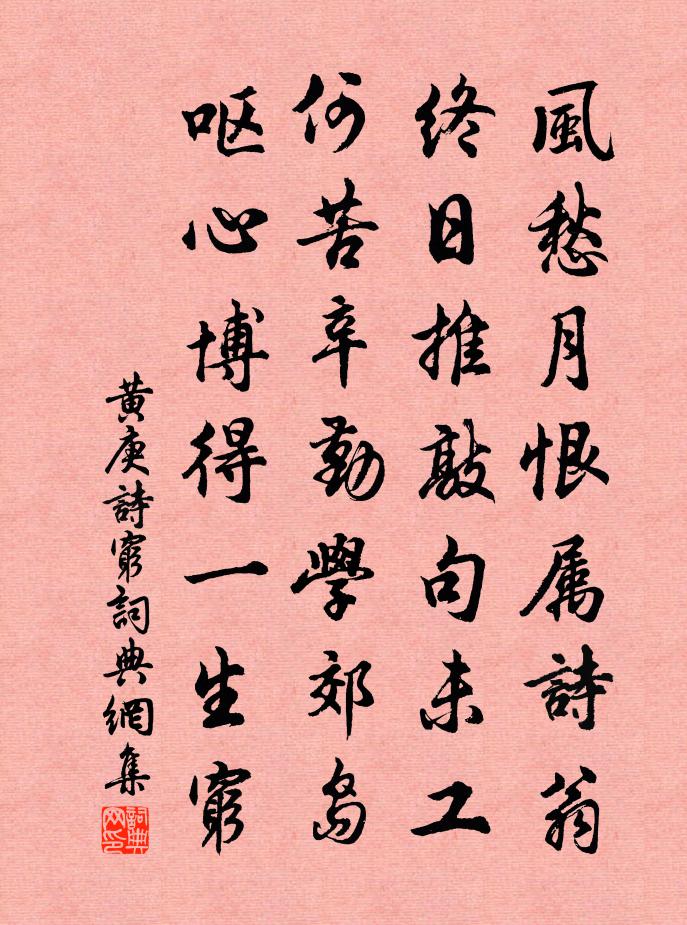 詩詞名句歷史字典書法欣賞書法字典國語詞典說文解字康熙字典古漢語字典標 題 作 者 詩 句 詩窮作者:黃庚 朝代:宋代詩窮原文風愁月恨屬詩翁,終日推敲句未工。何苦辛勤學郊島,嘔心博得一生窮。詩詞問答問:詩窮的作者是誰?答:黃庚問:詩窮寫於哪個朝代?答:宋代黃庚詩窮書法欣賞詩窮書法作品詩詞推薦酬葉縣劉明府避地廬山言懷詒鄭錄事昆季苟尊師兼見贈之吳筠〔唐代〕明哲良罕遇,遇君輒思齊。挺生著天爵,自可析人珪。河洛初沸騰,方期掃虹霓。時命竟未合,安能親鼓鼙。從此秋夜與劉碭山泛宴喜亭池李白〔唐代〕明宰試舟楫,張燈宴華池。文招梁苑客,歌動郢中兒。月色望不盡,空天交相宜。令人慾泛海,只待長風吹。清平樂 元貞元旦 天下同文補遺盧摯〔元代〕元貞更號。日月開黃道。試看韶華何處好。擊壞康衢父老。相將竹馬兒童。崧高萬歲聲中。洛浦海花香里,人間第寄湖掾楊浩然強至〔宋代〕新持手版苕溪掾,應恨浮名別故鄉。澤國幾瞻飛雁序,春風自入墜鱣堂。坐曹未改平生好,開卷能如往日忙。龍首寄題江陵撫乾胡仲方官舍信美樓周必大〔宋代〕家在香城溪水邊,冠霞飛閣切雲煙。從軍樂事猶吾土,底用銷憂賦仲宣。向隅韓偓〔唐代〕守道得途遲,中兼遇亂離。剛腸成繞指,玄發轉垂絲。客路少安處,病床無穩時。弟兄訊息絕,獨斂問隅眉。西湖七月半張岱〔明代〕 西湖七月半,一無可看,止可看看七月半之人。看七月半之人,以五類看之。其一,樓船簫鼓,峨冠盛筵,燈哭柵石壁釋紹曇〔宋代〕心鏡交光十四年,誰知失照髑髏前。春風夢繞福城路,忍聽亂啼花塢鵑。僧院夏日和酬朱仲方林逋〔宋代〕一院掩蕭森,晨涼又夕陰。鶴應輸靜立,蟬合伴清吟。著壁雲衣重,通簾竹翠深。臥屏來看否,天姥雪千尋。梁明堂登歌 歌赤帝辭沈約〔南北朝〕炎光在離。火為威德。執禮昭訓。持衡受則。靡草既凋。溫風以至。嘉薦惟旅。時羞孔備。齊緹在堂。笙鏞在下。感鏡白居易〔唐代〕美人與我別,留鏡在匣中。自從花顏去,秋水無芙蓉。經年不開匣,紅埃覆青銅。今朝一拂拭,自照憔悴容。照罷魯墟舟中作陸游〔宋代〕春浦南來元不到,畫橈偶復入鷗群。人家遠火林間見,船底微波枕上聞。山口正銜初出月,渡頭未散欲歸雲。錦囊席屋上戲書 歸潛志十趙可〔元代〕趙可可。肚裡文章可可。三場捱了兩場過。只有這番解火。恰如合眼跳黃河。知他是過也不過。試官道、王業艱難醉落魄蔡伸〔宋代〕波紋如縠。池塘雨後添新綠。海棠初綻紅生肉。雙燕歸來,還認舊巢宿。凝情憑暖闌乾曲。新愁無限傷心目。誰人書隱者壁王珪〔唐代〕客路林如棘,岩棲靜掩關。陶巾春漬酒,謝屐晚回山。醉夢雷霆息,棋聲日月間。我慚攖世綱,暫此一怡顏。首尾吟邵雍〔宋代〕堯夫非是愛吟詩,詩是堯夫憑式時。亂法奈何非獨古,措刑安得見於茲。當時既有少正卯,今日寧無孔仲尼。時世漫述二首蘇籀〔宋代〕理窟孰宗趣,卜居忘市闤。紆餘力分里,梗概智仁間。導引非茫眇,耕樵未擬閒。寅緣任俚俗,及物念痌瘝。梅山弟池邊醉吟陳著〔宋代〕兩岡銜口水流唇,茅屋三間松四鄰。花影落池塵外境,鳥聲喜客靜中春。生涯已付桑林舊,活句還隨菜酒新。滋味苑中遇雪應制劉憲〔唐代〕龍驂曉入望 * ,正逢春雪舞東風。花光並灑天文上,寒氣行消御酒中。呈尤運使袤延之五首趙蕃〔宋代〕青衿詩學為,白髮步乃卻。茫茫悟中入,了了難邊覺。抱痾每向人,誰有如神藥。公乎有異聞,蘄為啟玄鑰。名句推薦哀莫大於心死。莊子《莊子·外篇·田子方》 投策命晨裝,暫與園田疏。陶淵明《始作鎮軍參軍經曲阿作》 立業無論大小,總要此身做得來。王永彬《圍爐夜話·第三九則》 永夜角聲悲自語,客心愁破正思家。汪元量《望江南·幽州九日》 亦有白骨歸鹹陽,營家各與題本鄉。王建《渡遼水》 傷心秦漢,生民塗炭,讀書人一聲長嘆。張可久《賣花聲·懷古》 一枝紅杏出牆頭,牆外行人正獨愁。吳融《途中見杏花》 江上旗亭,送君還是逢君處吳大有《點絳唇·送李琴泉》 君以為易,其難也將至矣。左丘明《國語·晉語·郭偃論治國之難易》 但東望、故人翹首。戴復古《賀新郎·寄豐真州》