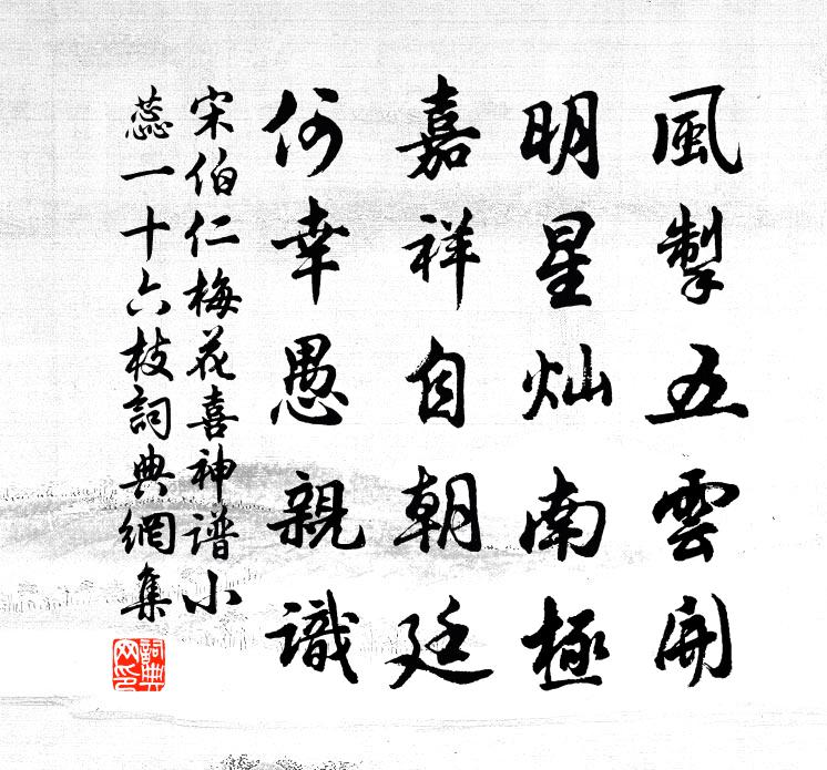 詩詞名句歷史字典書法欣賞書法字典國語詞典說文解字康熙字典古漢語字典標 題 作 者 詩 句 梅花喜神譜小蕊一十六枝作者:宋伯仁 朝代:宋代梅花喜神譜小蕊一十六枝原文風掣五雲開,明星燦南極。嘉祥自朝廷,何幸愚親識。詩詞問答問:梅花喜神譜小蕊一十六枝的作者是誰?答:宋伯仁問:梅花喜神譜小蕊一十六枝寫於哪個朝代?答:宋代宋伯仁梅花喜神譜小蕊一十六枝書法欣賞梅花喜神譜小蕊一十六枝書法作品詩詞推薦送胡黎州項安世〔宋代〕江南客子賦西征,冬月川江似砥平。山遣雪來迎小隊,人將春去到邊城。邛峽阪曲臣車直,大渡河深帝斧明。都獲偈頌二百零五首釋正覺〔宋代〕露,超宗越祖。人言渠爇返魂香,我道伊撾塗毒鼓。苦苦,更若咬文嚼字,規行矩步。上唱下隨,前瞻後顧。張三詠槐洪皓〔宋代〕弛擔披襟岸幘斜,庭陰雅稱酌流霞,三槐只許三公面,作記名堂有幾家。送何水部蒙出牧袁州錢丕〔宋代〕白首名郎有幾人,雙旌晝錦不如君。楚江萍暖烘朝日,玉女衣輕掛曉雲。極浦仙舟煙澹澹,高秘郡閣葉紛紛。政成西江月(垂絲海棠,一名醉美人)黃機〔宋代〕捻翠低垂嫩萼,勻紅倒簇繁英。穠纖消得比佳人。酒入香肌成暈。簾幕陰陰窗牖,闌乾曲曲池亭。枝頭不起夢春酲富平少侯李商隱〔唐代〕七國三邊未到憂,十三身襲富平侯。不收金彈拋林外,卻惜銀床在井頭。彩樹轉燈珠錯落,繡檀回枕玉雕鎪。當關點絳唇(慶江王之武子新居)郭應祥〔宋代〕甲第初成,持杯酌酒來相慶。棣華輝映。相對開三徑。小巧規模,百事都相稱。年方盛。從容嘯詠。不礙青雲興。句高似孫〔宋代〕已是飛來鶗鴃了,可能落到牡丹開。楚州開元寺北院枸杞臨井繁茂可觀群賢賦詩因以繼和劉禹錫〔唐代〕僧房藥樹依寒井,井有香泉樹有靈。翠黛葉生籠石甃,殷紅子熟照銅瓶。枝繁本是仙人杖,根老新成瑞犬形。上品望月有懷李白〔唐代〕清泉映疏鬆,不知幾千古。寒月搖清波,流光入窗戶。對此空長吟,思君意何深。無因見安道,興盡愁人心。雪霽羅隱〔唐代〕南山雪乍晴,寒氣轉崢嶸。鎖卻閒門出,隨他駿馬行。一竿如有計,五鼎豈須烹。愁見天街草,青青又欲生。獨往覆釜山,寄郎士元錢起〔唐代〕賞心無遠近,芳月好登望。勝事引幽人,山下復山上。將尋洞中藥,復愛湖外嶂。古壁苔入雲,陰溪樹穿浪。誰言聽雨楊萬里〔宋代〕歸舟昔歲宿嚴陵,雨打疏篷聽到明。昨夜茅檐疏雨作,夢中喚作打篷聲。齊山石壁間見林擇之題字緬懷其人賦此張栻〔宋代〕平生子林子,一別今幾春。寧知林壑中,忽見題墨新。巉巉屹蒼石,恍若對其人。徘徊不忍去,我懷誰為陳。自子郊遊遇黃府女孫潘用中〔宋代〕誰教窄路恰相篷,脈脈靈犀一點通。最恨無情芳草路,匿蘭含蕙各西東。雜詩絕句十七首梅堯臣〔宋代〕鵲銜高樹蟬,危脅繅車響。露腹不曾肥,殺之嗟已往。秋江寫望林逋〔宋代〕蒼茫沙嘴鷺鷥眠,片水無痕浸碧天。最愛蘆花經雨後,一蓬煙火飯魚船。南歌子張時〔宋代〕暖日未斜西。正是迷花殢酒時。紅藥雕闌呈冷艷,依稀。花重枝柔壓半敧。相對耍猴兒。一捻幽芳勸酒卮。魏紫姚絳都春(太師生辰)毛滂〔宋代〕余寒尚峭。早鳳沼凍開,芝田春到。茂對誕期,天與公春向廊廟。元功開物爭春妙。付與穠華多少。召還和氣,拂郡庭惜牡丹徐夤〔唐代〕腸斷東風落牡丹,為祥為瑞久留難。青春不駐堪垂淚,紅艷已空猶倚欄。積蘚下銷香蕊盡,晴陽高照露華乾。明年名句推薦臣聞君子樂得其志,小人樂得其事。姜子牙《六韜·文韜·文師》 庭有枇杷樹,吾妻死之年所手植也,今已亭亭如蓋矣。歸有光《項脊軒志》 蕃漢斷訊息,死生長別離。張籍《沒蕃故人》 置酒長安道,同心與我違。王維《送綦毋潛落第還鄉 / 送別》 君思潁水綠,忽復歸嵩岑。李白《送裴十八圖南歸嵩山二首》 疾雷不及塞耳,疾霆不暇掩目。劉安及其門客《淮南子·兵略訓》 長江後浪推前浪,世上新人趕舊人。佚名《增廣賢文·上集》 把酒送春春不語。黃昏卻下瀟瀟雨。朱淑真《蝶戀花·送春》 悲吟雨雪動林木,放書輟劍思高堂。李白《留別於十一兄逖裴十三游塞垣》 空獨倚東風,芳思誰寄。周密《繡鸞鳳花犯·賦水仙》