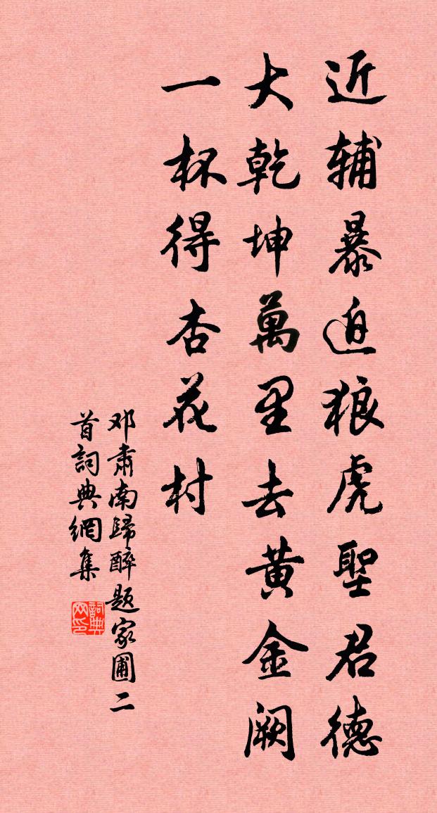 詩詞名句歷史字典書法欣賞書法字典國語詞典說文解字康熙字典古漢語字典標 題 作 者 詩 句 南歸醉題家圃二首作者:鄧肅 朝代:宋代南歸醉題家圃二首原文近輔暴迫狼虎,聖君德大乾坤。萬里去黃金闕,一杯得杏花村。詩詞問答問:南歸醉題家圃二首的作者是誰?答:鄧肅問:南歸醉題家圃二首寫於哪個朝代?答:宋代鄧肅南歸醉題家圃二首書法欣賞南歸醉題家圃二首書法作品詩詞推薦華之高壽魯齋先生七十金履祥〔宋代〕於時宣尼,從心不逾。六籍是正,三千其徒。茅屋陳與義〔宋代〕茅屋年年破,春風歲歲來。寒從草根退,花值客愁開。此序添詩卷,乾坤進酒杯。片雲無思極,日暮卻空回。打鰣魚吳嘉紀〔清代〕打鰣魚,暮不休。前魚已去後魚稀,搔白官人舊黑頭。販夫何曾得偷買,胥徒兩岸爭相待。人馬銷殘日無算,百計春送楊彥侯赴試建陽用曾南豐湖水碧韻李彌遜〔宋代〕人生不合留飛黃,驪駒夜發生悲涼。馬足著沙去莫挽,一日萬里風雲翔。月明霜枝掛秋香,桂宮高架辛夷梁。長梯和真珠花二首廖行之〔宋代〕累累瓔珞作新裝,萬蘤勻開細細香。好是花時最清絕,月明珠露夜初長。春日湖上五首釋斯植〔宋代〕今朝才得是閒身,來往琳宮不厭頻。燕葺舊巢春又暮,風光一半屬遊人。次韻王鞏南遷初歸二首蘇軾〔宋代〕問君謫南賓,野葛食幾尺。逢人瘴發黃,入市胡眼碧。三年不易過,坐睨倚天壁。歸來貌如故,妙語仍破鏑。那能次韻春懷陳師道〔宋代〕老形已具臂膝痛,春事無多櫻筍來。敗絮不溫生蟣虱,大杯覆酒著塵埃。衰年此日仍為客,舊國當時只廢台。河嶺庚戌壽意一先生朱繼芳〔宋代〕江涵秋色碧潭潭,飲馬胡兒不敢南。宥密老臣功第一,緝熙天子歲登三。身扶紫極星辰正,手拆黃封雨露甘。見說余襄公祠楊蟠〔宋代〕或業終令萬古傳,豈惟文采動當年。曲江相繼成雙廟,慶厲同稱有四賢。吳江太湖龍王殿鄭起〔宋代〕吾謁龍王殿,龍王在何許。太湖三萬頃,水族龍為主。離離明月宮,渺渺寒煙渚。天下有旱蝗,吾亦能行雨。范石湖東歸過鄉國名之芙蓉城余以季夏來游適程公許〔宋代〕芙蓉城下六月秋,最好雁湖湖上游。周遭一機雲錦爛,並與老仙供唱酬。殘臘書懷舒邦佐〔宋代〕冰池照日暖初融,準擬迎春更餞冬。杯酒乍疏情少緒,尺緘稽報病多慵。殘年斷送風和雪,晚節相依竹與松。回首效陶劉駕〔唐代〕兩曜無停馭,蓬壺應有墓。何況北邙山,只近市朝路。大恢生死網,飛走無逃處。白髮忽已新,紅顏豈如故。我有送仇仁近持山村圖求屋貲方回〔宋代〕浪多年二十,是事弗如之。老我初登第,聞君早解詩。風霜懸齒頰,錦繡簇肝脾。才是通漫刺,誰非獻屈卮。貴人橫吹曲辭。入塞曲沈彬〔唐代〕欲為皇王服遠戎,萬人金甲鼓鼙中。陣雲暗塞三邊黑,兵血愁天一片紅。半夜翻營旗攪月,深秋防戍劍磨風。謗書送人到松江俞桂〔宋代〕西風蕭瑟入船窗,送客離愁酒滿缸。要記此時分袂處,暮煙細雨過松江。送著作佐郎崔融等從梁王東征陳子昂〔唐代〕金天方肅殺。白露始專征。王師非樂戰。之子慎佳兵。海氣侵南部。邊風掃北平。莫賣盧龍塞。歸邀麟閣名。更漏子·春夜闌牛嶠〔唐代〕春夜闌,更漏促,金燼暗挑殘燭。驚夢斷,錦屏深,兩鄉明月心。閨草碧,望歸客,還是不知訊息。辜負我,悔憐遣意二首杜甫〔唐代〕囀枝黃鳥近,泛渚白鷗輕。一徑野花落,孤村春水生。衰年催釀黍,細雨更移橙。漸喜交遊絕,幽居不用名。檐影名句推薦妙年出補父兄處,公自才力應時須黃庭堅《送范德孺知慶州》 為問元戎竇車騎,何時返旆勒燕然。皇甫冉《春思》 夢繞神州路。張元乾《賀新郎·送胡邦衡待制赴新州》 草木雖無情,因依尚可生李白《樹中草》 擇子莫擇父,擇親莫擇鄰。佚名《增廣賢文·下集》 兵強勝人,人強勝天佚名《逸周書·卷三·文傳解》 梳洗罷,獨倚望江樓。溫庭筠《望江南·梳洗罷》 致治之本,惟在於審。量才授職,務省官員。吳兢《貞觀政要·卷三·論擇官》 夕陽西下,斷腸人在天涯。馬致遠《天淨沙·秋思》 無常安之國,無宜治之民戴聖《大戴禮記·保傅第四十八》
