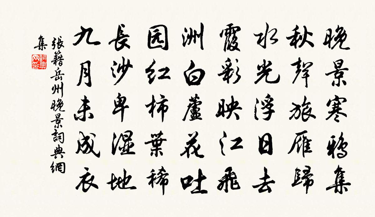 詩詞名句歷史字典書法欣賞書法字典國語詞典說文解字康熙字典古漢語字典標 題 作 者 詩 句 岳州晚景作者:張籍 朝代:唐代岳州晚景原文晚景寒鴉集,秋聲旅雁歸。水光浮日去,霞彩映江飛。洲白蘆花吐,園紅柿葉稀。長沙卑濕地,九月未成衣。詩詞問答問:岳州晚景的作者是誰?答:張籍問:岳州晚景寫於哪個朝代?答:唐代問:張籍的名句有哪些?答:張籍名句大全張籍岳州晚景書法欣賞岳州晚景書法作品詩詞推薦詠史下劉琨陳普〔宋代〕竹林遺類入荊楊,賈郭余塵在晉陽。聽得平陽訊息否,忍聽徐潤調笙簧。大雲寺二十韻元稹〔唐代〕地勝宜台殿,山晴離垢氛。現身千佛國,護世四王軍。碧耀高樓瓦,赬飛半壁文。鶴林縈古道,雁塔沒歸雲。幡影二十世紀太平洋歌梁啓超〔清代〕亞洲大陸有一士,自名任公其姓梁。盡瘁國事不得志,斷髮胡服走扶桑。扶桑之居讀書尚友既一載,耳目神氣頗發明慶寺楊修〔宋代〕翠壁如屏旱不枯,一泓甘滑飲醍醐。高僧到此聞絲竹,還有金鱗對躍無。舟著淺李流謙〔宋代〕御風起帆如彍矢,不能萬里猶千里。中流浪頭屋高起,誤入淺洲舟閣底。愚公不量欲移山,篙人伎窮客長嘆。世言太常引劉燕歌〔元代〕故人別我出陽關,無計鎖雕鞍。今古別離難,蹙損了蛾眉遠山。一尊別酒,一聲杜宇,寂寞又春殘。明月小樓間,劍門關陸游〔宋代〕劍門天設險,北鄉控函秦。客主固殊勢,存亡終在人。棧雲寒欲雨,關柳暗知春。羈客垂垂老,憑高一愴神。鼎建金釜仙山靈泉古觀碑李燾〔宋代〕臣堙獨步轉淦浪,□□□□□□陽。風生□□□□□,紫氣繽紛賽錦堂。欲頻了了載詩酒,總為超□□□陰。幽勝浣溪沙陳允平〔宋代〕十二珠簾繡帶垂。柳煙迷暗楚江涯。自攜玉笛憑丹梯。寫恨鸞箋凝粉淚,踏青鴛襪濺金泥。落紅深處亂鶯啼。節婦吟·寄東平李司空師道張籍〔唐代〕君知妾有夫,贈妾雙明珠。感君 * 意,系在紅羅褥[1]。妾家高樓連苑起,良人持戟明光里[2]。知君用心卜運算元(生朝次坐客韻呈四叔)韓淲〔宋代〕花底醉東風,好景宜同壽。海角天涯今幾春,邂逅新豐酒。內集記高陽,南渡閒回首。但願長年飽飯休,一笑風塵歲盡行縣歸示時雨李新〔宋代〕五府辟書如齧鐵,八關炙手能令熱。山梅何苦要先春,清艷更多終欠葉。貴游結懽過美酒,不問賢愚皆可口。秕糠宮詞張公庠〔宋代〕玉虛新殿勢巑岏,誰見壺中日月閒。消盡曉霞無一縷,數聲清磬落人間。山陰蘭亭柴望〔宋代〕寂寂山陰事已塵,至今亭址尚嶙峋。落花時節朝朝雨,插柳人家處處春。曲水自流寒食酒,茂林無復永和人。昭陵寄孫修撰頃法同舍訝予多忘有見過之意洪皓〔宋代〕未見古人心已傾,揚鞭何惜一朝程。自慚病忘非多忘,儻逐班荊即負荊。元豐己未三院東閣作元豐戊午夏予尹京治陳蘇頌〔宋代〕吏議推窮舊話言,畏途迢遞冒風瀾。兩詞罷對文移絕,一室常眠枕席寒。鬱郁久居人共嘆,皇皇求義我知難。誰將挽丘大卿二首劉克莊〔宋代〕方喜遼天孤鶴返,忽驚蔡嶺一牛鳴。理官未遣儔三後,拙宦才令至九卿。盡翦萑莆潢弄息,不囊薏苡粵裝輕。厚誣監試衛通判送桂花一枝得四絕句以謝王邁〔宋代〕花映眉間一點黃,笑將文字共平章。高枝定不輕分付,自有花為知見香。蔬食王炎〔宋代〕瓠白吾何有,人言太瘦生。富兒皆肉食,我輩但藜羹。安得萬錢費,應無五鼎烹。飢腸雷欲吼,一飽亦何營。一字至七字觀周曾秋塘圖有作龔開〔宋代〕秋,秋。瀟灑,清幽。人靜處,水邊頭。波紋細細,風色颼颼。鷗鷺情相狎,鳧鷖樂自由。疎葦敗荷池沼,白苹紅名句推薦若說沒奇緣,今生偏又遇著他,若說有奇緣,如何心事終虛化?曹雪芹《紅樓夢·第五回》 四海無閒田,農夫猶餓死。李紳《古風二首 / 憫農二首》 勸君頻入醉鄉來,此是無愁無恨處。晏幾道《玉樓春·雕鞍好為鶯花住》 天長地久有時盡,此恨綿綿無絕期。白居易《長恨歌》 曲屏先暖鴛衾慣,夜寒深、都是思量。吳文英《風入松·為友人放琴客賦》 此心終合雪,去已莫思量。虛中《送遷客》 星月皎潔,明河在天,四無人聲,聲在樹間。歐陽修《秋聲賦》 桃花春水淥,水上鴛鴦浴。韋莊《菩薩蠻》 何似當筵虎士,揮手弦聲響處,雙雁落遙空。葉夢得《水調歌頭·九月望日與客習射西園余偶病不能射》 富貴必從勤苦得,男兒須讀五車書。杜甫《柏學士茅屋》