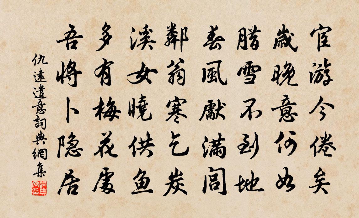 詩詞名句歷史字典書法欣賞書法字典國語詞典說文解字康熙字典古漢語字典標 題 作 者 詩 句 遣意作者:仇遠 朝代:宋代遣意原文宦遊今倦矣,歲晚意何如。臘雪不到地,春風先滿閭。鄰翁寒乞炭,溪女曉供魚。多有梅花處,吾將卜隱居。詩詞問答問:遣意的作者是誰?答:仇遠問:遣意寫於哪個朝代?答:宋代仇遠遣意書法欣賞遣意書法作品詩詞推薦水竹野十詠竹風水月葉茵〔宋代〕造物無盡藏,散在林泉中。結亭相周旋,人與萬境空。句曾幾〔宋代〕僧居負高青,佛閣俯深翠。和茅亦山先生雜詠黃庚〔宋代〕破硯塵封懶賦詩,晚年才思覺衰遲,耽書自笑已成癖,煮字元來不療飢。風月滿懷詩可寫,地霜侵鬢鏡先知。太公官舍迎內子有庭花開盧儲〔唐代〕芍藥斬新栽,當庭數朵開。東風與拘束,留待細君來。句趙汝績〔宋代〕才有數花香便遠,更無一葉影方奇。行香子·秋入鳴皋許古〔元代〕秋入鳴皋。爽氣飄蕭。掛衣冠、初脫塵勞。窗間岩岫,看盡昏朝。夜山低,晴山近,曉山高。細數間來,幾處村醪已亥雜詩 147龔自珍〔清代〕道場[香奄][香曷]雨花天,長水宗風在目前。一任揀機參活句,莫將文字換狂禪。夜題釋紹嵩〔宋代〕滿庭松桂雨余天,病眼開時月正圓。羅列眾星依木末,安排流水落檐前。倚松長嘯宜疏拙,隨處何妨且信緣。白髮句葉廷珪〔宋代〕戌兵數有流星遞,元白詩筒幸寄將。盜犯金川境扶侍母妹復走興安有懷利登〔宋代〕歉歲古多盜,於今起豐年。村村遞遷偪,旗鼓莽相聯。蚍蝣信有力,復此走興安。淋漓雨萬壑,駭浪驚前山。攜持送彭開府往雲中覲使君兄盧綸〔唐代〕一門三代貴,非是主恩偏。破虜山銘在,承家劍藝全。奪旗貂帳側,射虎雪林前。雁塞逢兄弟,雲州發管弦。凍河望鶴林寺李紳〔唐代〕鶴棲峰下青蓮宇,花發江城世界春。紅照日高殷奪火,紫凝霞曙瑩銷塵。每思載酒悲前事,欲問題詩想舊身。自嘆山居詩釋延壽〔宋代〕投足煙巒養病軀,馳求終是用工夫。知般有作皆從智,萬種無依自合愚。意地已拋塵事業,心田唯種稻根株。非時江城子元好問〔金代〕梅梅柳柳鬧新晴。趁清明。鳳山行。畫出靈泉,三月晉蘭亭。細馬金鞍紅袖客,能從我,出重城。賞心樂事古難並頌古四十四首釋師範〔宋代〕分明指出與人看,多少禪和被熱瞞。舉目只知看雨勢,不知秋水沒欄乾。早春陸游〔宋代〕數聲屋角聽鳴禽,紅糝青梢忽滿林。雨過東皋一犁潤,冰消南澗半篙深。逢僧竹院閒評藥,攜鶴山村醉擁琴。青史題武夷馬合麻〔宋代〕石鼓溪邊渡,門前一葉舟。雨滋千壑翠,風動萬岩秋。仙去雲常在。山空水自流,九天煩紫詔,借我此中游。出德化門外董嗣杲〔宋代〕湖光分柳岸,野趣入桑畦。錦片段預告隨水,犀尖筍迸泥。淮雲收雨去,蜀鳥失春啼。隔浦軍船過,斜陽送鼓鼙。送許耀卿監丞同年赴靜江倅四絕范成大〔宋代〕羅帶江流碧玉峰,舊遊如夢一星終。煩披石尋題字,定有人能記此翁。雨後月明起坐戲成舒岳祥〔宋代〕雨後月明,如醉而醒。不見其形,但見其影。我夢初回,非曙非暝。道人無言,起舞弄景。永鳥無聲,一鶴自警。名句推薦習讀書之業,便當知讀書之樂王永彬《圍爐夜話·第五五則》 深村時節好,應為去年豐。范成大《寒食郊行書事》 有孫母未去,出入無完裙。杜甫《石壕吏》 離一切諸相則名諸佛。鳩摩羅什譯《金剛經·離相寂滅》 桃花一簇開無主,可愛深紅愛淺紅?杜甫《江畔獨步尋花·其五》 日高煙斂,更看今日晴未。李清照《念奴嬌·春情》 表獨立兮山之上,雲容容兮而在下;屈原《九歌》 長者立,幼勿坐。長者坐,命乃坐。李毓秀《弟子規·出則弟》 赤壁磯頭落照,肥水橋邊衰草,渺渺喚人愁張孝祥《水調歌頭·和龐佑父》 唯燒蒿棘火,愁坐夜待晨白居易《村居苦寒》