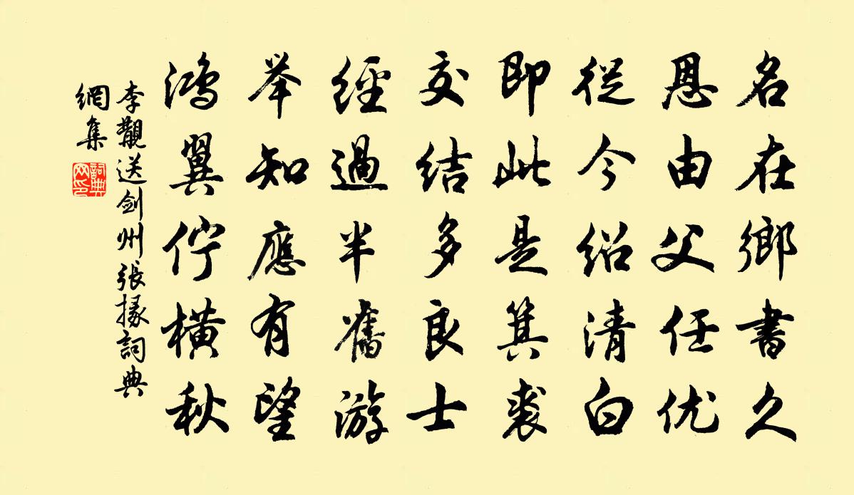 詩詞名句歷史字典書法欣賞書法字典國語詞典說文解字康熙字典古漢語字典標 題 作 者 詩 句 送劍州張掾作者:李覯 朝代:宋代送劍州張掾原文名在鄉書久,恩由父任優。從今紹清白,即此是箕裘。交結多良士,經過半舊遊。舉知應有望,鴻翼佇橫秋。詩詞問答問:送劍州張掾的作者是誰?答:李覯問:送劍州張掾寫於哪個朝代?答:宋代李覯送劍州張掾書法欣賞送劍州張掾書法作品詩詞推薦七夕溫庭筠〔唐代〕鳴機札札停金梭,芙蓉澹蕩生池波。神軒紅粉陳香羅,鳳低蟬薄愁雙蛾。微光奕奕凌天河,鸞咽鶴唳飄颻歌。彎橋適閩陸游〔宋代〕春殘猶看少城花,雪裡來嘗北苑茶。未恨光陰疾駒隙,但驚世界等河沙。功名塞外心空壯,詩酒樽前發已華。官柳元真殿燒香觀太宗真宗御書仁宗飛白書並瑞穀夏竦〔宋代〕蘭炷薰琳殿,雪旄映綠莎。九青真蔭遠,三母睿慈多。閣道陪鑾往,唐中奉詔過。熙陵遺札啟,禰廟實文羅。繼志頌古十五首釋慧遠〔宋代〕行行月冷風高,步步山寒水深。逢人披肝露膽,見義劈腥剜心。句陳堯佐〔宋代〕爭似碧瀾堂上望,疏疏煙樹漠汀洲。請息齋書事范成大〔宋代〕刻木牽絲罷戲場,祭余雨後兩相忘。門雖有雀尚廷尉,食已無魚休孟嘗。虱里趨時真是賊,虎中宣力任為倀。籬東題文發叔所藏潘子真水墨江湖八境小軸太湖秋楊萬里〔宋代〕水氣清空外,人家秋色中。細看千萬落,戶戶水精宮。初夏新晴陸游〔宋代〕曲徑泥新晚照明,小軒才受一床橫。翩翩乳燕穿簾影,蔌蔌新篁解籜聲。藥物屏除知病減,夢魂安穩覺心平。深居浪淘沙元好問〔金代〕楊柳日三眠。桃李爭妍。千金誰許占芳年。買得閒愁無處著,卻恨春偏。流水武陵源。夢引愁牽。東風歸興雁翩翩司馬溫公輓詩五首孔武仲〔宋代〕賜告恩稠疊,聞喪上震驚。秋原無喜色,夜雨有悲聲。世路嗟存沒,公心達死生。蓬山預讎校,新見史書成。賦羅漢果張栻〔宋代〕黃實纍纍本自芳,西湖名字著諸方。里稱勝母吾常避,珍重山僧自煮湯。次韻許節推喜雪陳造〔宋代〕雪後緘詩送春燠,何異祠壇起只肅。吟喔三嘆思答報,幾欲揮毫紙隨縮。多聞實藉益者三,敬客不啻需之六。別君張隱君輓詩魏了翁〔宋代〕觸事無非學,非儒果誤身。體中識天地,筆底定君臣。安樂堂前月,希夷枕上春。是應家有子,不止活千人。中秋西江上黃公度〔宋代〕月色今宵萬里,笛聲何處孤舟。世事堪驚流水,鄉心不忍登樓。寄劉伯聲張耒〔宋代〕別君幾何時,人事浩千萬。身如張射侯,憂愁劇強箭。崎嶇走窮縣,艱苦君未見。未知菽水豐,已感霜露變。羈孤送李少府貶峽中王少府貶長沙高適〔唐代〕嗟君此別意何如?駐馬銜杯問謫居。巫峽啼猿數行淚,衡陽歸雁幾封書。青楓江上秋帆遠,白帝城邊古木疏。新地送徐閻二游洞霄顧逢〔宋代〕洞天三十六,大滌影猶希。樓閣仙人宅,雲霞羽士衣。風號松虎嘯,雨卷瀑龍飛。搗藥禽猶在,時聞出翠微。至後入城道中雜興十首楊萬里〔宋代〕豐年物物總欣驩,不但人和畜亦蕃。簸處金膚肥彘母,春余珠屑飽雞孫。麥苗已有生意掘烏禾稬者未止王炎〔宋代〕兒童飯犢女採桑,水滿東皋耕事忙。稻秧半綠麥半黃,天許食新饘粥香。田父咨嗟仍笑語,赤地一年今得雨。紫鱉暨陽居四首王令〔宋代〕自吾暨陽居,已見月四周。流年不我謀,寒暑忽已遒。老來何足嘆,苟死固可羞。子今用力薄,暮齒將何收。名句推薦寒蟬淒切,對長亭晚,驟雨初歇。柳永《雨霖鈴·寒蟬淒切》 七國三邊未到憂,十三身襲富平侯李商隱《富平少侯》 寒鴉飛數點,流水繞孤村。楊廣《失題》 易醉扶頭酒,難逢敵手棋。賀鑄《南歌子·疏雨池塘見》 最關情,折盡梅花,難寄相思。周密《高陽台·送陳君衡被召》 成事不說,遂事不諫,既往不咎。孔子弟子《論語·八佾篇》 佳人相對泣,淚下羅衣濕。李師中《菩薩蠻·子規啼破城樓月》 從極迷處識迷,則到處醒;將難放懷一放,則萬境寬。陳繼儒《小窗幽記·集醒篇》 醉別江樓橘柚香,江風引雨入舟涼。王昌齡《送魏二》 枕簟溪堂冷欲秋。斷雲依水晚來收。辛棄疾《鷓鴣天·鵝湖歸病起作》