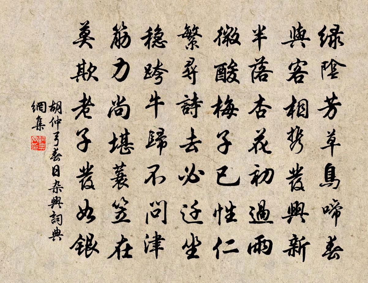 詩詞名句歷史字典書法欣賞書法字典國語詞典說文解字康熙字典古漢語字典標 題 作 者 詩 句 春日雜興作者:胡仲弓 朝代:宋代春日雜興原文綠陰芳草鳥啼春,與客相攜發興新。半落杏花初過雨,微酸梅子已性仁。繁尋詩去必遷坐,穩跨牛歸不問津。筋力尚堪蓑笠在,莫欺老子發如銀。詩詞問答問:春日雜興的作者是誰?答:胡仲弓問:春日雜興寫於哪個朝代?答:宋代胡仲弓春日雜興書法欣賞春日雜興書法作品詩詞推薦句劉承弼〔宋代〕境靜人亦寂,觴至壺自傾。歌頭李存勖〔唐代〕賞芳春,暖風飄箔。鶯啼綠樹,輕煙籠晚閣。杏桃紅,開繁萼。靈和殿,禁柳千行斜,金絲絡。夏雲多,奇峰如削和傅侍郎鹿鳴宴韻二首劉宰〔宋代〕向來北固萃群英,可但江山擅美名。秀氣中間空畚築,斯文今日遇權衡。歌成白雪傅新唱,帆飽西風趣去程。會體失調名周輝〔宋代〕捲簾試約東君,問花信風來第幾番。殉節詩一解方氏〔宋代〕昊天懵懵,四海洶洶,趙氏終衰,妖孽景從。蝶戀花 海岱樓玩月作米芾〔宋代〕千古漣漪晴絕地。海岱樓高,下瞰秦淮尾。水浸碧天天似水。廣寒宮闕人間世。靄靄春和生海市。鏊戴三山,頃刻晚立普明寺門,時已過立春,去除夕三日爾,楊萬里〔宋代〕蕭蕭淅淅荻花風,慘慘澹澹雲物容。欲雪不雪關得儂,得歸未歸一莞中。年華縱留春巳換,半生作客今何恨。夜來中秋夜坐連文鳳〔宋代〕寂寞無如此夜坐,西窗剪燭讀離騷。可鄰塵世多風雨,天柱峰頭月正高。落星寺王安石〔宋代〕崒雲台殿起崔嵬,萬里長江一酒杯。坐見山川吞日月,杳無車馬送塵埃。雁飛雲路聲低過,客近天門夢易回。勝概偈頌一百零二首釋慧遠〔宋代〕當年四月初八,老胡舊病再發。雲門遇水脫鞵,且莫隨佗孟八。九龍吐水沫金軀,七步周行總不如。稽首歸依乾屎送春鄧肅〔宋代〕宿雨初開萬翠屏,相攜雲水自由身。寸心未逐鶯花老,一笑能留天地春。儻得新詩同刻燭,不妨濁酒共傾銀。往來禪師貫休〔唐代〕擊鼓求亡益是非,木中生火更何為。吾師別是醍醐味,不是知心人不知。奉酬袁使君送陸灞卻回期道寺院皎然〔唐代〕欲別湖上客,暮期西林還。高歌風音表,放舟月色間。更人莫報夜,禪閣本無關。二十二日立秋夜行泊林皇港二首張耒〔宋代〕蕭蕭晚風起,孤舟愁思生。蓬窗一螢過,葦岸數蛩鳴。老大畏為客,風波難計程。家人夜深語,應念客猶征。假日山行釋正覺〔宋代〕平生胸中雲外峰,有閒便與扶瘦筇。但知一世丘壑味,想得十分猿鳥從。明見秋容山洗雨,清可人意風吟松。歸來如夢令劉辰翁〔宋代〕寂歷柳風斜倚。錯莫夢雲難記。花影為誰重,一握鮫人絲淚。何事。何事。歷歷臉潮羞起。午枕王安石〔宋代〕午枕花前簟欲流,日催紅影上簾鉤。窺人鳥喚悠揚夢,隔水山供宛轉愁。蝶戀花仲殊〔宋代〕北固山前波浪遠。鐵瓮城頭,畫角殘聲短。促酒濺金催小宴。燈搖蠟焰香風軟。落日煙霞晴滿眼。欲仗丹青,巧筆成都羅城北門石記佚名〔唐代〕五五復五五,五五逾重數。浮世若浮雲,金石一如故。與君相見時,杳杳非今土。八聲甘州朱雍〔宋代〕聽琤琤漏永,洗銀林、梅英半寒收。正蟾輝舒粉,雲容縷色,切近妝樓。人在東風佇立,悄悄獨凝眸。多少橫斜影名句推薦相思相見知何日?此時此夜難為情!李白《三五七言 / 秋風詞》 風雨淒淒,雞鳴喈喈。佚名《風雨》 害人之心不可有,防人之心不可無!佚名《增廣賢文·下集》 鏡水夜來秋月,如雪。溫庭筠《荷葉杯·鏡水夜來秋月》 旋開旋落旋成空,白髮多情人更惜。司空圖《酒泉子·買得杏花》 民惟邦本,本固邦寧。佚名《尚書·夏書·五子之歌》 欲知方寸,共有幾許清愁,芭蕉不展丁香結。賀鑄《石州引·薄雨初寒》 紅粉當壚弱柳垂,金花臘酒解酴醿。賈至《春思二首》 人道惡盈而好謙。佚名《易傳·彖傳上·謙》 一雙冷眼看世人,滿腔熱血酬知己。袁枚《隨園詩話·卷十六》