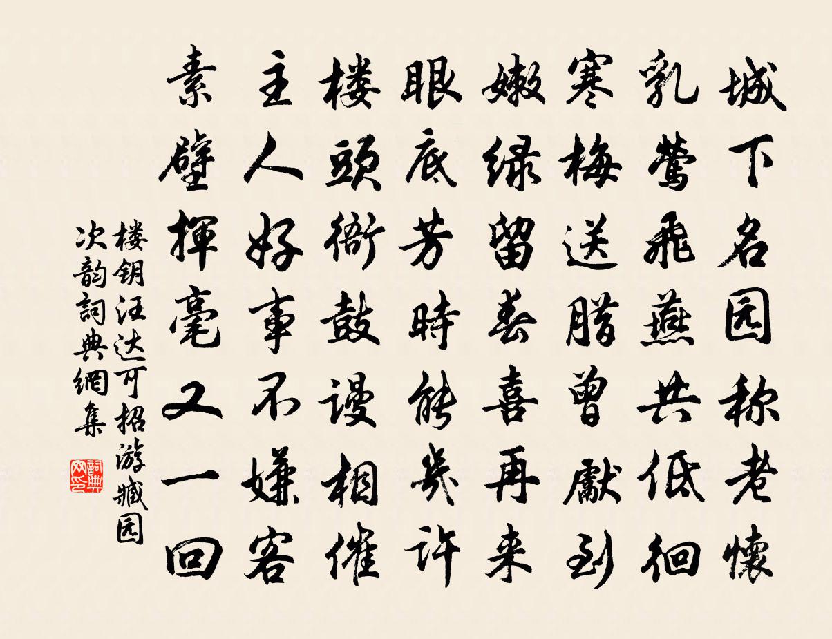 詩詞名句歷史字典書法欣賞書法字典國語詞典說文解字康熙字典古漢語字典標 題 作 者 詩 句 汪達可招游臧園次韻作者:樓鑰 朝代:宋代汪達可招游臧園次韻原文城下名園稱老懷,乳鶯飛燕共低徊。寒梅送臘曾先到,嫩綠留春喜再來。眼底芳時能幾許,樓頭衙鼓謾相催。主人好事不嫌客,素壁揮毫又一回。詩詞問答問:汪達可招游臧園次韻的作者是誰?答:樓鑰問:汪達可招游臧園次韻寫於哪個朝代?答:宋代樓鑰汪達可招游臧園次韻書法欣賞汪達可招游臧園次韻書法作品詩詞推薦求酒於鄰袁說友〔宋代〕太息官寒獨養疴,浮生半作病維摩。新涼欲學東城醉,亡奈維罍已恥何。天上碧桃陳普〔宋代〕春階蕩漾春日長,羽林颯颯勾陳蒼。鈞天寥寥帝不康,一月震悚奔勾芒。夜鳩眾功和陰陽,粉白黛緣各一方。鑄作鵲橋仙 壽詞蕭〔元代〕萬金寶劑,三山仙島。□祝康寧壽考。似君全福幾人能,真不是、天公草草。彩衣膝下,仙歌雲杪。莫厭金荷□倒還都口號詩鮑照〔南北朝〕分壤蕃帝華。列正藹皇宮。禮燕及年暇。朝奏因歲通。維舟歇金景。結棹俟昌風。鉦歌首寒物。歸吹踐開冬。陰沉立春日細雨王禹偁〔宋代〕澹於寒霧亂於絲,無點無聲落不知。輕助雪痕歸麥壠,暗隨春氣入梅枝。踏苔立久微沾屐,遶竹吟余漸著髭。翻憶百字令(壽陳靜山,少吾一歲)劉辰翁〔宋代〕洞房停燭,似新歲,數到上元時節。一盞屠蘇千歲酒,添得新人羅列。昨日迎長,今朝獻壽,嘗團團佳月。永和春晚次樂鄉縣陳子昂〔唐代〕故鄉杳無際,日暮且孤征。川原迷舊國,道路入邊城。野戍荒煙斷,深山古木平。如何此時恨,噭噭夜猿鳴。詠雲馮坦〔宋代〕山腰一抹雲,雲起知何處。爭渡小橋尋,天風又吹去。平沙落雁趙蕃〔宋代〕叢叢水邊蘆,雁雁灘頭泊。我不解丹青,小詩亦可貌。秋夜憶兄釋文珦〔宋代〕石房清睡熟,猶擁黑貂裘。鄉遠難為夢,山深易得秋。脊令空在詠,蟋蟀暗生愁。何日潛溪岸,吟詩共倚樓。短謠王令〔宋代〕窗中燈冷暉重綠,窗前西風葉相逐。曉霜披瓦月上軒,枕夢不成雁聲續。拂衣起步行繞壁,萬慮無成淚沾臆。鐵房發池潭至盧溝河洪皓〔宋代〕燕山除館俯池潭,逾月羈孤苦吏貪。遙望盧河一舍阻,著鞭信宿次關南。憶淵明二首馮時行〔宋代〕晨策東籬路,煌煌寒菊英。我豈無他人,底事憶淵明。忘言會諸理,掃盡世俗情。悠然見南山,此意誰與評。代書答姜七崔九張說〔唐代〕婀娜金閨樹,離披野田草。雖殊兩地榮,幸共三春好。花殊鳥飛處,葉鏤蟲行道。真心獨感人,惆悵令人老。池上幽境白居易〔唐代〕裊裊過水橋,微微入林路。幽境深誰知,老身閒獨步。行行何所愛,遇物自成趣。平滑青盤石,低密綠陰樹。石上上馮使君渡水僧障子貫休〔唐代〕跣足拄巴藤,潺湲渡幾曾。盡權無著印,不是等閒僧。熊耳應初到,牛頭始去登。畫來偏覺好,將寄柳吳興。贈丘員外二首韋應物〔唐代〕高詞宮棄浮靡,宮貞行表鄉閭。未真南宮拜,聊偃東山居。大藩本多事,日與宮疏。每一睹之子,高詠遂起予。宵習馬長楊詩樓鑰〔宋代〕強漢承平後,兢兢武不忘。整師臨五柞,習馬向長楊。冀野來騏驥,天閒出驌驦。驤騰射熊館,馳驟華山陽。輦路聞蟋蟀有感蒲壽宬〔宋代〕煎煎促誰織,機杼咽空林。何處露藂下,入人秋思深。清燈一線淚,孤枕百年心。此意知誰會,悠然太古音。荷花宋祁〔宋代〕晚雨跳珠萬蓋勻,紅房高下照池新。采時雙艇須加槳,行罷微波不見塵。解把清香貽密坐,忍將芳意付蕭晨。如何名句推薦戰士軍前半死生,美人帳下猶歌舞。高適《燕歌行》 無言暗將紅淚彈闌珊,香銷輕夢還納蘭性德《河傳·春淺》 郎騎竹馬來,繞床弄青梅。李白《長干行二首》 干將為利,名聞天下,匠以治木,不如斤斧。劉向《說苑·雜言》 有孫母未去,出入無完裙。杜甫《石壕吏》 晨興好擁向陽坐,晚出宜披踏雪行。白居易《新制綾襖成感而有詠》 屈子冤魂終古在,楚鄉遺俗至今留。邊貢《午日觀競渡》 落花人獨立,微雨燕雙飛。晏幾道《臨江仙·夢後樓台高鎖》 詩家清景在新春,綠柳才黃半未勻。楊巨源《城東早春》 醉翁之意不在酒,在乎山水之間也。歐陽修《醉翁亭記》