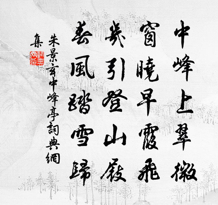 詩詞名句歷史字典書法欣賞書法字典國語詞典說文解字康熙字典古漢語字典標 題 作 者 詩 句 中峰亭作者:朱景玄 朝代:唐代中峰亭原文中峰上翠微,窗曉早霞飛。幾引登山屐,春風踏雪歸。詩詞問答問:中峰亭的作者是誰?答:朱景玄問:中峰亭寫於哪個朝代?答:唐代朱景玄中峰亭書法欣賞中峰亭書法作品注釋全唐詩:卷547-7詩詞推薦次韻蘇教授飯鄭教授五首項安世〔宋代〕嘆息吾家老鄭君,三年孤鶴困雞群。天教此地蘇司業,與對當時鄭廣文。挽知錄李元老二首陳棣〔宋代〕德齒追前輩,聲華擅雋游。心期師孔孟,文欲比曹劉。丹桂枝高折, * 未周。日駒偷過隙,夜壑漫藏舟。野翁亭錢時〔宋代〕不住清溪不住山,野翁來信兩翁間。非絲非竹雖雲樂,樂在溪山未是閒。鷓鴣天納蘭性德〔清代〕背立盈盈故作羞手挪梅蕊打肩頭欲將離恨尋郎說待得郎歸恨卻休雲澹澹,水悠悠一聲橫笛鎖空樓何時共泛春溪月斷春晚危昭德〔宋代〕晴天楊柳絲千緒,淡月梨花玉一庭。又是東風去時節,數聲啼鳥不堪聽。秋早王安石〔宋代〕暮尋蔡墩西,獨覺秋尚早。山路葩卉繁,野田風日好。禪林烏未泊,經屋塵初掃。蠻藤五花簟,復足休吾老。九日杜甫〔唐代〕去年登高郪縣北,今日重在涪江濱。苦遭白髮不相放,羞見黃花無數新。世亂鬱郁久為客,路難悠悠常傍人。酒闌偈頌二百零五首釋正覺〔宋代〕玉壺著腳四圍寬,妙處其中轉側看。顧鑒功忘鼻孔直,津流識盡髑髏乾。夜橫河漢白,霜洗鬥牛寒。休去歇去,絕和人陳善〔宋代〕鮫綃巧織在深泉,不與人間機杼聯。要知妙在筆墨外,第一莫為醒者傳。唐太宗吞蝗吳兢〔唐代〕貞觀二年,京師旱,蝗蟲大起。太宗入苑視禾,見蝗蟲,掇數枚而曰:“人以谷為命,而汝食之,是害於百姓。百愛妾換馬(後首一作陳標詩)張祜〔唐代〕一面妖桃千里蹄,嬌姿駿骨價應齊。乍牽玉勒辭金棧,催整花鈿出繡閨。去日豈無沾袂泣,歸時還有頓銜嘶。嬋娟招圖機吃槐葉冷淘晁說之〔宋代〕庭前枯樹庾郎老,馬首垂花太祝愁。槐葉冷淘來急吃,君家醪瓮卻須休。題時遁澤畫卷十首王柏〔宋代〕一壑雲屏展,江橫萬里長。漁舟下灘去,寂寞舞斜陽。轉秩奉詞蒙朝佐子靜慶以四六戲裁長句為謝劉子翬〔宋代〕一嶺無情阻面談,鳴翰忽墮得雙函。抽黃對白雖雲妙,刻朽噓枯祗益慚。小轉只緣官帶右,雄飛無復夢圖南。借留提舉中奉程公輓詩蔡戡〔宋代〕靜退身無累,安閒意有餘。一麾真漫爾,三徑盍歸與。肯酌貪泉水,甘乘下澤車。後生知敬慕,遺行藹鄉閭。簡徐季益二首趙蕃〔宋代〕好士今誰是,憐才亦漫雲。詎須隨進士,直似慕徵君。確論終當有,浮言斷莫聞。兒曹與餘子,錄錄更紛紛。初春吏隱堂作韓維〔宋代〕微風稍破凍,芳萌亦吐林。百鳥感春陽,鉤輈弄其音。振策遵城曲,逍遙寫煩襟。愛此堂下石,青潤挺琅琳。中坳寄題袁機仲侍郎殿撰建溪北山四景冰壺閣楊萬里〔宋代〕竹國風世界,梅兄雪友朋。地清無可比,且道玉壺冰。扇子詩李石〔宋代〕誰將弱水隔蓬萊,對酒思君眼倦開。醉夢只堪逢故舊,五更酒醒卻歸來。詠史詩函谷關胡曾〔唐代〕寂寂函關鎖未開,田文車馬出秦來。朱門不養三千客,誰為雞鳴得放回?名句推薦今年對花最匆匆,相逢似有恨,依依愁悴。周邦彥《花犯·小石梅花》 木蘭舟上珠簾卷,歌聲遠,椰子酒傾鸚鵡盞。李珣《南鄉子·山果熟》 青春花姊不同時。淒涼生較遲。吳文英《醉桃源·芙蓉》 君子求諸己,小人求諸人。孔子弟子《論語·衛靈公篇》 不識廬山真面目,只緣身在此山中。蘇軾《題西林壁》 霸業成空,遺恨無窮。查德卿《蟾宮曲·懷古》 西風多少恨,吹不散眉彎。納蘭性德《臨江仙·寒柳》 東風不為吹愁去,春日偏能惹恨長。賈至《春思二首·其一》 馬行無力皆因瘦,人不風流只為貧。佚名《增廣賢文·上集》 香餌之下,必有懸魚;重賞之下,必有死夫。黃石公《三略·上略》
