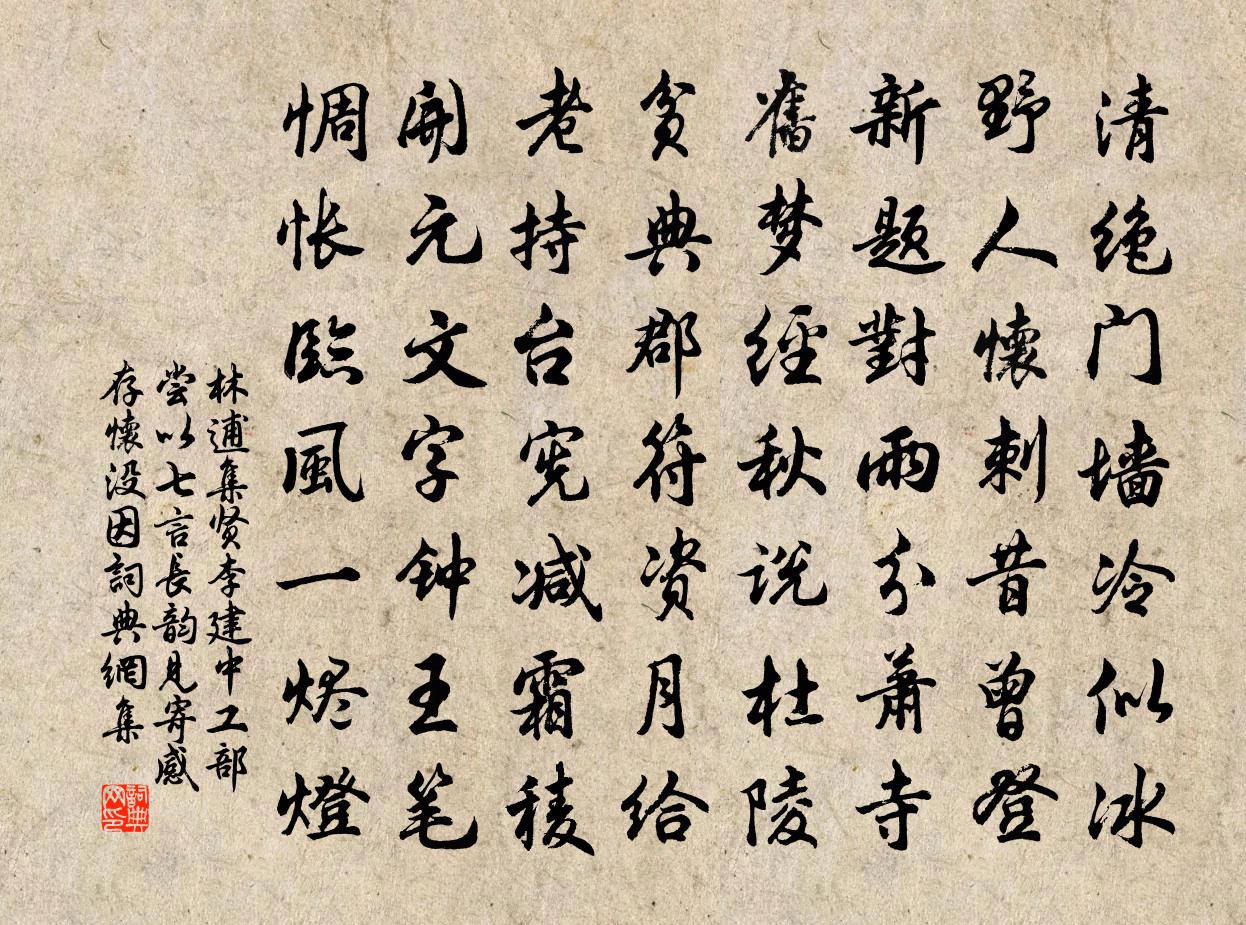 詩詞名句歷史字典書法欣賞書法字典國語詞典說文解字康熙字典古漢語字典標 題 作 者 詩 句 集賢李建中工部嘗以七言長韻見寄感存懷沒因作者:林逋 朝代:宋代原文清絕門牆冷似冰,野人懷刺昔曾登。新題對雨分蕭寺,舊夢經秋說杜陵。貧典郡符資月給,老持台憲減霜稜。開元文字鐘王筆,惆悵臨風一燼燈。詩詞問答問:《集賢李建中工部嘗以七言長韻見寄感存懷沒因》的作者是誰?答:林逋問:該詩寫於哪個朝代?答:宋代書法欣賞集賢李建中工部嘗以七言長韻見寄感存懷沒因書法作品詩文賞析【原題】:集賢李建中工部嘗以七言長韻見寄感存懷沒因用追和詩詞推薦緣識宋太宗〔宋代〕救物功深好自持,知之修煉善心為。神仙豈謂人間惜,自是迷流識見卑。夜觀汝溪二侄象棋四首錢時〔宋代〕覆雨翻雲著一爭,分明死地要求生。如何自有轉身路,苦向人間險處行。贈比部蕭郎中十兄(甫從姑子也)杜甫〔唐代〕有美生人傑,由來積德門。漢朝丞相系,梁日帝王孫。蘊藉為郎久,魁梧秉哲尊。詞華傾後輩,風雅藹孤鶱。宅相寄吳山人釋法輝〔宋代〕夜召山翁酌,花間聊撫琴。酒香來竹外,古意入雲深。月色臨諸水,溪光射遠岑。擬教塵土客,對此滌煩襟。搗練子王哲〔元代〕搗練子,十怎生。閒來閒去好修行。*哩,哩*。若逢迎,得圓成。從頭一一說前程。*哩,哩*。逍遙詠宋太宗〔宋代〕靈元物象向天涯,古往今來聖事夸。無礙智通精進心,研窮理路互交加。次漕庾兩使者絕句韻六首劉克莊〔宋代〕古來一哄立之平,朱魏當年互講明。遺□□□□□約,面含菜色腹雷聲。再次前韻三首陳造〔宋代〕連夜愁陰苦戒嚴,雪將寒雨鬧廉纖。老人凍餓人情斷,米價何如酒價添。福昌秋日效張文昌二首張耒〔宋代〕黃葉蕭蕭秋水清,田中日午村雞鳴。場邊九月禾黍熟,空原雉飛飽新谷。棗籬蟲鳴村路曲,道邊古墳生野菊。人稀喜雪十韻孔武仲〔宋代〕此夜不成雪,朋朝應作霖。細聲來戶牖,爽氣入裯衾。窺隙疑相射,循檐覺更深。因風成倒陣,過竹有餘音。畫閣道山風雨項安世〔宋代〕年華澹灩滿皇州,時節淒涼限勝游。雨後石渠新水長,風前芸閣晚香愁。不堪高點梅花老,強倚千絲柳帶柔。又是偈頌一百零二首釋紹曇〔宋代〕十二峰前塊石頭,雨洗風磨淨無梁。苔衣剝落耿光寒,因甚諸不覷不見。{左虎右見}得見,丈六金身,時時出現悲秋白玉蟾〔宋代〕庭臯一葉夜來秋,拍塞乾坤爽氣浮。有客放船芳草渡,何人吹笛夕陽樓。鱸魚蓴菜季鷹興,鴻雁蘆花宋玉愁。碧水寄南浦謫官鄭谷〔唐代〕多才翻得罪,天末抱窮憂。白首為遷客,青山繞萬州。醉欹梅障曉,歌厭竹枝秋。望闕懷鄉淚,荊江水共流。放船和子遠韻王之道〔宋代〕冬溫寒日好,歲晚早梅開。帆腳隨風轉,江流與岸回。坐憐青嶂遠,靜見白鷗來。水驛三千里,斯游亦壯哉。偈頌二百零五首釋正覺〔宋代〕九重尊貴位中人,燦燦星圖拱北辰。活計四時調玉燭,家風萬世運金輪。區分群象布淳化,囊括二儀懷至仁。算數江城子·浣花溪上見卿卿張泌〔五代〕浣花溪上見卿卿,眼波明,黛眉輕。綠雲高綰,金簇小蜻蜓。好是問他:“來得么?”和笑道:“莫多情。”艤舟南渡有懷釋寶曇〔宋代〕待得潮生已夕陽,藥爐無火正淒涼。傍人笑指黃金骨,夜半應須解放光。送趙提乾葉適〔宋代〕與君中外情偏厚,嗟我龍鍾志已摧。豈有尋常墮泥滓,不教宛轉助負雷。花枝買笑前村趁,柳帶牽情別浦催。細雨秋感陸游〔宋代〕畏塗歷盡百年中,老臥窮閻一禿翁,衣杵淒涼常帶月,井桐零落不禁風。空文久悔雕蟲技,大學方施習射功。萬一名句推薦脫鞍暫入酒家壚,送君萬里西擊胡岑參《送李副使赴磧西官軍》 長江萬里東注,曉吹卷驚濤。吳潛《水調歌頭·焦山》 凡兵之道四:曰陣,曰勢,曰變,曰權。察此四者,所以破強敵,取猛將也。孫臏《孫臏兵法·勢備》 故園渺何處,歸思方悠哉。韋應物《聞雁》 釀泉為酒,泉香而酒洌;歐陽修《醉翁亭記》 槲葉落山路,枳花明驛牆。溫庭筠《商山早行》 不興其藝,不能樂學。戴聖《禮記·學記》 馬上離魂衣上淚,各自個、供憔悴程垓《酷相思·月掛霜林寒欲墜》 曉寒料峭尚欺人,春態苗條先到柳。毛滂《玉樓春·己卯歲元日》 紅日淡,綠煙晴。流鶯三兩聲。晏幾道《更漏子·柳絲長》